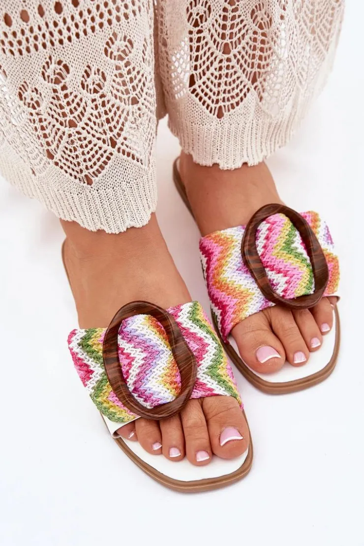 Klapki damskie z eko skóry na płaskim obcasie to stylowa i wygodna opcja na co dzień. Model ten wyróżnia się paskiem z plecionką, który nadaje im subtelnego uroku, oraz ozdobną klamrą, która przyciąga wzrok. Idealne do letnich stylizacji! Przy wyborze rozmiaru prosimy sugerować się tabelą rozmiarów.