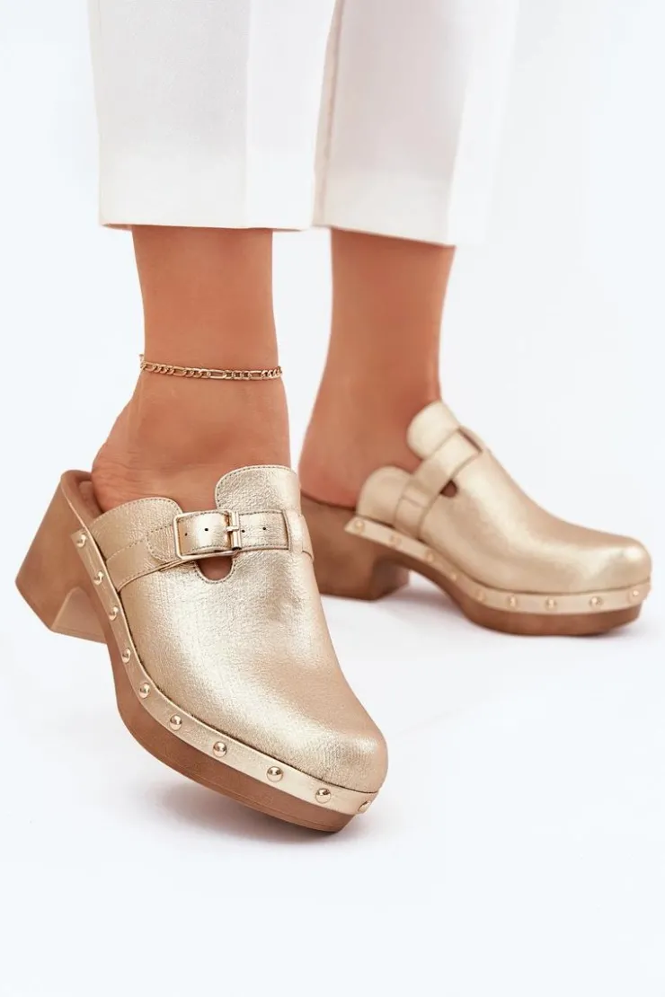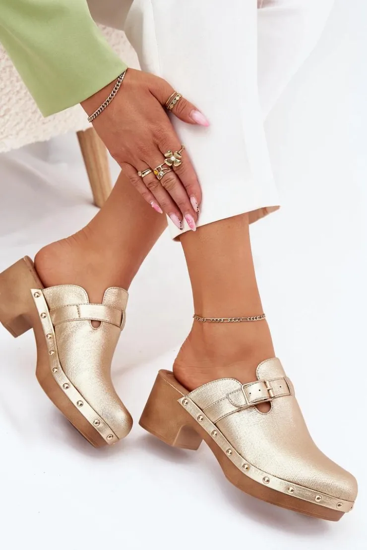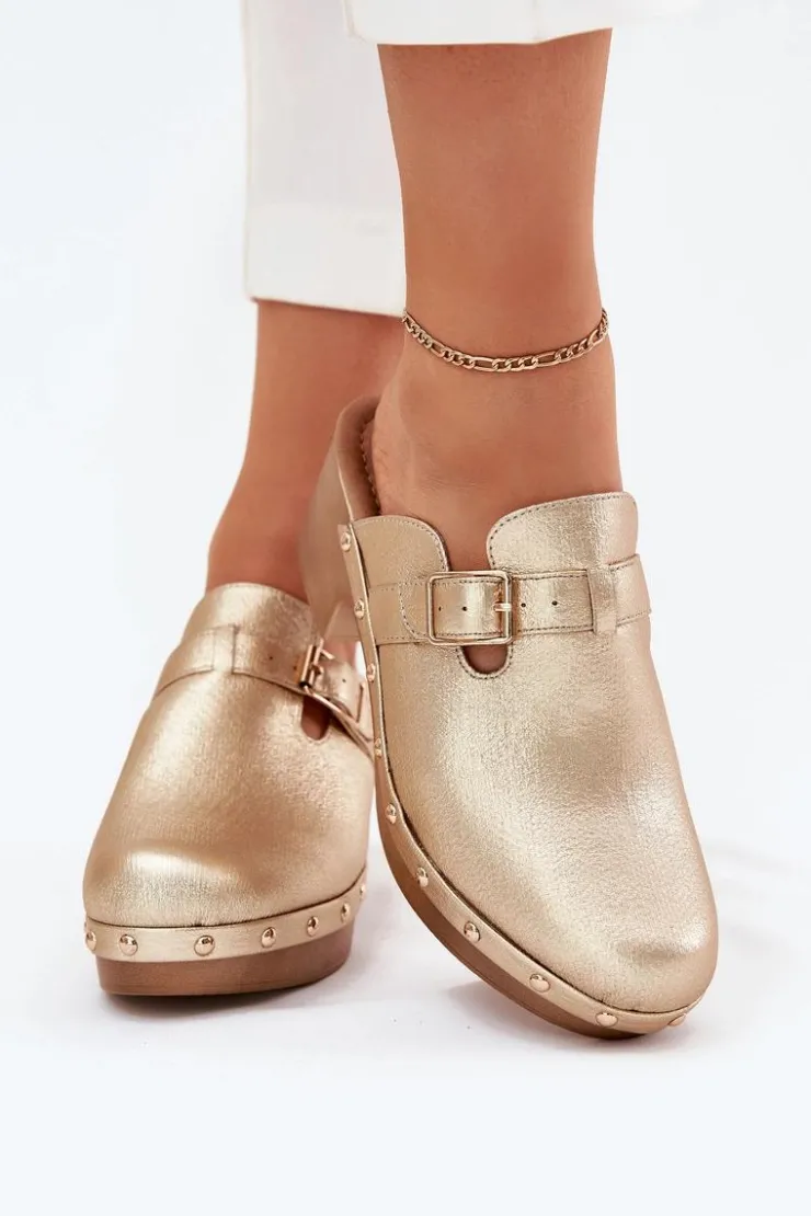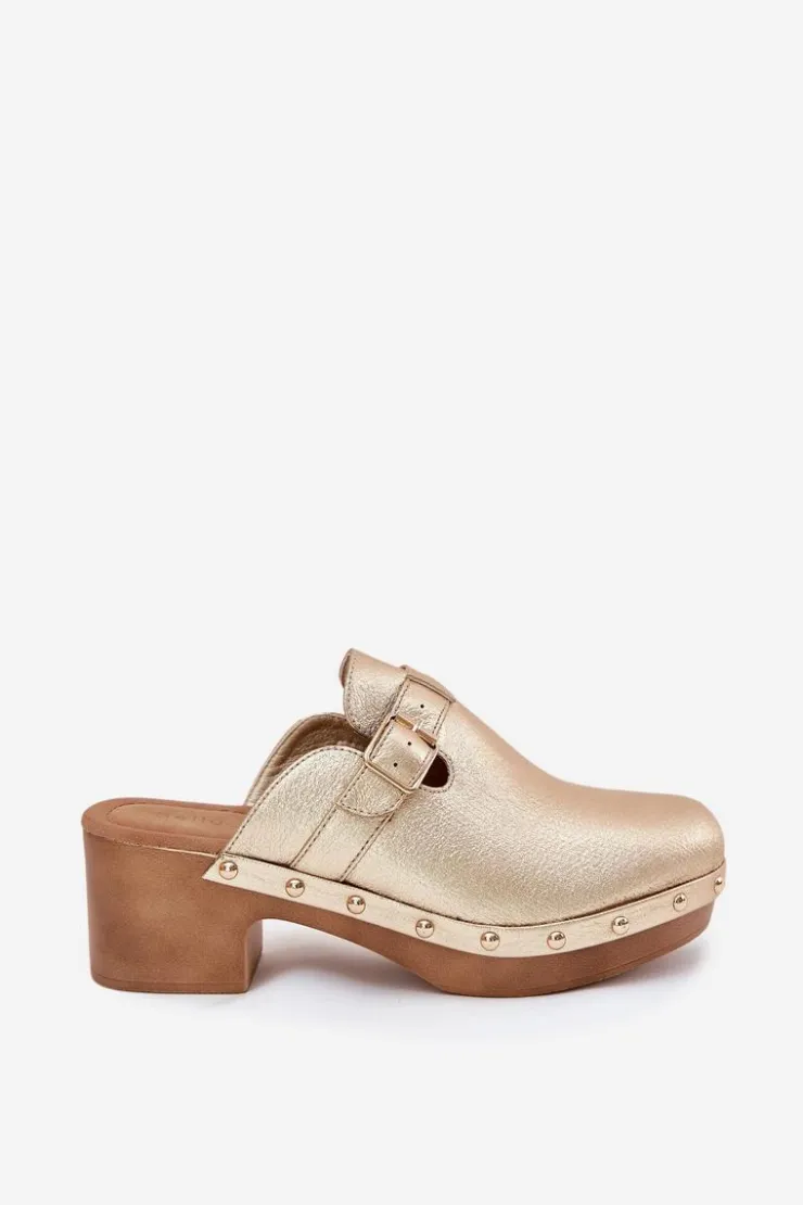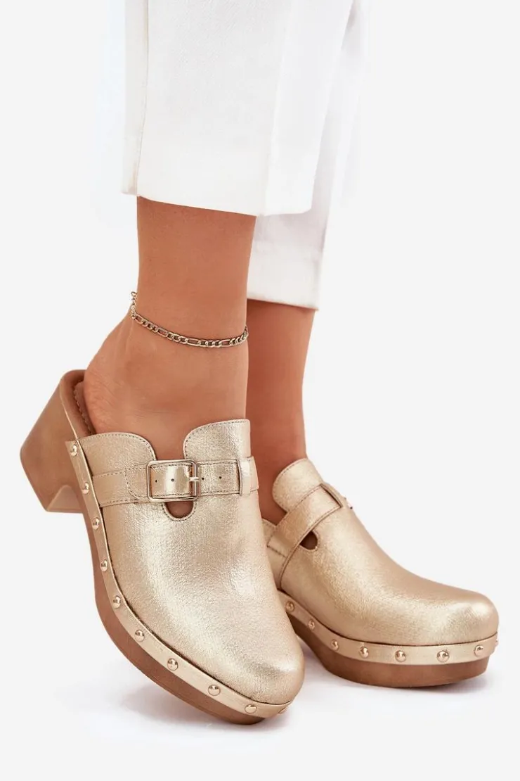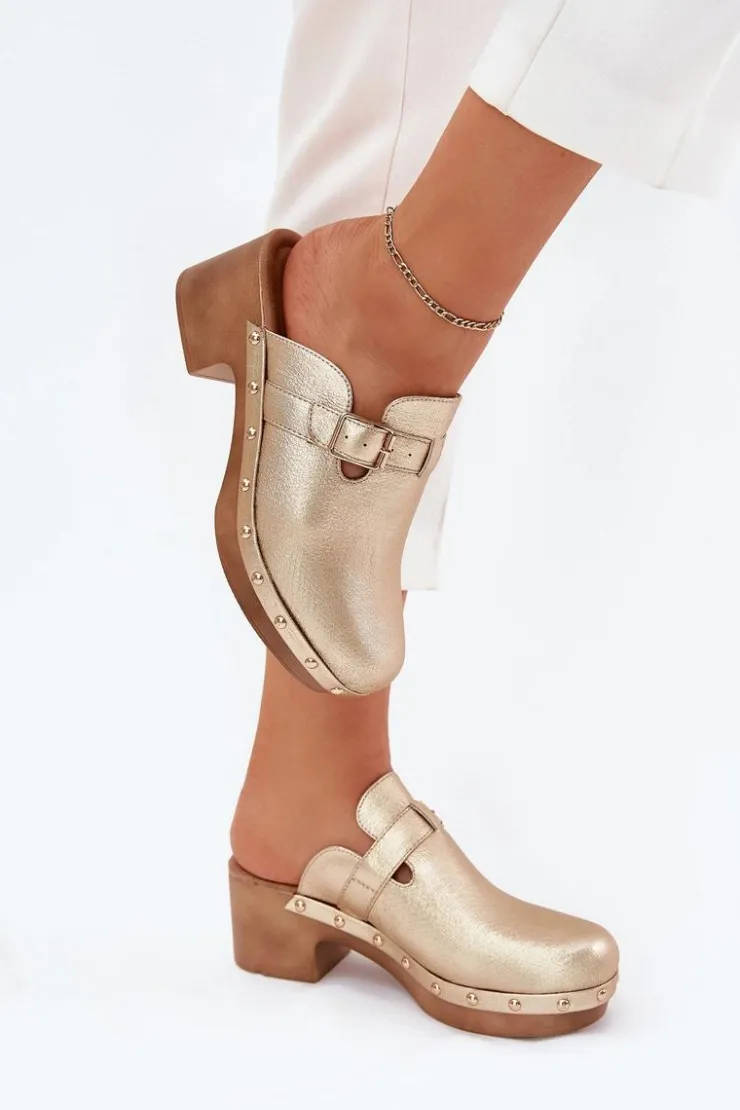Klapki chodaki damskie wykonane z eko skóry. Osadzone na obcasie w formie klocka. Pasek ze złotą klamrą dodaje im subtelnej elegancji, a ćwieki przy podeszwie wprowadzają odrobinę rockowego charakteru. Miękka wkładka zapewnia komfort przez cały dzień, czyniąc je idealnym wyborem do codziennych stylizacji.Przy wyborze rozmiaru prosimy sugerować się tabelą rozmiarów.
