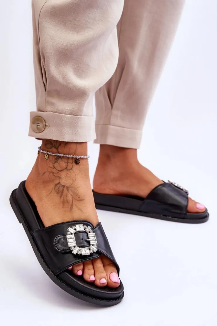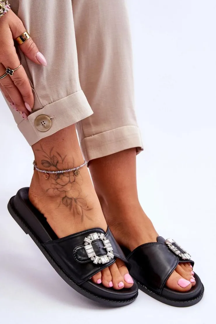 Klapki damskie zostały wykonane z eko skóry. Model ten posiada pasek zapinany na sprzączkę, który można regulować. Ozdobna klamra dodaje elegancji. Klapki są idealne na letnie spacery oraz codzienne wyjścia na zakupy. Wkładka wraz z podeszwą zostały wykonane z tworzywa sztucznego. Przy wyborze rozmiaru prosimy sugerować się tabelą rozmiarów.