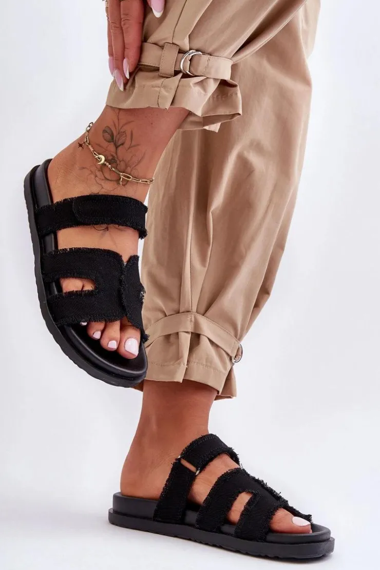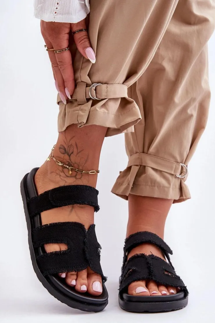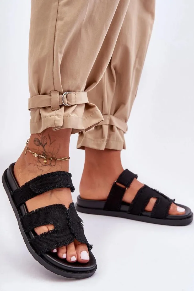 Klasyczne klapki damskie zostały wykonane z materiału tekstylnego. Model ten posiada dodatkowe zapięcie na rzep, dzięki któremu można dopasować obuwie do tęgości nogi. Buty te osadzono na platformie z tworzywa sztucznego. Klapki świetnie sprawdzą się na co dzień w upalne dni! Przy wyborze rozmiaru prosimy sugerować się tabelą rozmiarów.