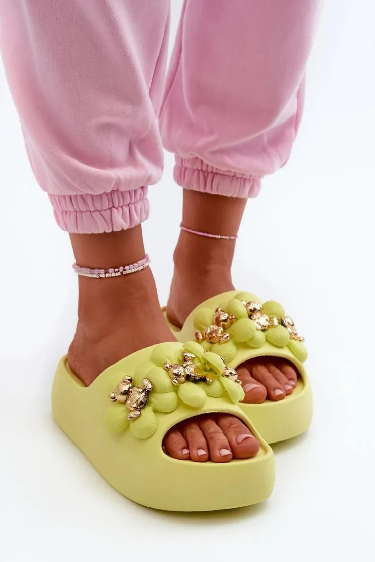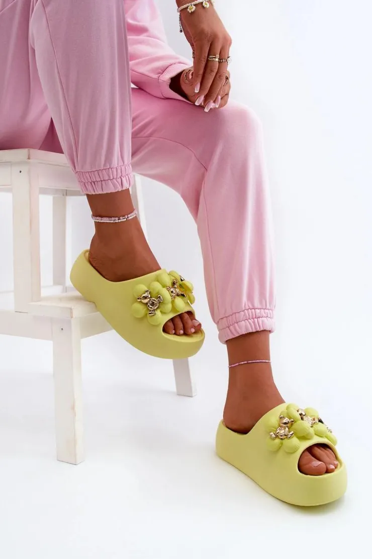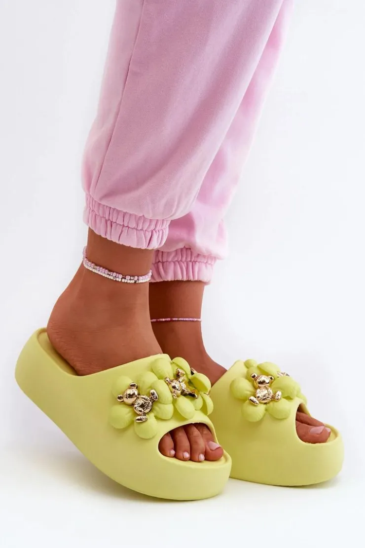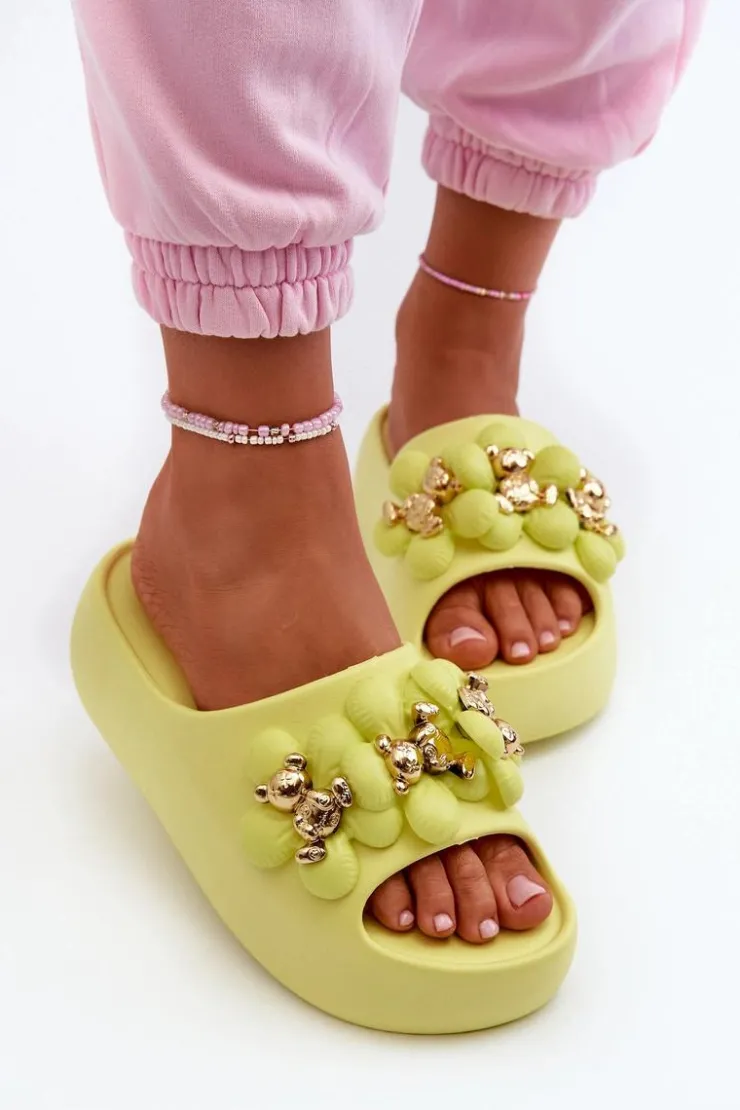 Lekkie damskie klapki wykonane z piankowego tworzywa, idealne na upalne dni. Osadzone na masywnej podeszwie, te klapki zapewniają wygodę i stabilność. Urocze ozdoby dodają im wyjątkowego charakteru, czyniąc je doskonałym wyborem na lato. Przy wyborze rozmiaru prosimy sugerować się tabelą rozmiarów.