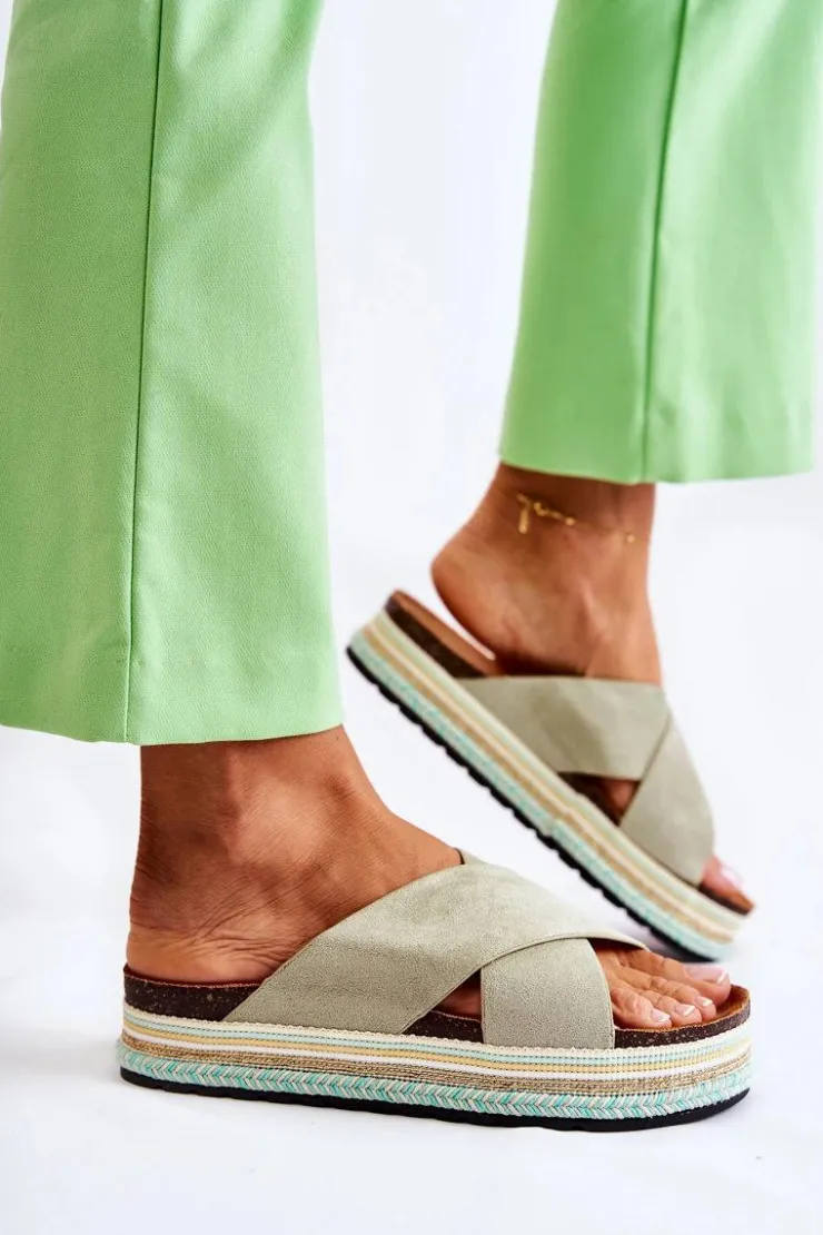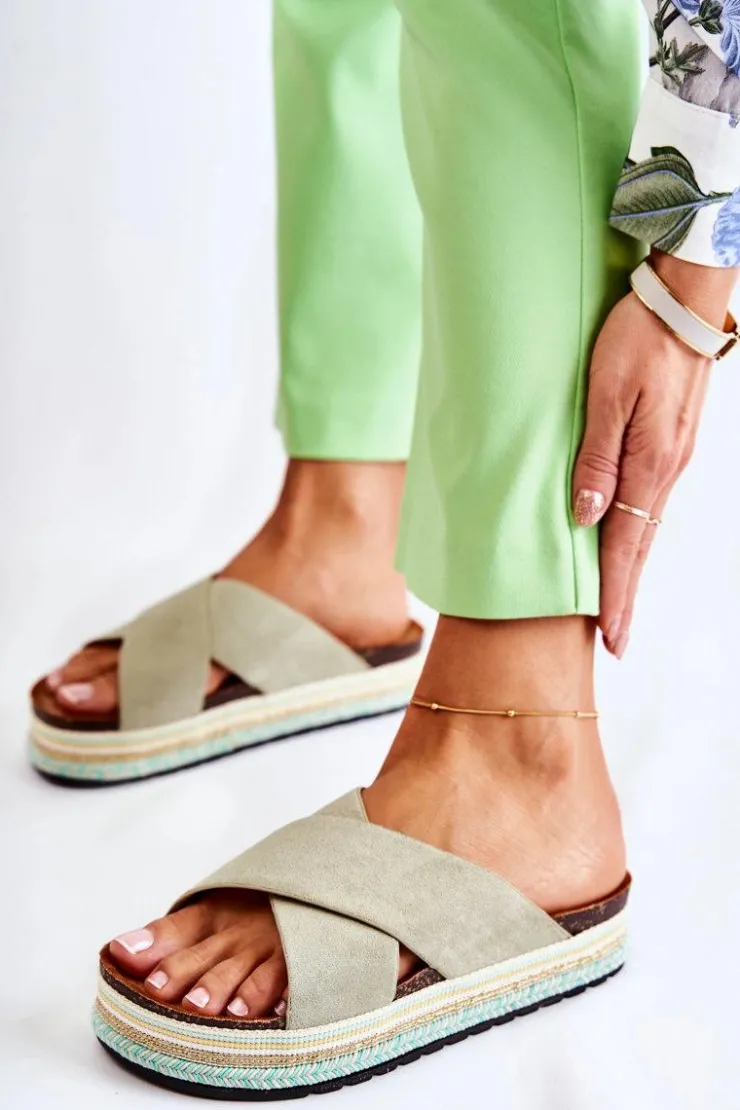 Klasyczne klapki damskie zostały wykonane z eko zamszu. Paski klapek krzyżują się na przodzie. Wkładka jest wykonana z eko zamszu. Klapki osadzone na platformie ozdobionej warkoczem z tkaniny i elementami z tworzywa sztucznego. Model z odkrytym noskiem. Profilowana wkładka zapewni wygodę podczas użytkowania. Koniecznie sprawdź pozostałe modele damskich klapek! Przy wyborze rozmiaru prosimy sugerować się tabelą rozmiarów.