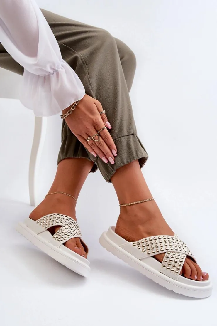 Klasyczne klapki damskie na platformie są idealnym wyborem na lato. Z przodu przeplatające się paski zdobione ćwiekami, co dodaje im nuty stylu i oryginalności. Dzięki platformie zapewniają dodatkową wygodę podczas chodzenia, a ich uniwersalny design sprawia, że doskonale komponują się z letnimi stylizacjami! Przy wyborze rozmiaru prosimy sugerować się tabelą rozmiarów.