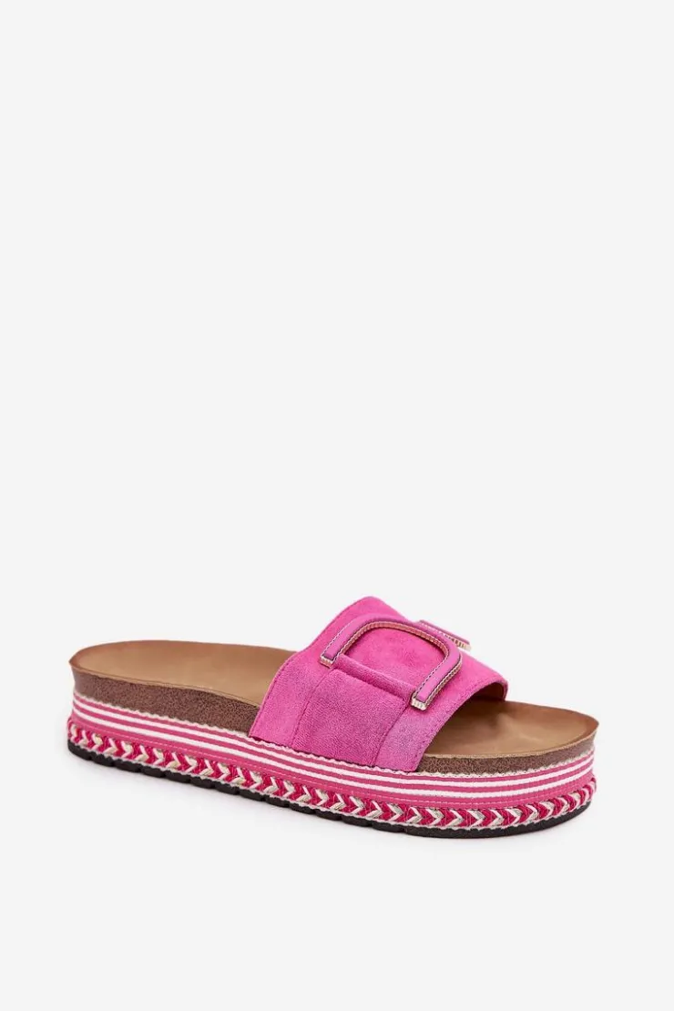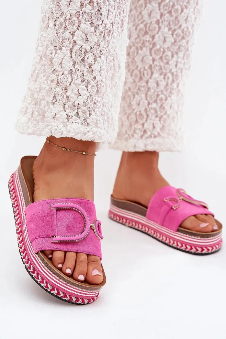 Klapki damskie wykonane z eko zamszu, osadzone na masywnej platformie, łączą wygodę z modnym wyglądem. Z przodu na pasku znajduje się ozdobny element, który dodaje im unikalnego charakteru. Profilowana wkładka zapewnia komfort przez cały dzień, sprawiając, że klapki są doskonałe do letnich stylizacji. Przy wyborze rozmiaru prosimy sugerować się tabelą rozmiarów.