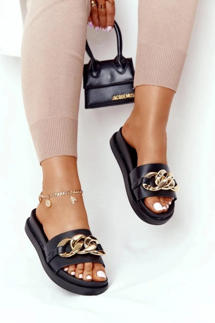 Wygodne klapki na platformie ozdobione modnym łańcuchem w kolorze złotym. Klapki to świetna propozycja dla kobiet ceniących sobie komfort w letnie dni! Cholewka wykonana jest z eko skóry. Koniecznie sprawdź całą naszą kolekcje klapek damskich! Przy wyborze rozmiaru prosimy sugerować się tabelą rozmiarów.