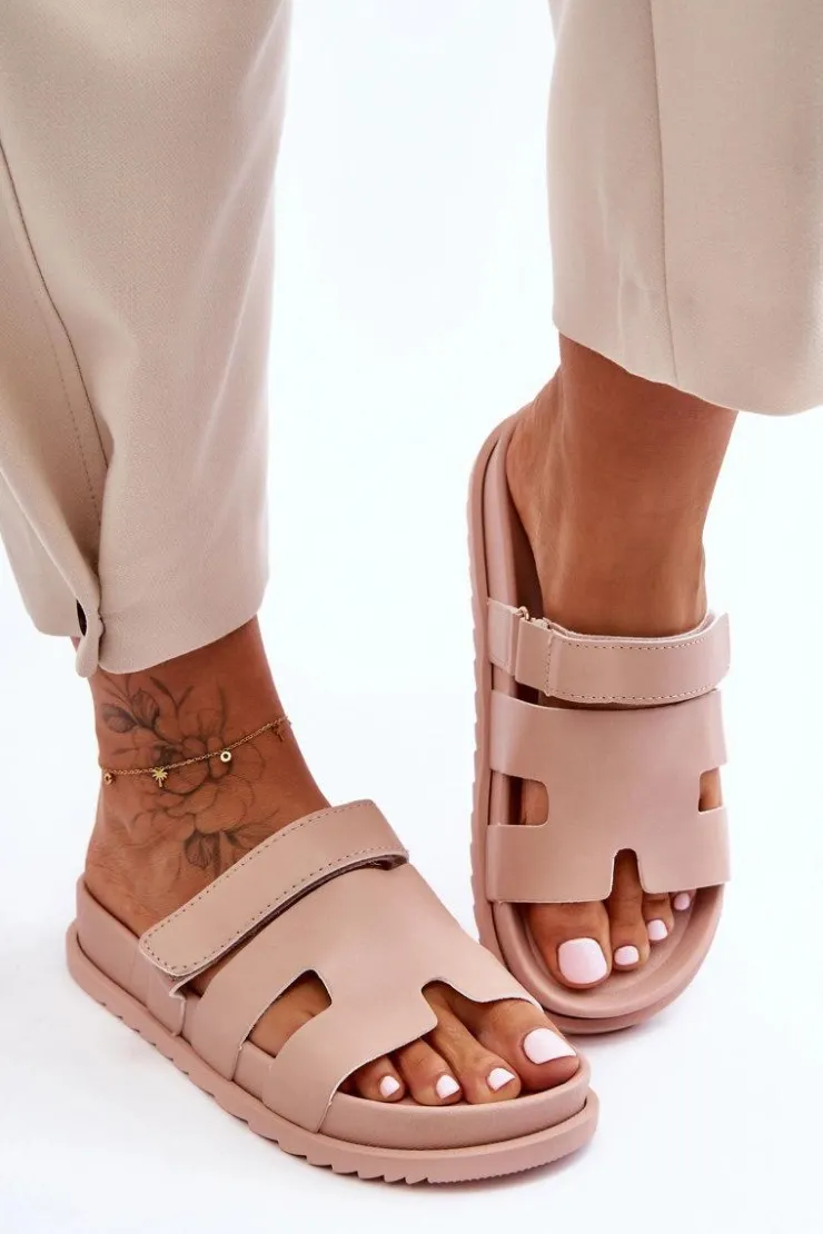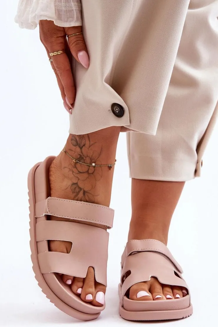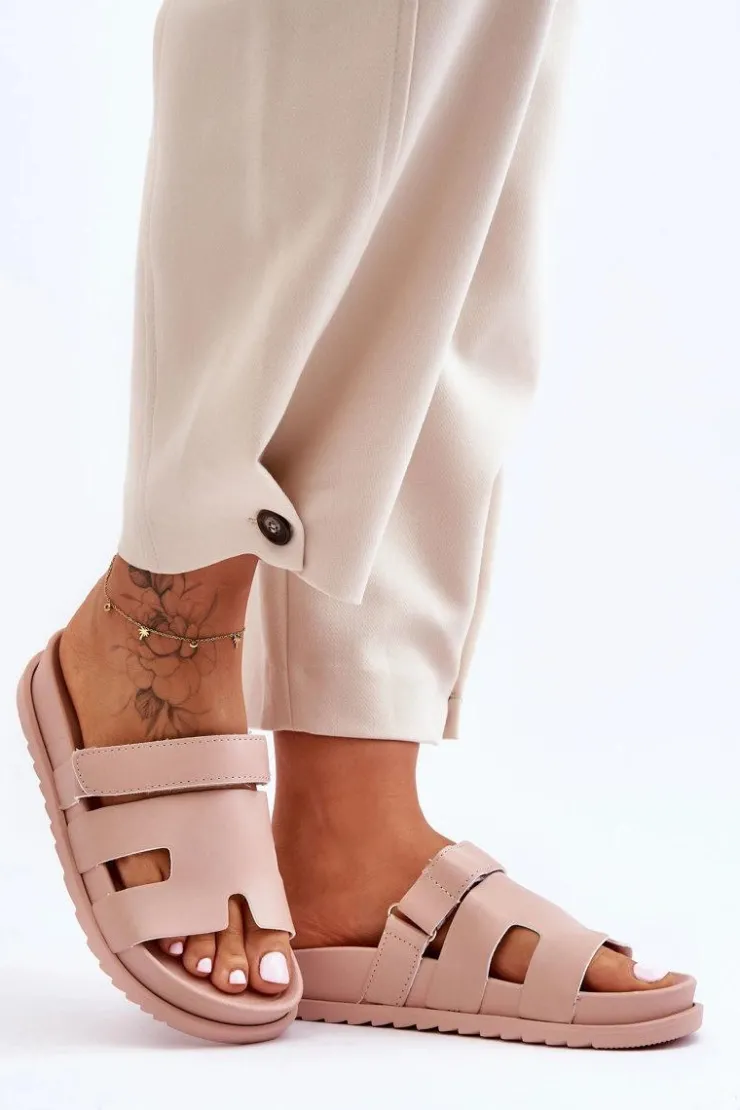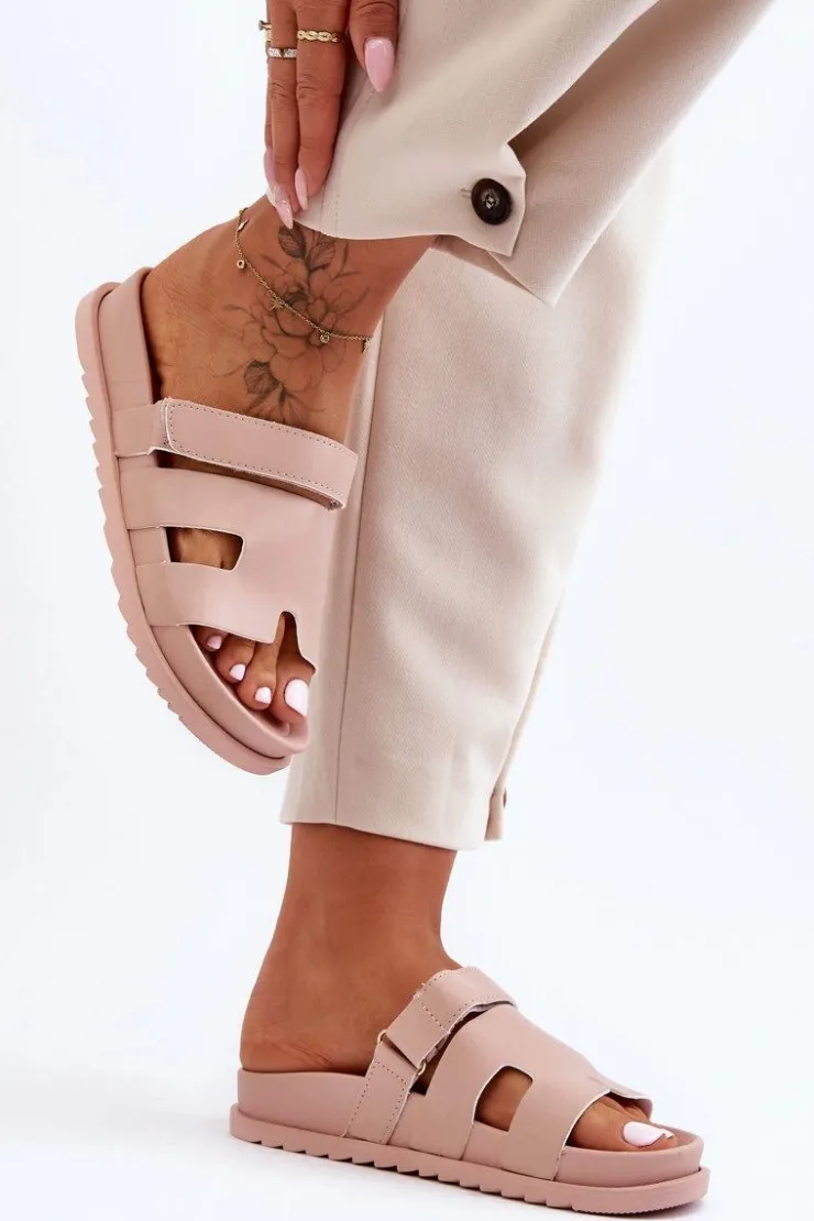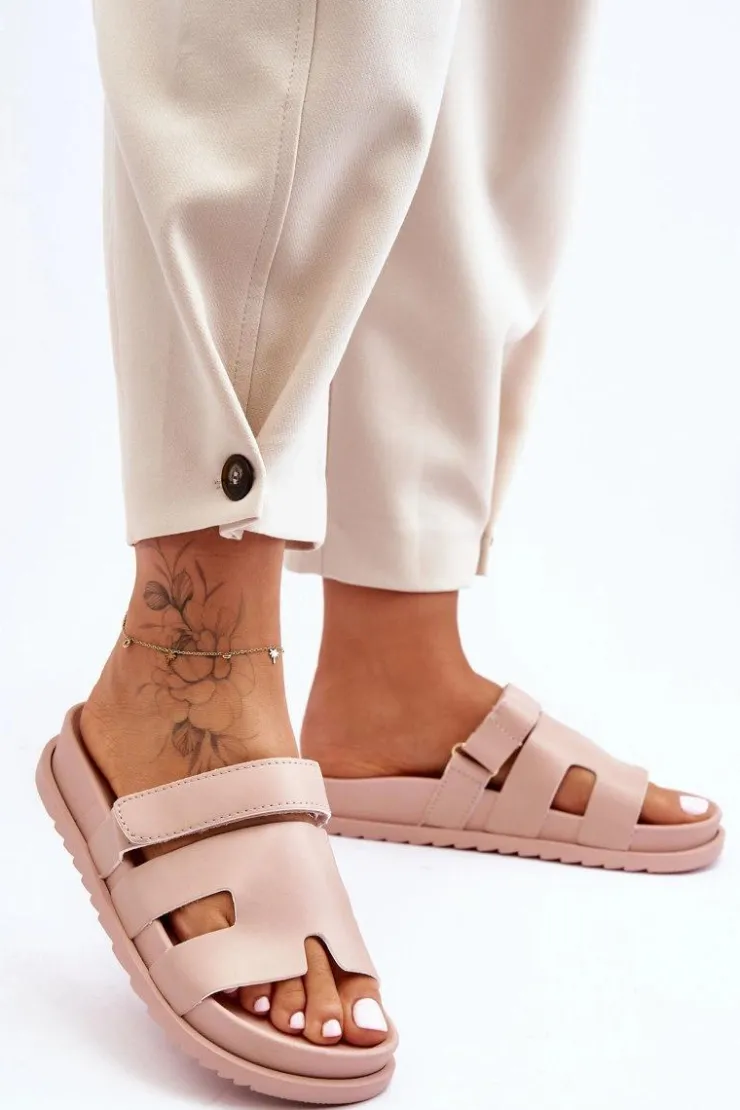 Klasyczne klapki damskie na lekkiej platformie zostały wzbogacone zapięciem na rzep, dzięki któremu obuwie można dopasować do tęgości nogi. Dobrze wyprofilowana wkładka zapewni komfort podczas użytkowania. Klapki te o ciekawym fasonie z pewnością sprawdzą się w wielu stylizacjach! Zostały wykonane z eko skóry. Przy wyborze rozmiaru prosimy sugerować się tabelą rozmiarów.