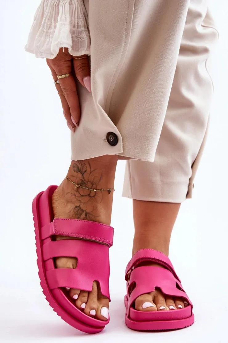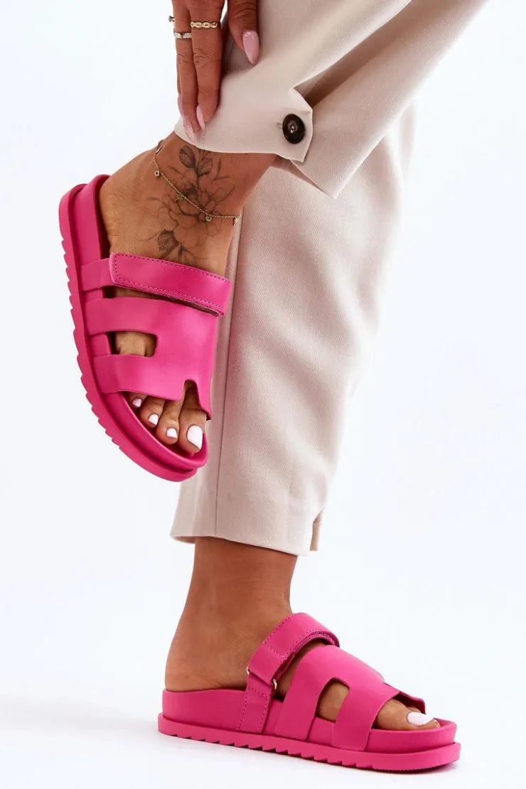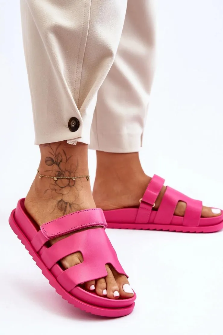 Klasyczne klapki damskie na lekkiej platformie zostały wzbogacone zapięciem na rzep, dzięki któremu obuwie można dopasować do tęgości nogi. Dobrze wyprofilowana wkładka zapewni komfort podczas użytkowania. Klapki te o ciekawym fasonie z pewnością sprawdzą się w wielu stylizacjach! Zostały wykonane z eko skóry. Przy wyborze rozmiaru prosimy sugerować się tabelą rozmiarów.