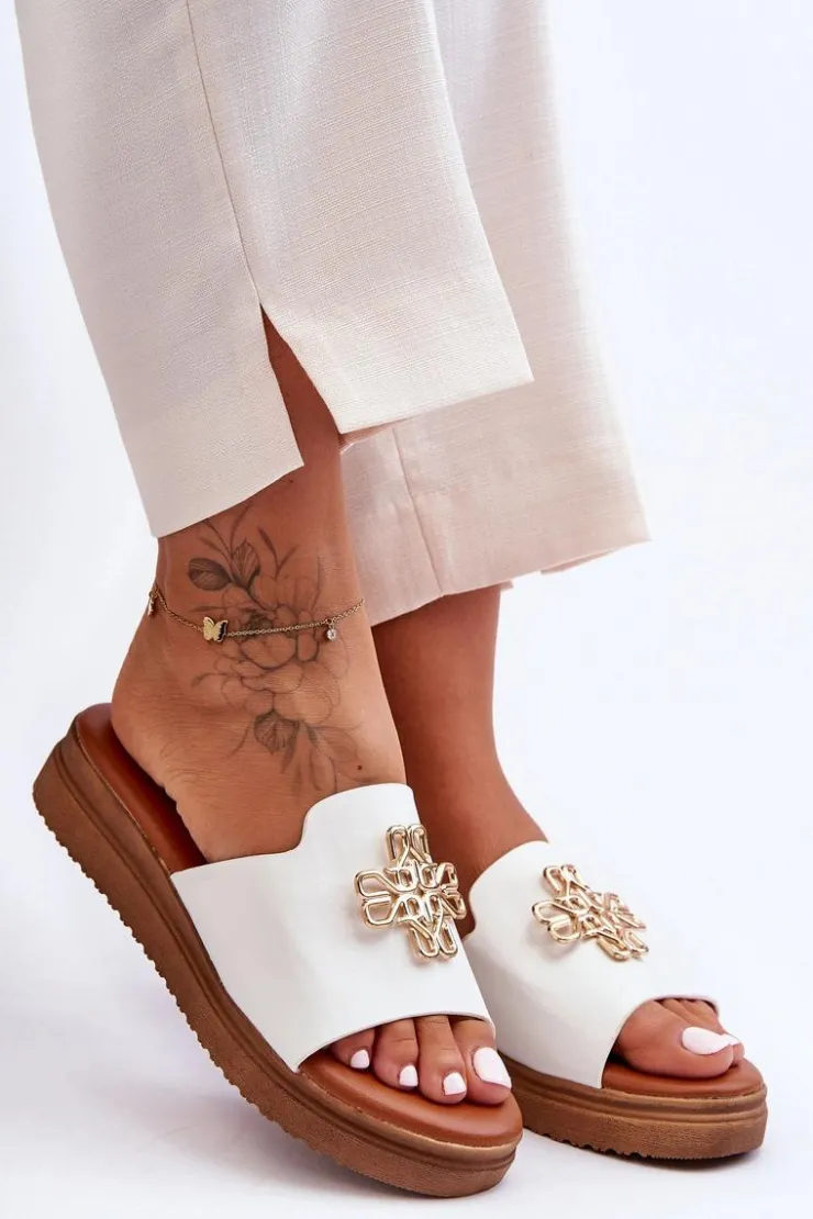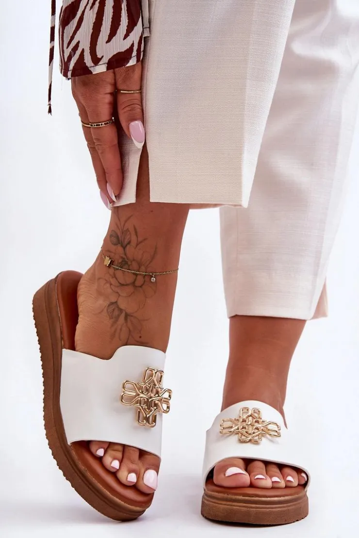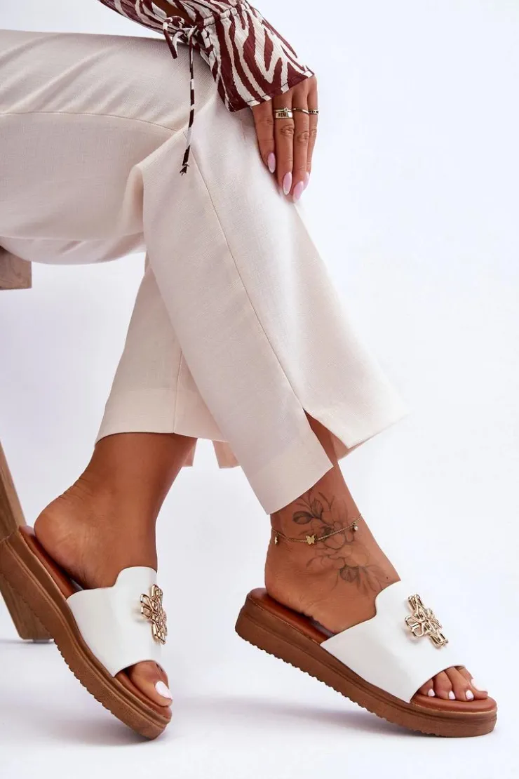 Klasyczne, damskie klapki zostały wykonane z eko skóry. Model ten posiada ozdobę wykonaną z tworzywa sztucznego. Klapki osadzono na grubej platformie. Wkładka jest bardzo miękka i wygodna w użytkowaniu. Ten model powinien znaleźć się właśnie w Twojej garderobie! Przy wyborze rozmiaru prosimy sugerować się tabelą rozmiarów.