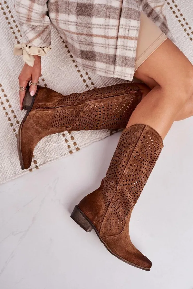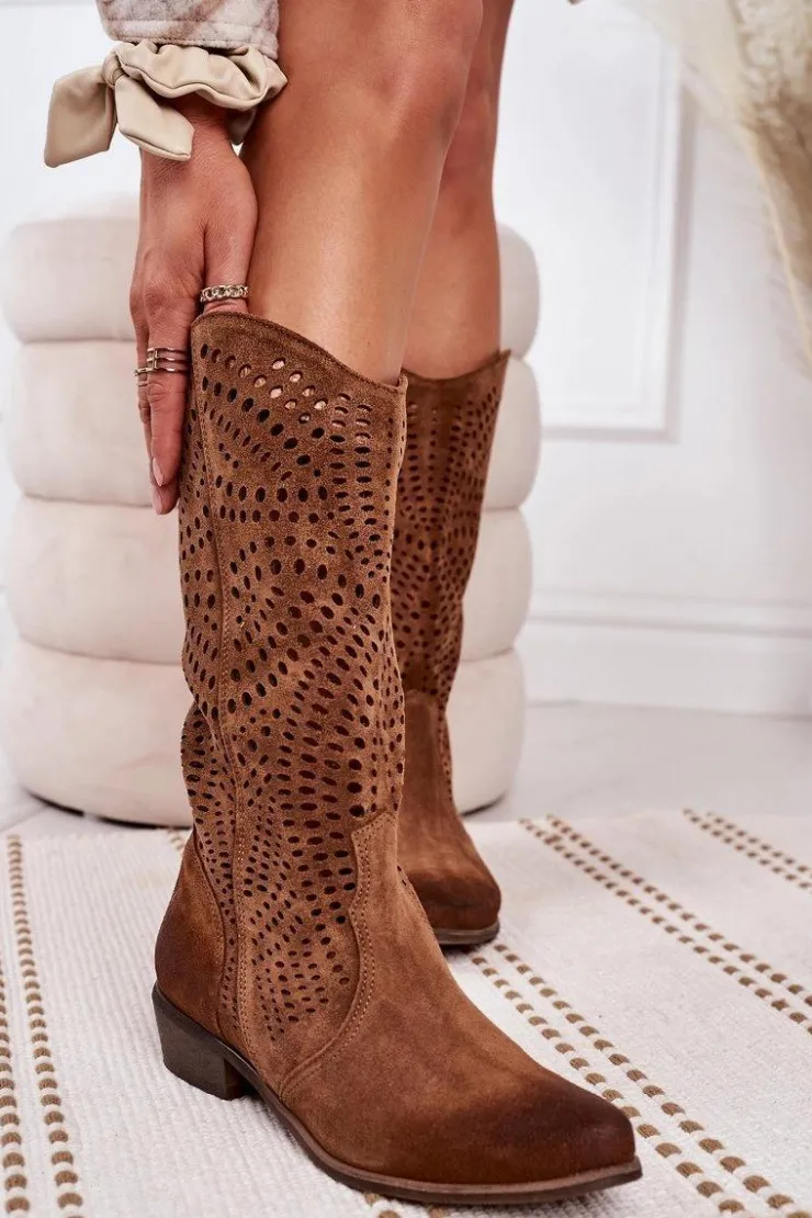 Boto Kozaki Ażurowe|Kozaki Zamszowe*Wiosenne Ażurowe Kozaki Zamszowe Exquisite 1229 Koniak