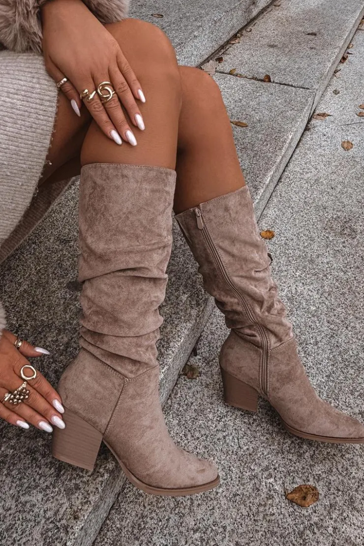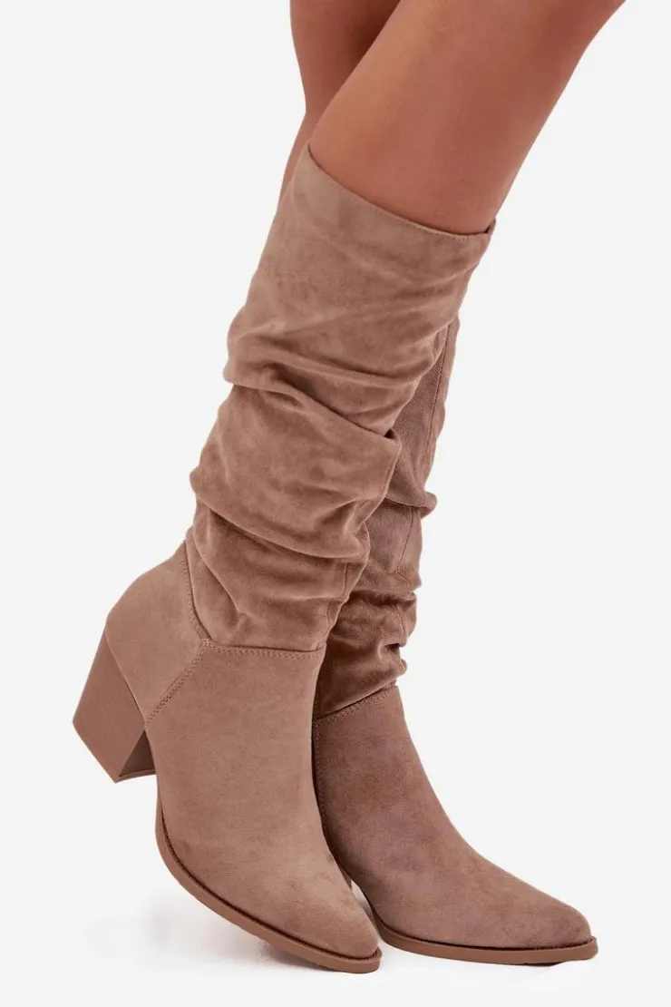 Kozaki damskie wykonane z eko zamszu to stylowa propozycja dla kobiet ceniących elegancję w modnym wydaniu. Model wyróżnia się marszczoną cholewką, która dodaje całości oryginalnego charakteru. Osadzone na stabilnym, ściętym obcasie typu słupek, subtelnie wysmuklają sylwetkę, zapewniając jednocześnie wygodę podczas noszenia. Szpiczaste noski podkreślają kobiecy styl, a praktyczne zapięcie na zamek ułatwia zakładanie. Wnętrze ocieplane miękkim kocem obuwniczym gwarantuje ciepło w chłodniejsze dni. To kozaki, które doskonale dopełnią zarówno eleganckie, jak i codzienne stylizacje. Przy wyborze rozmiaru prosimy sugerować się tabelą rozmiarów.