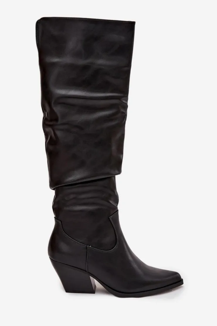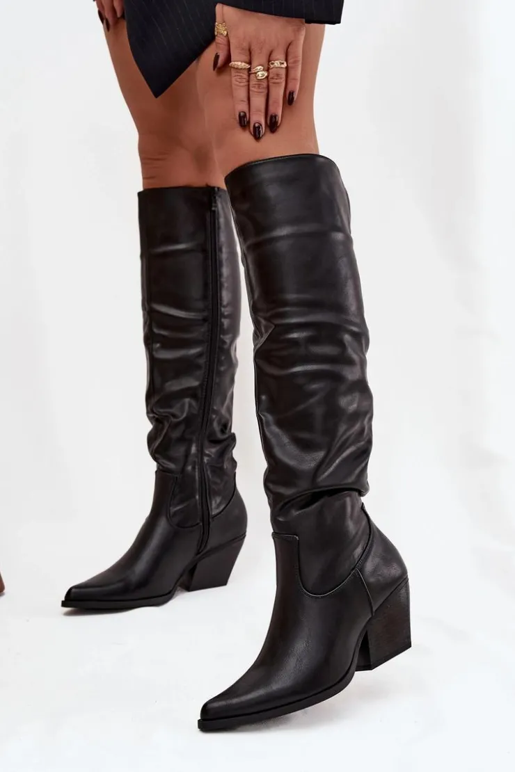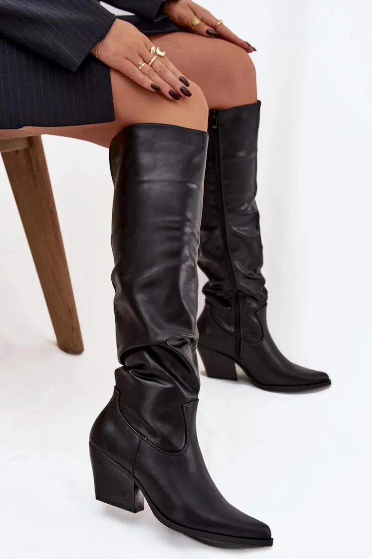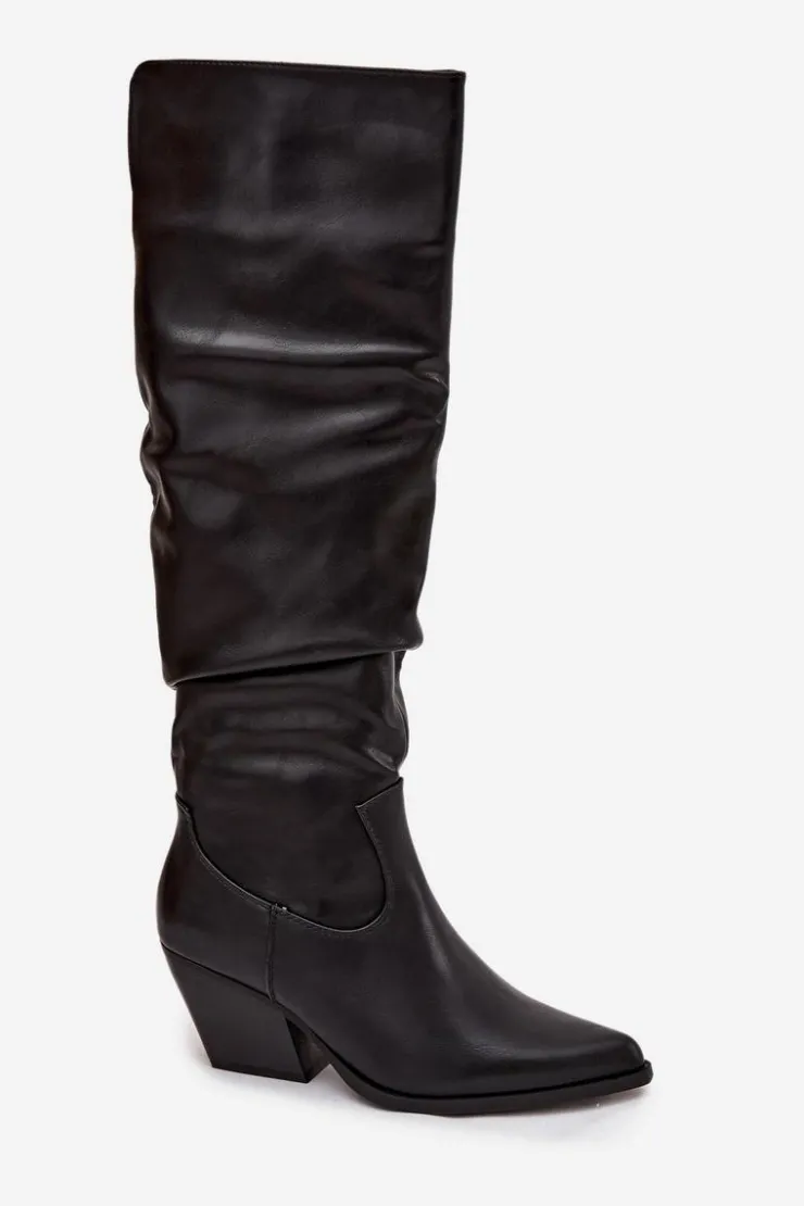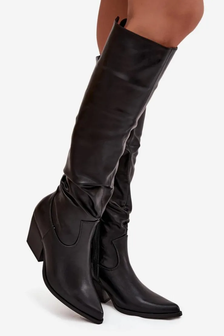 Kozaki kowbojki damskie wykonane z eko skóry. Wyróżniają się charakterystycznym marszczeniem na cholewce oraz szpiczastymi noskami. Osadzone na stabilnym, ściętym obcasie typu słupek, zapewniają komfort i pewność kroku. Buty zapinane są na zamek, co ułatwia ich zakładanie. Wnętrze ocieplone pianką pokrytą tkaniną gwarantuje ciepło i wygodę w chłodniejsze dni. To doskonała propozycja dla kobiet, które lubią styl western w eleganckim wydaniu – idealne do sukienek, spódnic czy dopasowanych spodni. Przy wyborze rozmiaru prosimy sugerować się tabelą rozmiarów.