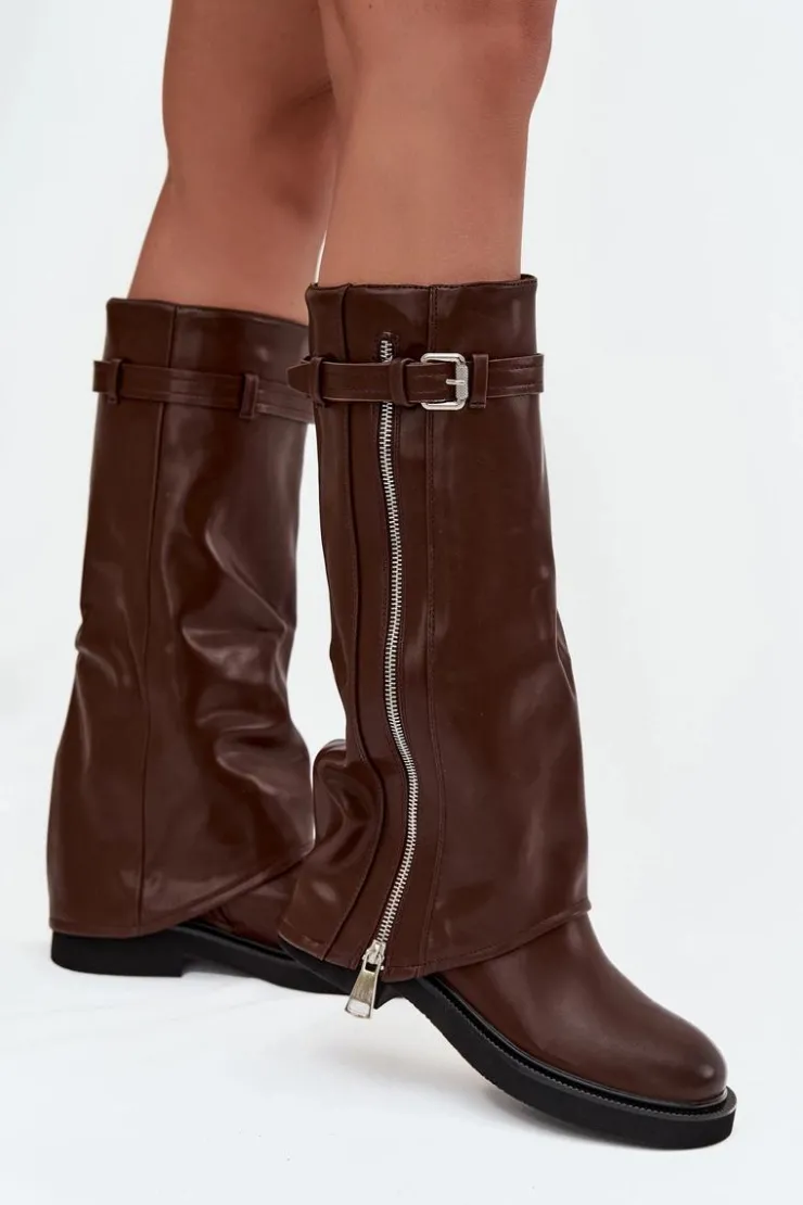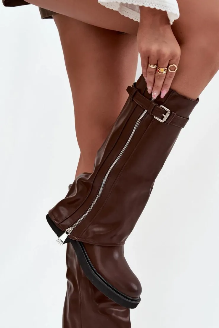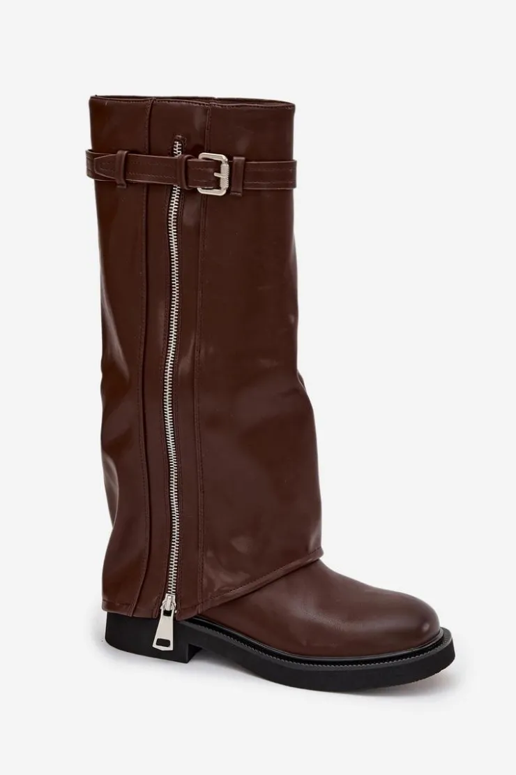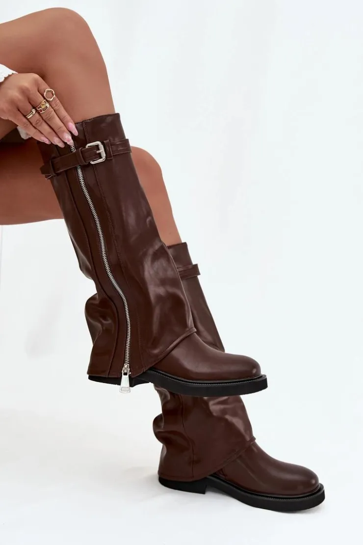 Kozaki damskie z wywiniętą cholewką to prawdziwy hit sezonu jesienno-zimowego. Wykonane z eko skóry. Osadzone na płaskim obcasie, sprawdzą się w codziennym noszeniu, a dzięki ociepleniu kocem obuwniczym zapewniają komfort i ciepło w chłodniejsze dni. Praktyczny, wsuwany fason ułatwia zakładanie, a modne detale nadają wyjątkowego charakteru – pasek z klamrą na górze cholewki oraz srebrny zamek, który można rozsunąć według własnych preferencji, czynią ten model oryginalnym i stylowym dodatkiem. To kozaki, które świetnie uzupełnią zarówno casualowe zestawy ze spodniami czy legginsami, jak i bardziej kobiece stylizacje z sukienką.