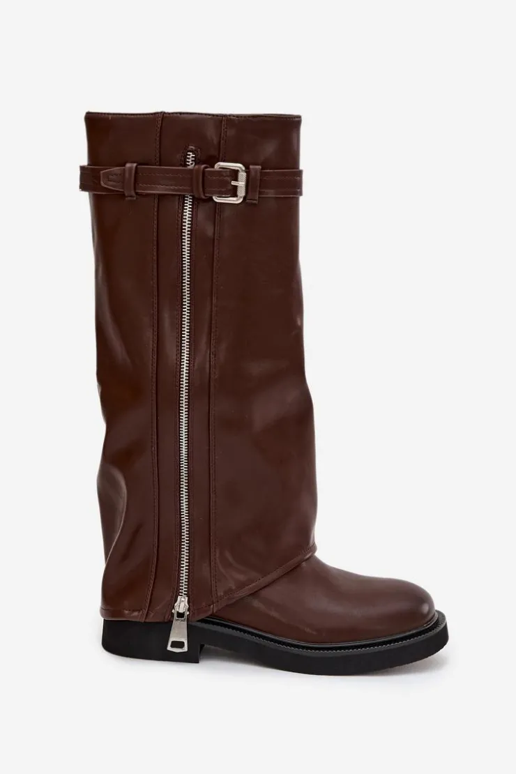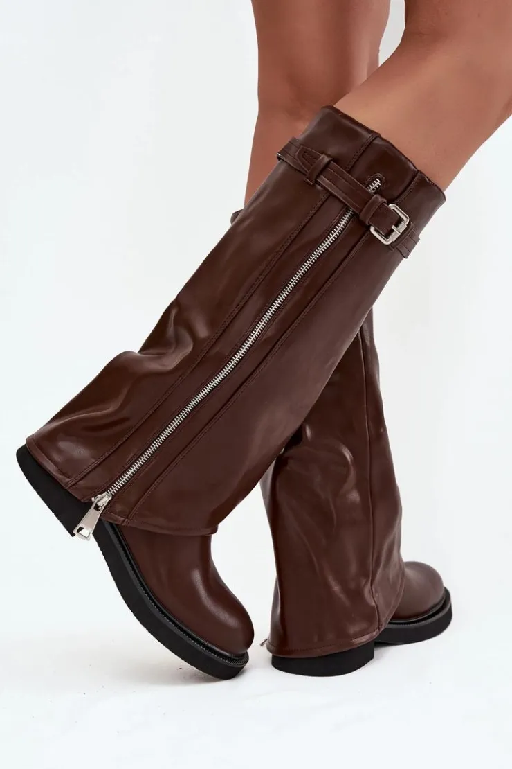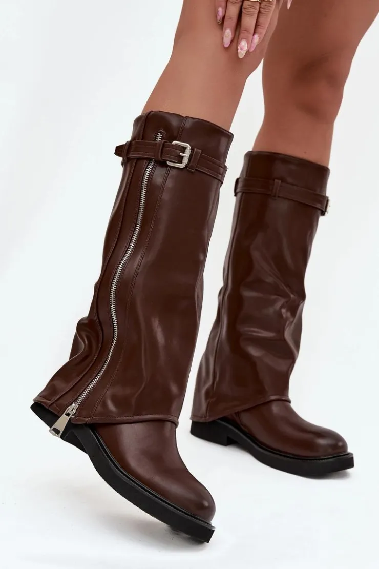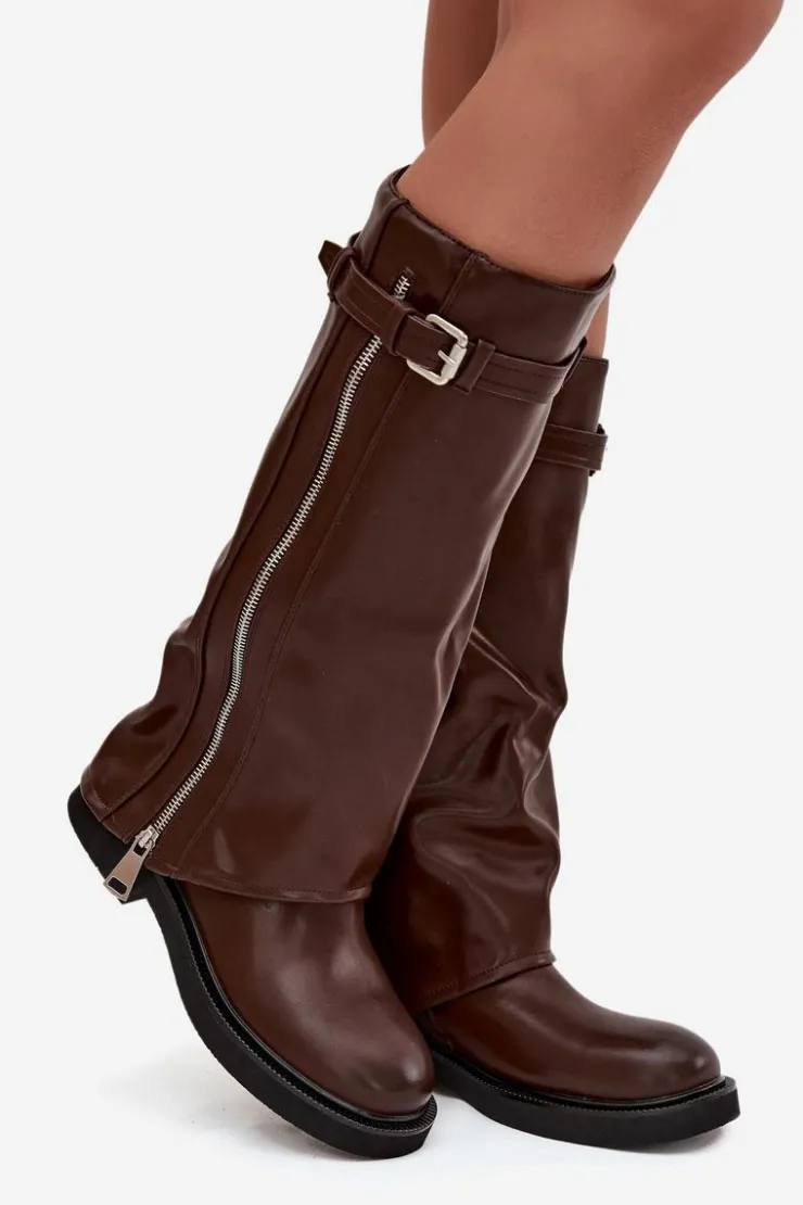 Kozaki damskie z wywiniętą cholewką to prawdziwy hit sezonu jesienno-zimowego. Wykonane z eko skóry. Osadzone na płaskim obcasie, sprawdzą się w codziennym noszeniu, a dzięki ociepleniu kocem obuwniczym zapewniają komfort i ciepło w chłodniejsze dni. Praktyczny, wsuwany fason ułatwia zakładanie, a modne detale nadają wyjątkowego charakteru – pasek z klamrą na górze cholewki oraz srebrny zamek, który można rozsunąć według własnych preferencji, czynią ten model oryginalnym i stylowym dodatkiem. To kozaki, które świetnie uzupełnią zarówno casualowe zestawy ze spodniami czy legginsami, jak i bardziej kobiece stylizacje z sukienką.
