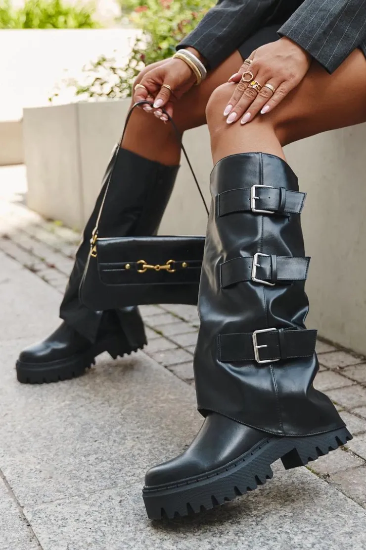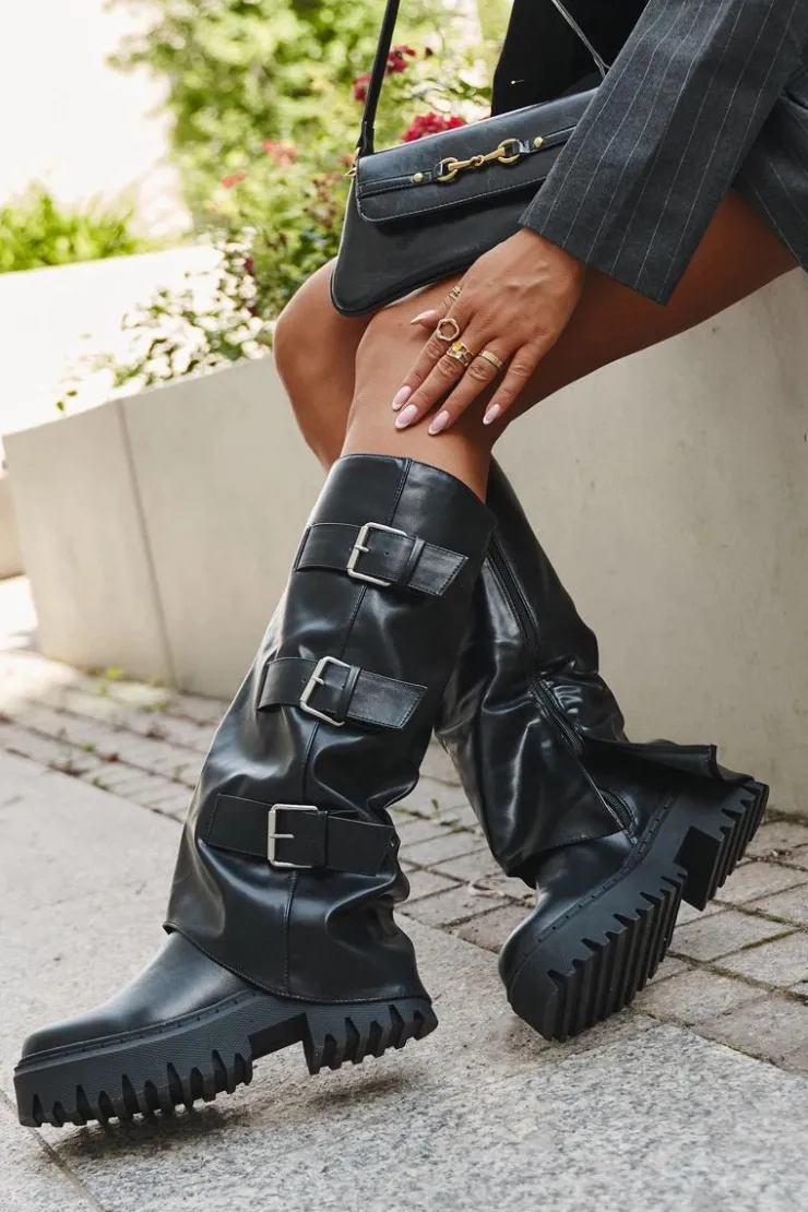 Stylowe kozaki damskie wykonane z eko skóry to idealny wybór dla kobiet ceniących modny wygląd i wygodę. Osadzone na platformie z płaskim obcasem gwarantują stabilność oraz komfort noszenia przez cały dzień. Model wyróżnia się efektowną, wywiniętą cholewką, która nadaje całości oryginalnego charakteru. Trzy srebrne klamry z paskami to detal przyciągający uwagę i dodający wyrazistego, nowoczesnego stylu. Kozaki zapinane są na zamek, co ułatwia ich zakładanie i zdejmowanie. Wnętrze zostało ocieplone, dzięki czemu buty doskonale sprawdzą się w chłodniejsze dni. To model, który świetnie prezentuje się zarówno w casualowych stylizacjach z jeansami, jak i w zestawieniu z sukienką czy spódnicą, dodając każdemu outfitowi nuty charakteru.