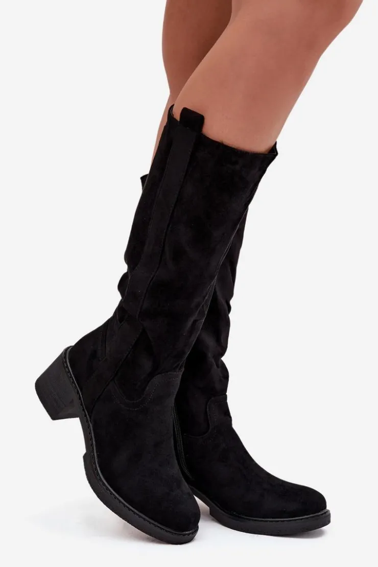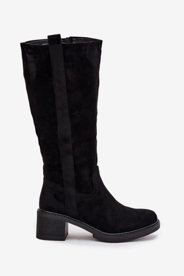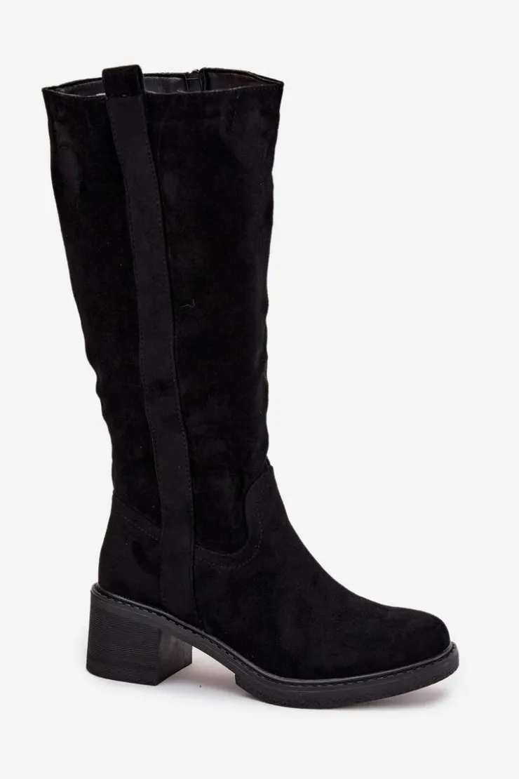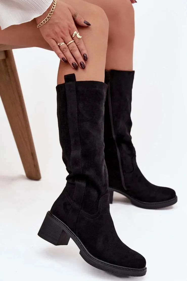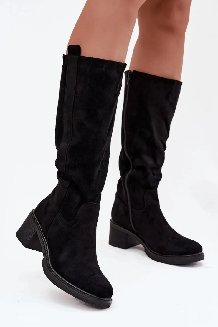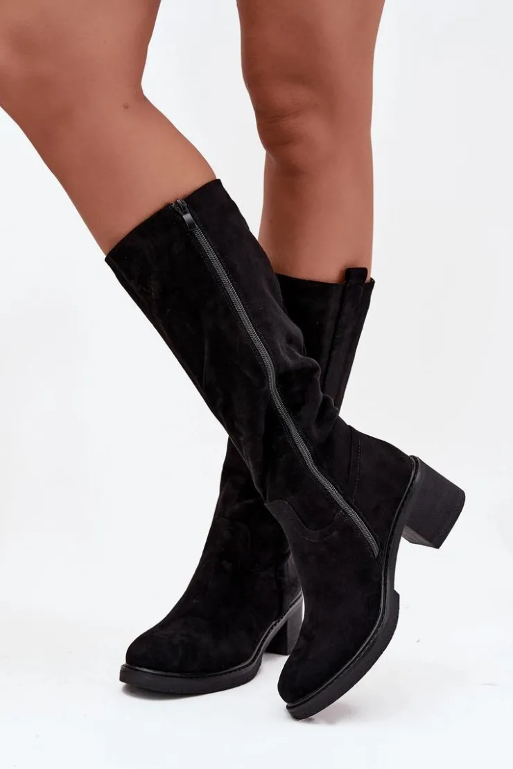 Kozaki damskie wykonane z eko zamszu. Model zapinany na zamek. Osadzone na stabilnym obcasie w formie klocka, co zapewnia komfort i pewność kroku. Zaokrąglone noski nadają całości delikatnego, kobiecego charakteru. Wnętrze ocieplone pianką pokrytą tkaniną gwarantuje ciepło i wygodę w chłodniejsze dni. Klasyczny fason sprawia, że kozaki doskonale komponują się zarówno z dopasowanymi spodniami typu skinny, jak i z sukienkami czy spódnicami, tworząc stylowe i uniwersalne zestawy na wiele okazji.