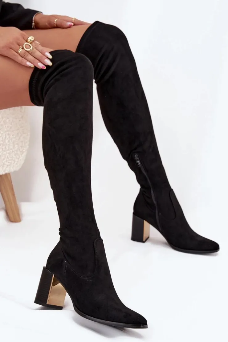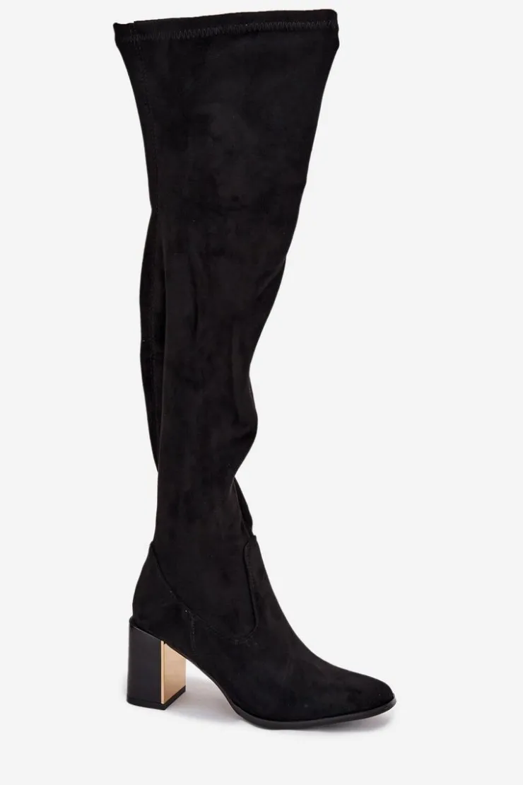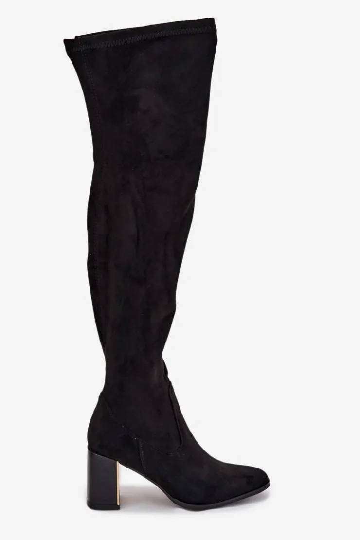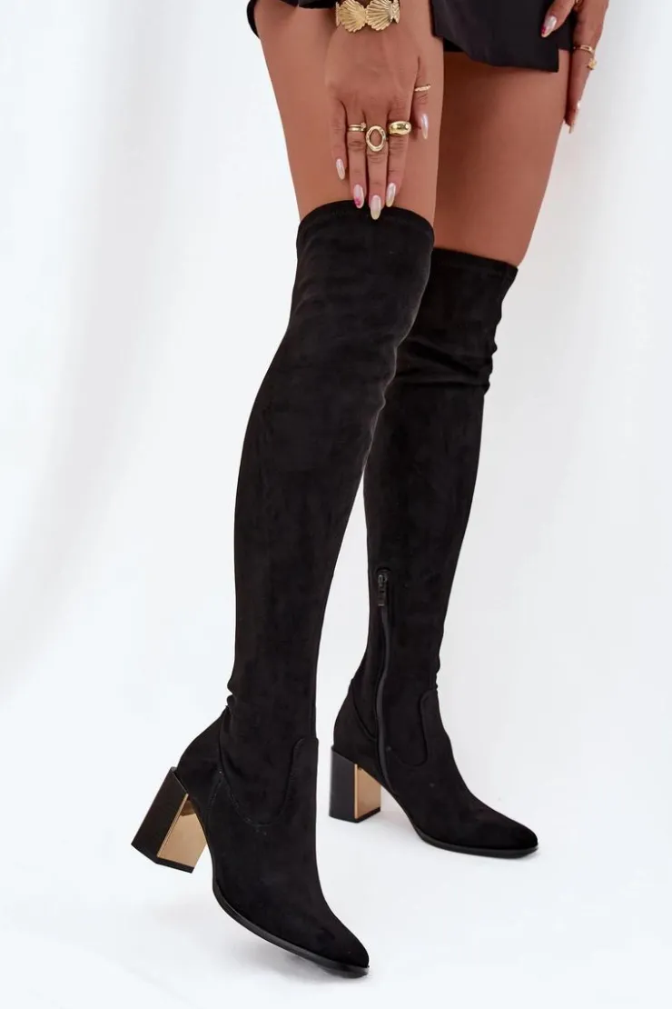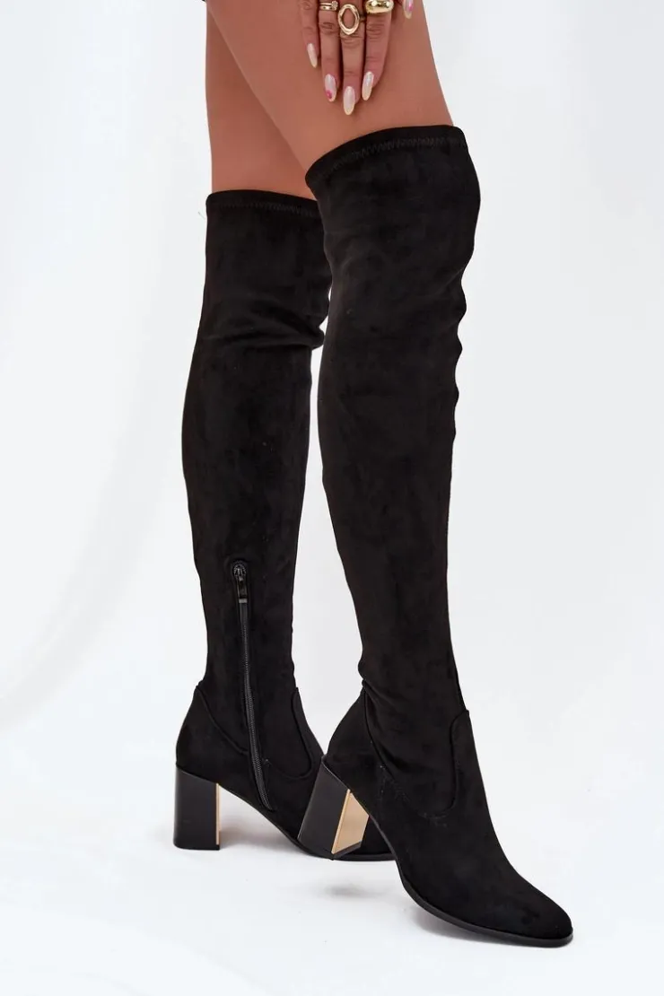 Kozaki damskie z cholewką sięgającą za kolano to elegancka propozycja na chłodniejsze dni. Wykonane z eko zamszu, osadzone na obcasie typu słupek, który zyskuje wyjątkowy efekt dzięki lustrzanemu elementowi. Model wsuwany z dodatkowym suwakiem ułatwia zakładanie i zdejmowanie. Wnętrze ocieplone na wysokości stopy gwarantuje ciepło, a zaokrąglony krój sprawia, że kozaki będą doskonałym wyborem do sukienek mini i spódniczek. Idealne na jesień i zimę, te kozaki będą świetnym dopełnieniem Twoich zimowych stylizacji! Przy wyborze rozmiaru prosimy sugerować się tabelą rozmiarów.