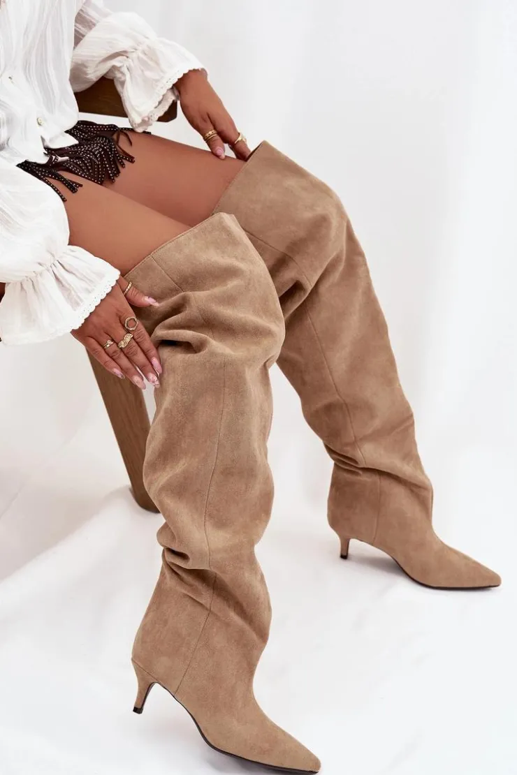 Kozaki damskie wykonane z eko zamszu. Model został osadzony na niskiej szpilce. Charakterystyczną cechą butów jest szeroka cholewka, która nie tylko nadaje im modnego wyglądu, ale również sprawia, że kozaki są wygodne w noszeniu i łatwe do dopasowania do każdej nogi. Wsuwany fason ułatwia szybkie zakładanie i zdejmowanie, czyniąc obuwie praktycznym w codziennym użytkowaniu. To kozaki, które doskonale sprawdzą się zarówno w zestawieniach casualowych, jak i bardziej eleganckich stylizacjach, dodając im wyrafinowanego charakteru. Przy wyborze rozmiaru prosimy kierować tabelą rozmiarów.
