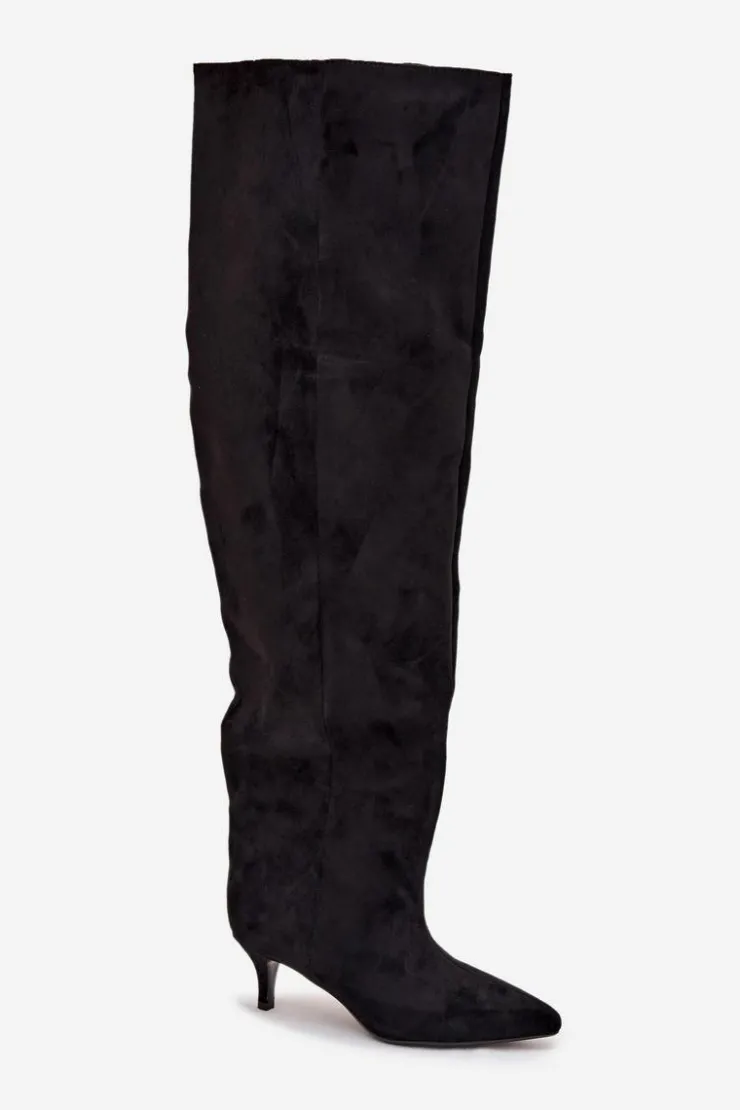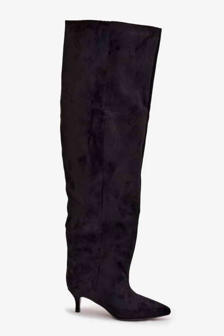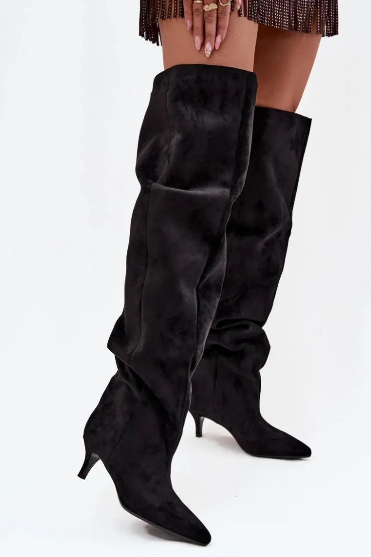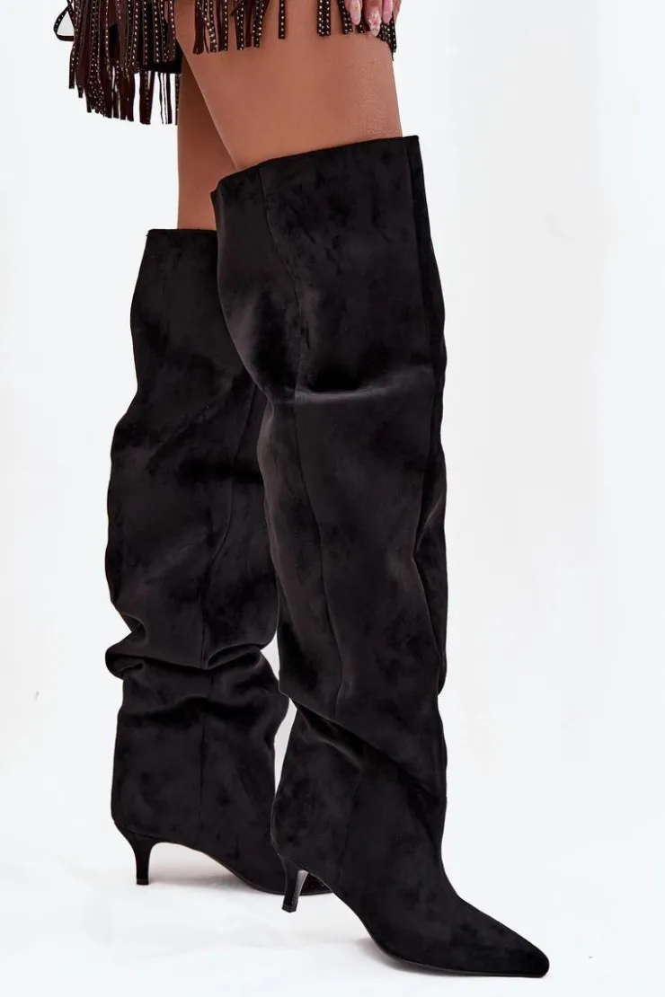 Kozaki damskie wykonane z eko zamszu. Model został osadzony na niskiej szpilce. Charakterystyczną cechą butów jest szeroka cholewka, która nie tylko nadaje im modnego wyglądu, ale również sprawia, że kozaki są wygodne w noszeniu i łatwe do dopasowania do każdej nogi. Wsuwany fason ułatwia szybkie zakładanie i zdejmowanie, czyniąc obuwie praktycznym w codziennym użytkowaniu. To kozaki, które doskonale sprawdzą się zarówno w zestawieniach casualowych, jak i bardziej eleganckich stylizacjach, dodając im wyrafinowanego charakteru. Przy wyborze rozmiaru prosimy kierować tabelą rozmiarów.