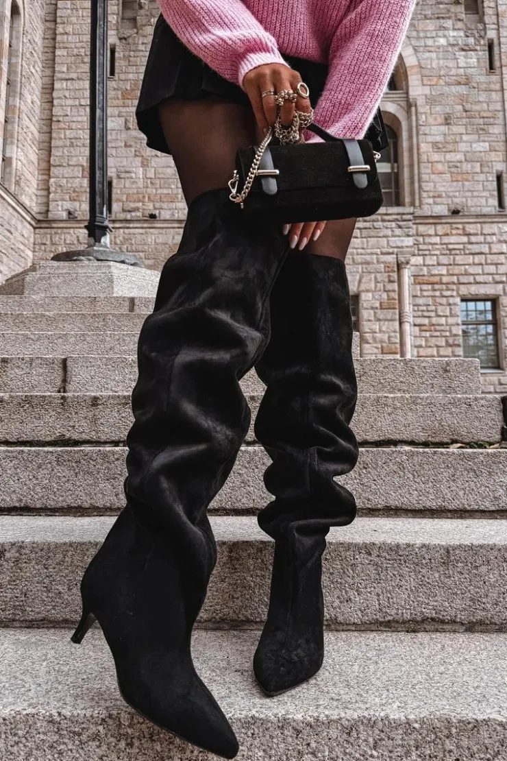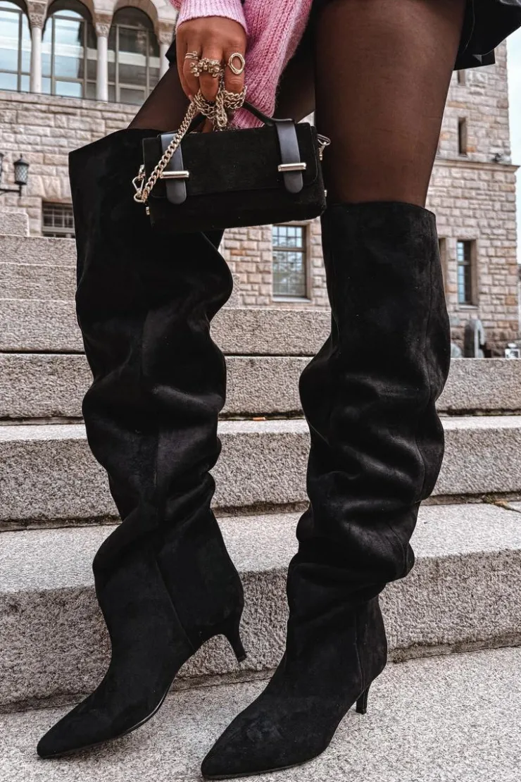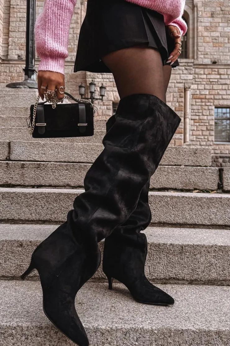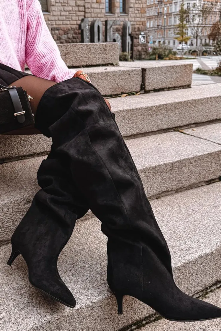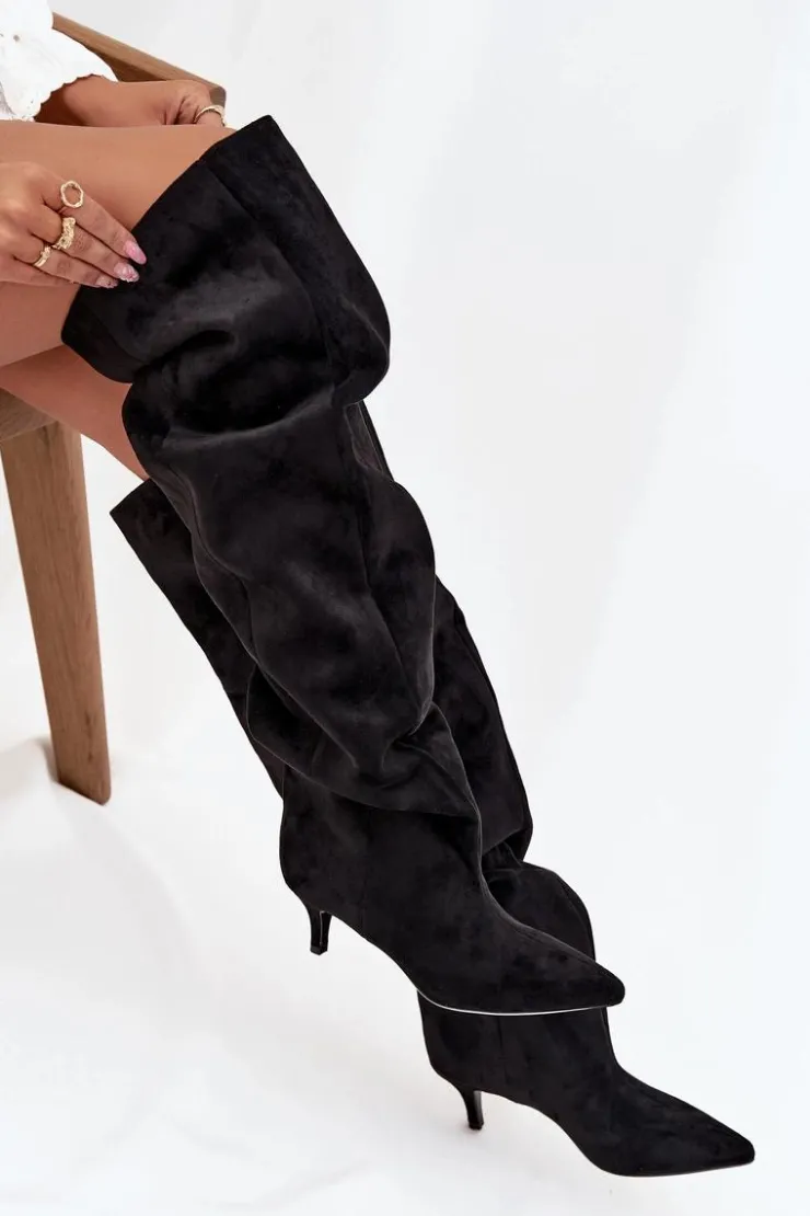 Kozaki damskie wykonane z eko zamszu. Model został osadzony na niskiej szpilce. Charakterystyczną cechą butów jest szeroka cholewka, która nie tylko nadaje im modnego wyglądu, ale również sprawia, że kozaki są wygodne w noszeniu i łatwe do dopasowania do każdej nogi. Wsuwany fason ułatwia szybkie zakładanie i zdejmowanie, czyniąc obuwie praktycznym w codziennym użytkowaniu. To kozaki, które doskonale sprawdzą się zarówno w zestawieniach casualowych, jak i bardziej eleganckich stylizacjach, dodając im wyrafinowanego charakteru. Przy wyborze rozmiaru prosimy kierować tabelą rozmiarów.
