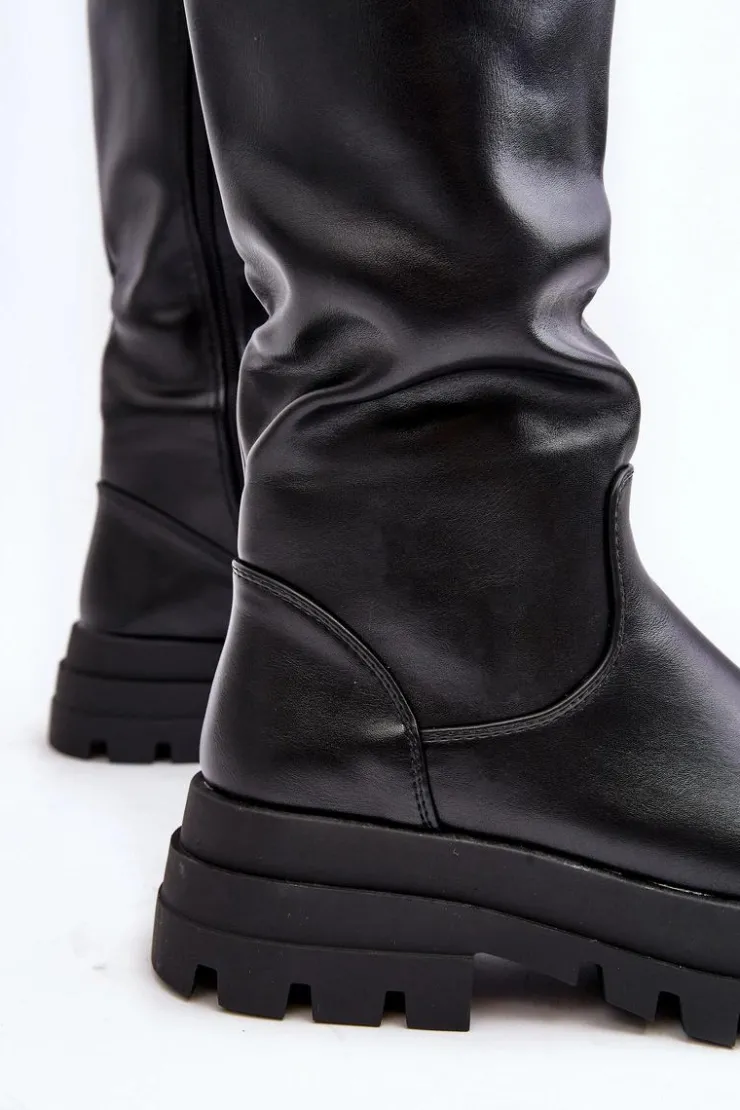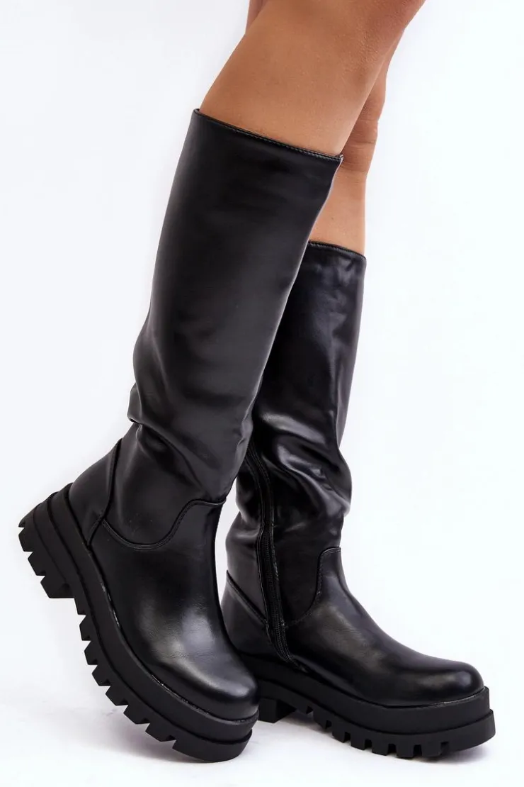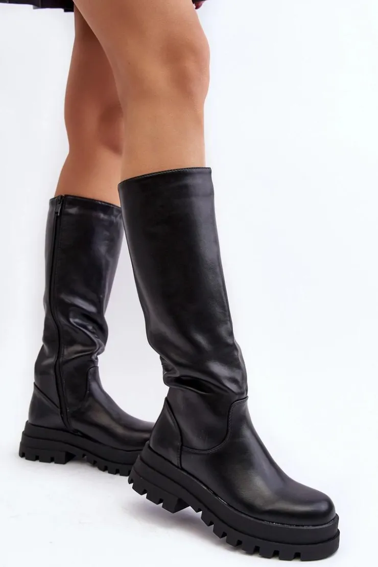 Klasyczne kozaki damskie wykonane z eko skóry. Cholewka przed kolano. Model z zapinaniem na suwak na całej długości cholewki. Kozaki osadzono na platformie oraz płaskim obcasie. Środek ocieplony kocem obuwniczym. Dodatkowo zapiętek w tych butach jest usztywniany. Koniecznie powinnaś je mieć! Przy wyborze rozmiaru prosimy sugerować się tabelą rozmiarów.
