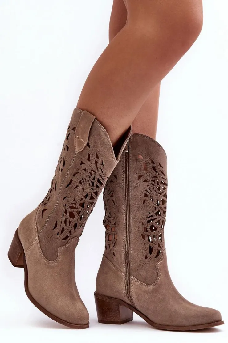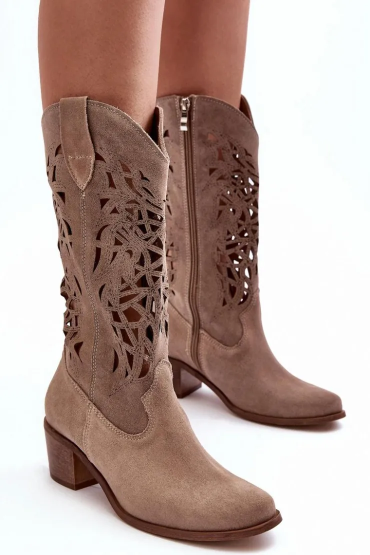 Kozaki damskie z ażurową cholewką. Wykonane ze skóry naturalnej zamszowej. Osadzone na niskim obcasie Noski w migdał. Zapinane na suwak z boku. Usztywniony zapiętek. Model ten idealnie sprawdzi się w jesiennych stylizacjach. Musisz je mieć! Koniecznie sprawdź całą naszą kolekcję butów marki Lewski. Przy wyborze rozmiaru prosimy sugerować się tabelą rozmiarów.