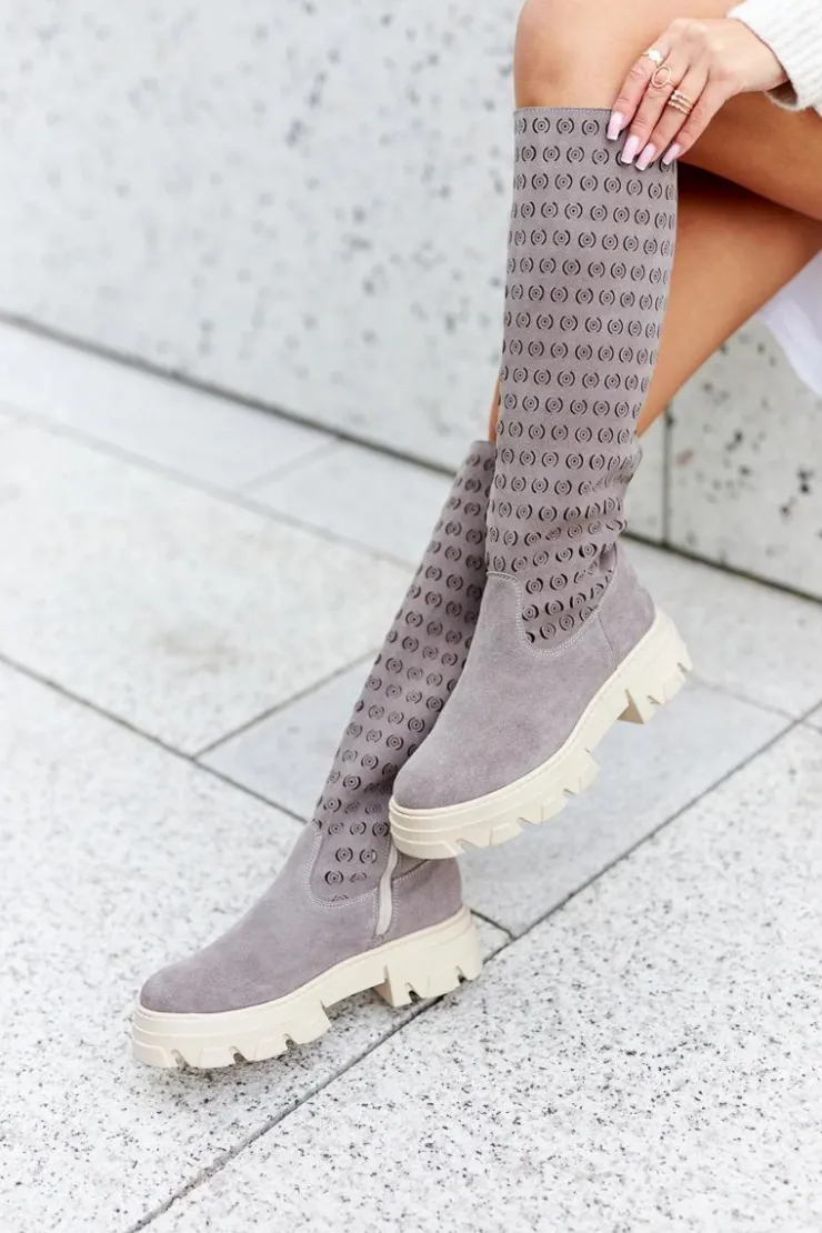 Piękne zamszowe kozaki damskie wykonane zostały ze skóry naturalnej. Na wysokości cholewki występują ażurowe wzorki. Kozaki posiadają grubą, stabilną podeszwę. Suwak ułatwia zakładanie. Idealnie będą się prezentować z sukienkami, jak i dłuższymi spódnicami. Nie czekaj i zakup już dziś! Przy wyborze rozmiaru prosimy sugerować się tabelą rozmiarów.