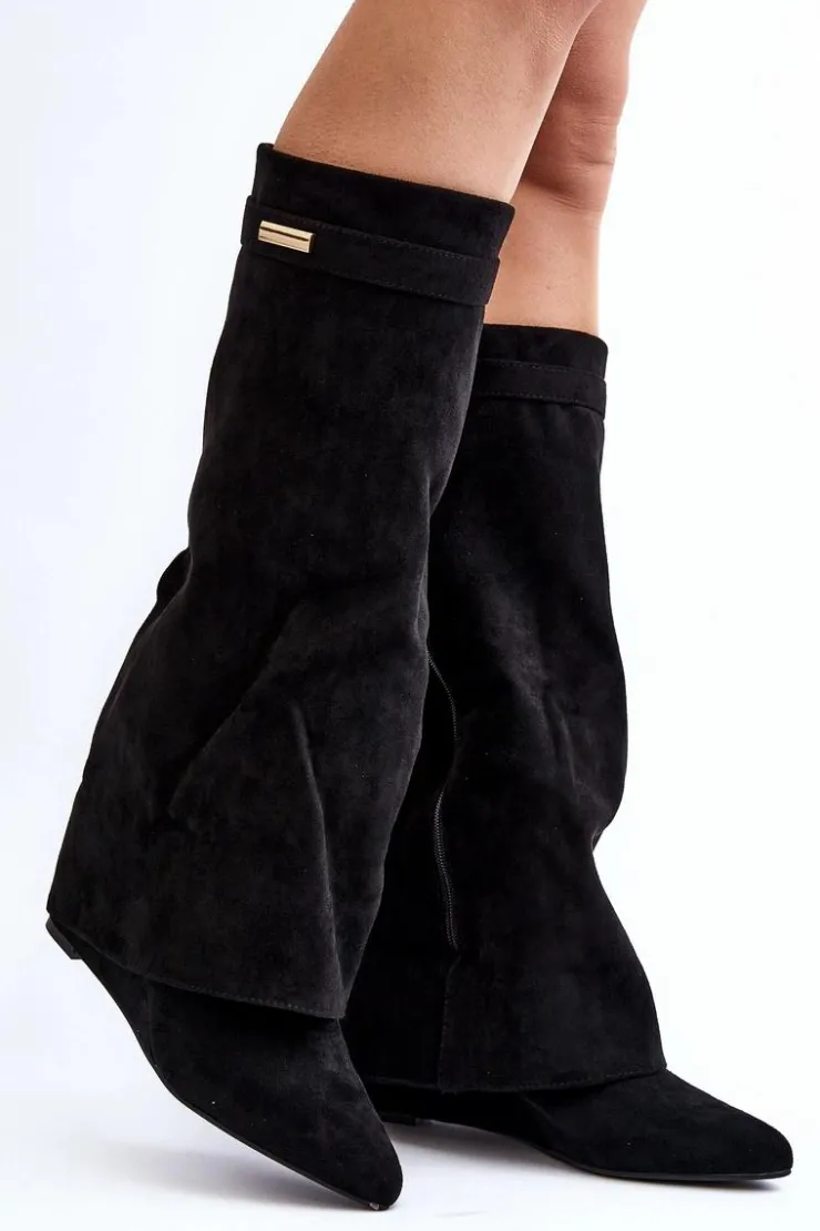 Modne kozaki wykonane z eko zamszu. Model ten posiada cholewkę zachodzącą na koturn, co wyróżnia to obuwie na tle innych kozaków. Noski w szpic optycznie wysmuklą nogi. Zapiętek jest usztywniony. Przy wyborze rozmiaru prosimy sugerować się tabelą rozmiarów.