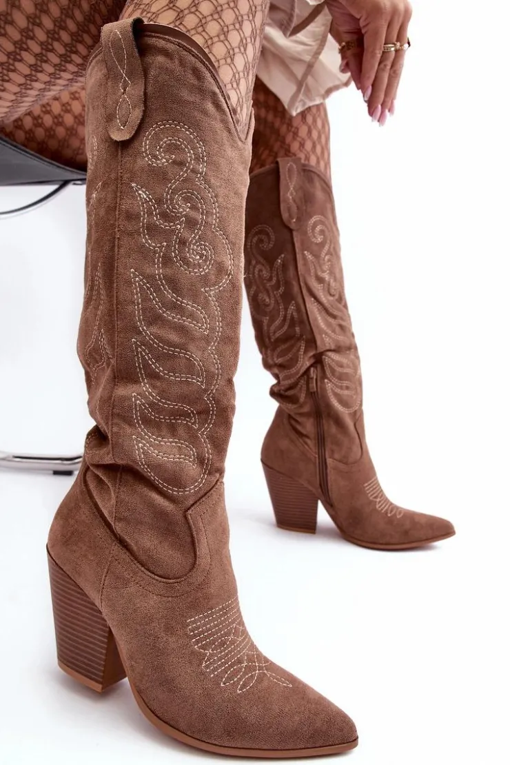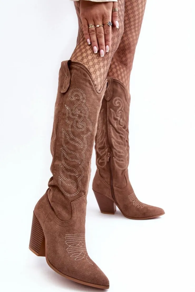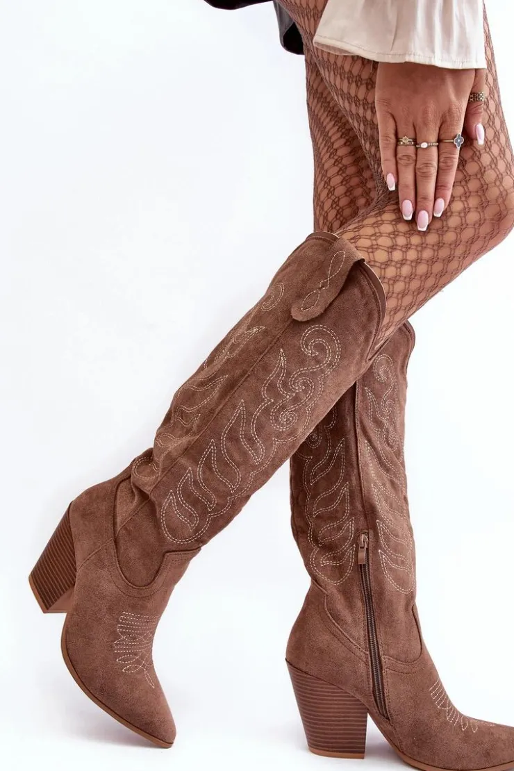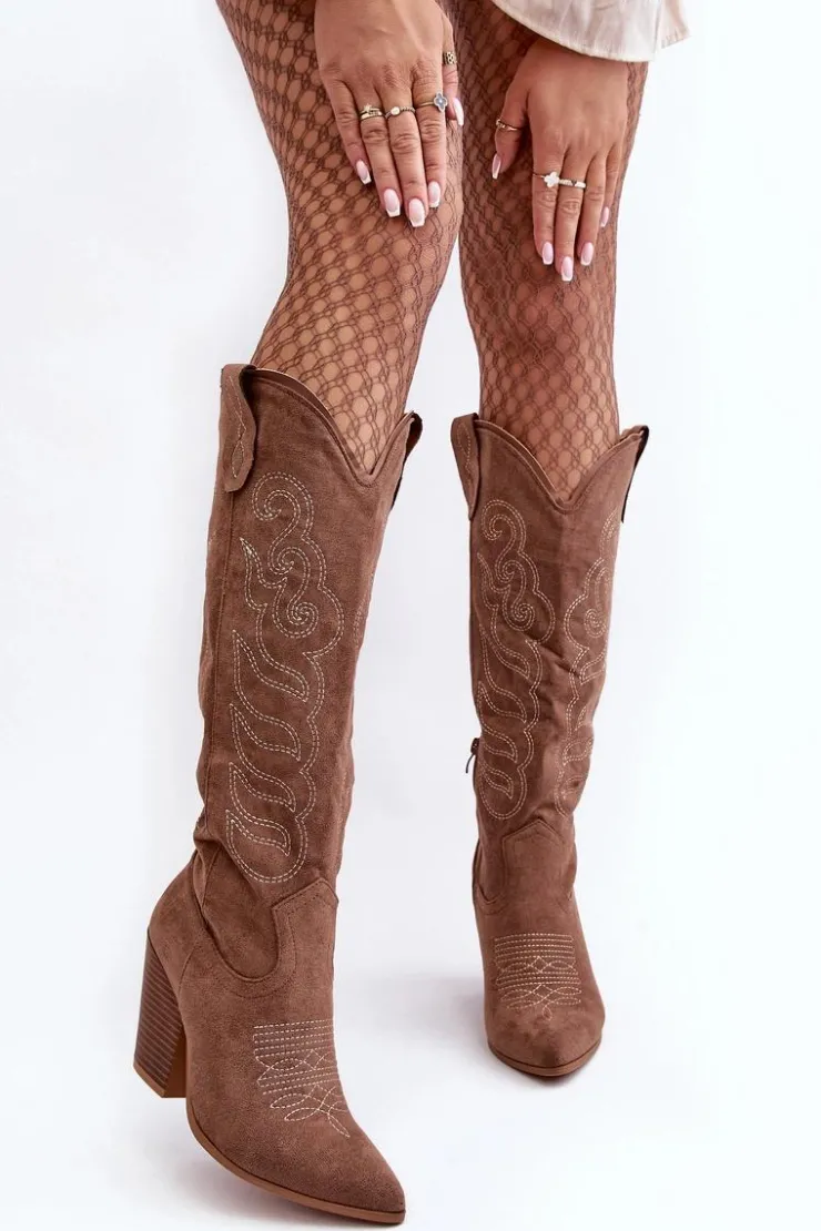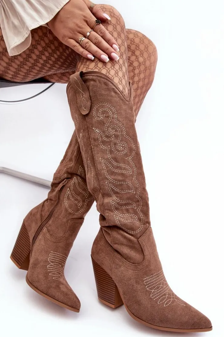 Kozaki damskie z cholewką przed kolano. Osadzone na obcasie w postaci słupka. Noski w szpic optycznie wysmuklą nogi. Zapiętek jest usztywniony. Miękka, eko skórzana wkładka zapewni komfort podczas użytkowania. Model wsuwany z dodatkowym suwakiem na dole cholewki. Świetnie sprawdzą się podczas jesiennych stylizacji! Przy wyborze rozmiaru prosimy sugerować się tabelą rozmiarów.