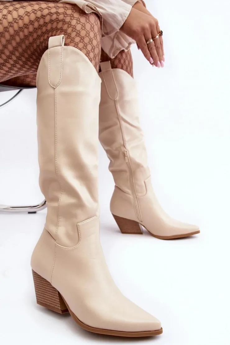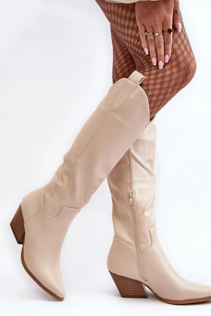 Kozaki damskie z cholewką do kolana. Osadzone na niskim obcasie w postaci słupka. Wykonane z eko skóry. Wsuwane i zapinane częściowo na suwak z boku. Noski w szpic optycznie wysmuklą nogi. Cholewka wzbogacona przeszyciami. Ten model skradnie serce niejednej miłośniczce kozaków w stylu kowbojek! Koniecznie powinnaś je mieć! Przy wyborze rozmiaru prosimy sugerować się tabelą rozmiarów.