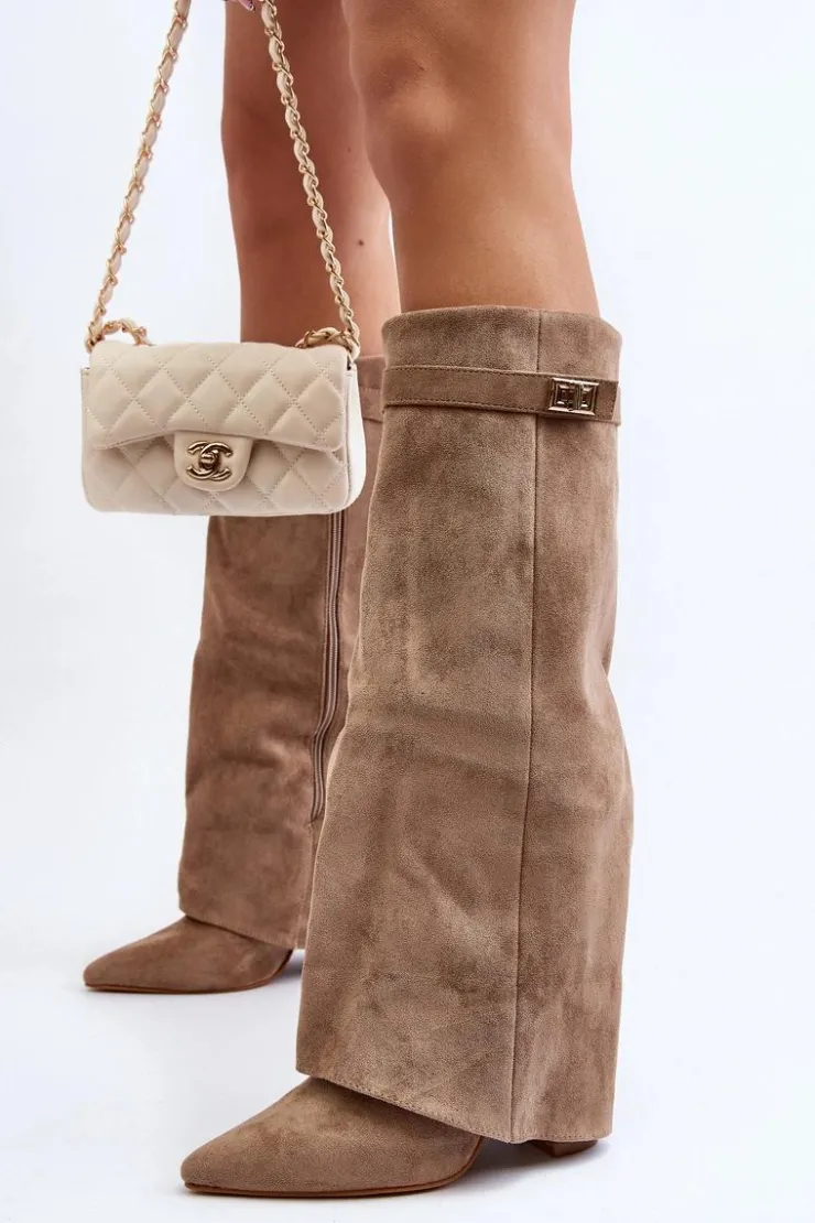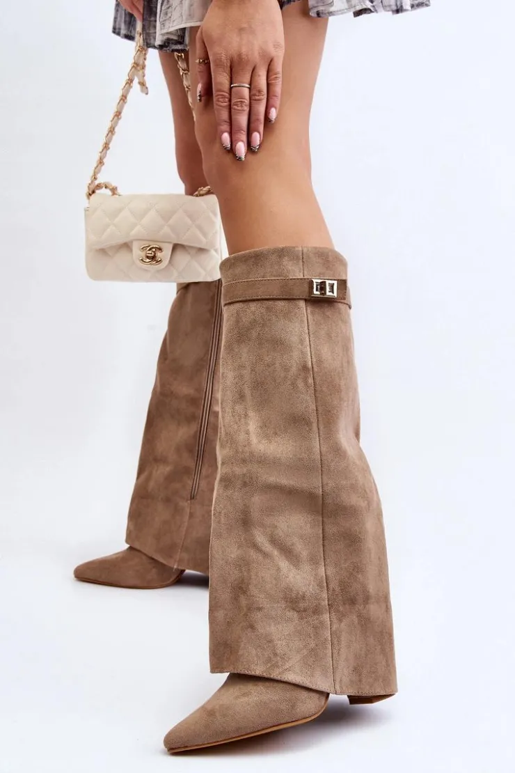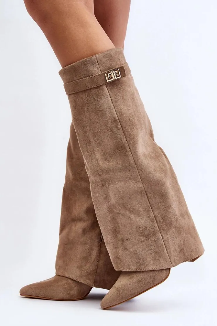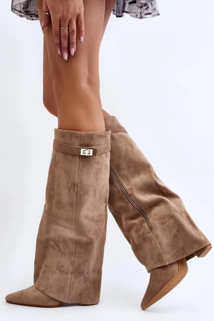 Stylowe kozaki damskie wykonane z eko zamszu. Model ten posiada cholewkę zachodzącą na obcas, co wyróżnia to obuwie na tle innych kozaków. Zapinane na suwak. Noski w szpic optycznie wysmuklą nogi. Idealne do sukienek czy spódnic! Przy wyborze rozmiaru prosimy sugerować się tabelą rozmiarów.