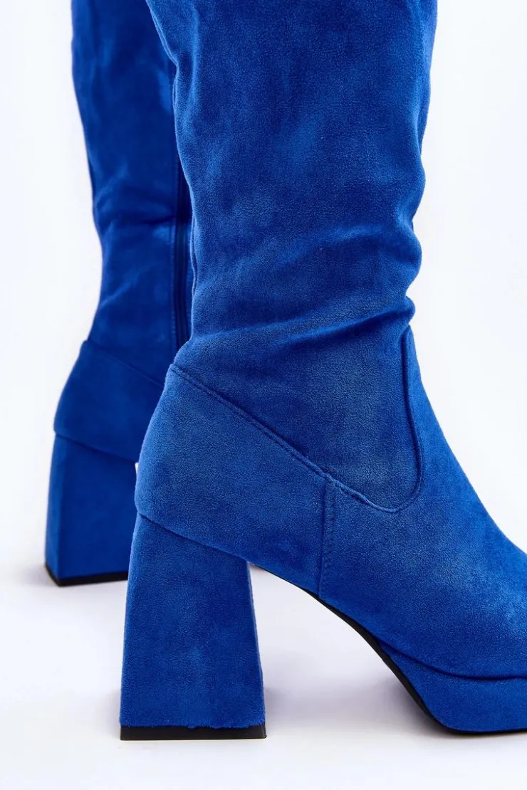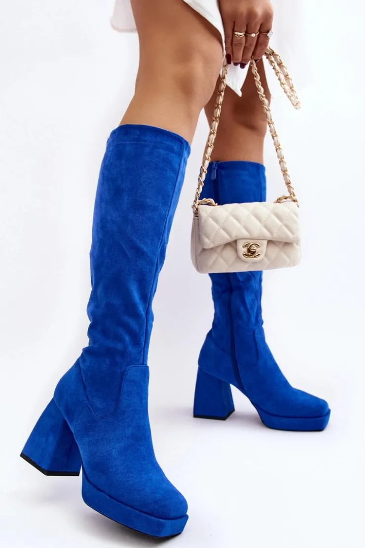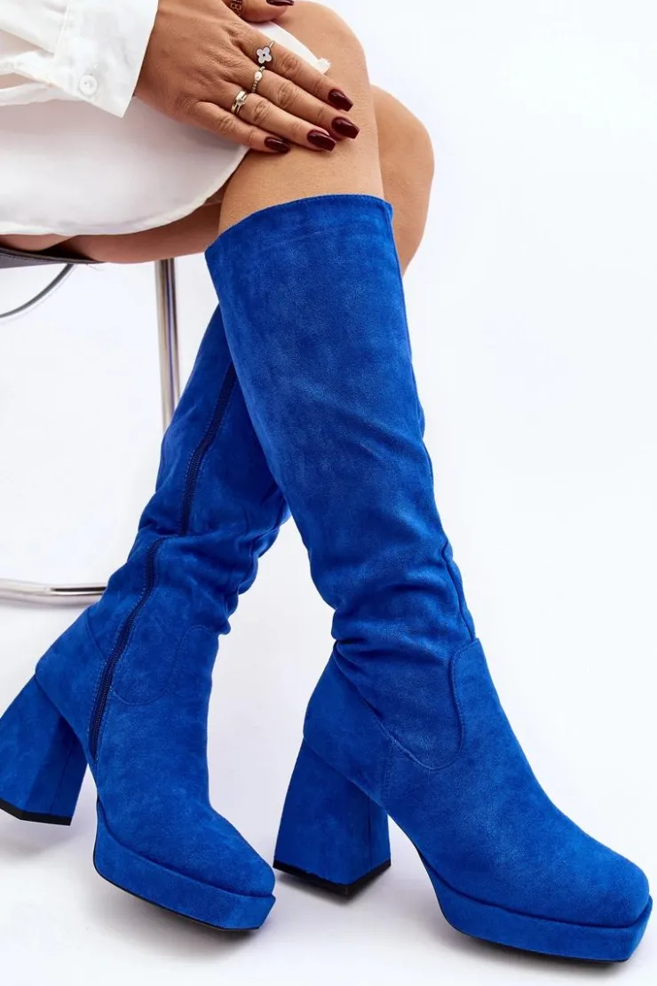 Damskie kozaki z cholewką do kolana. Osadzone na masywnym platformie i obcasie w postaci słupka. Model ten zapinany jest suwakiem z boku. W środku ocieplone kocem obuwniczym. Noski w kwadrat. Idealne do sukienek czy spódnic! Przy wyborze rozmiaru prosimy sugerować się tabelą rozmiarów.