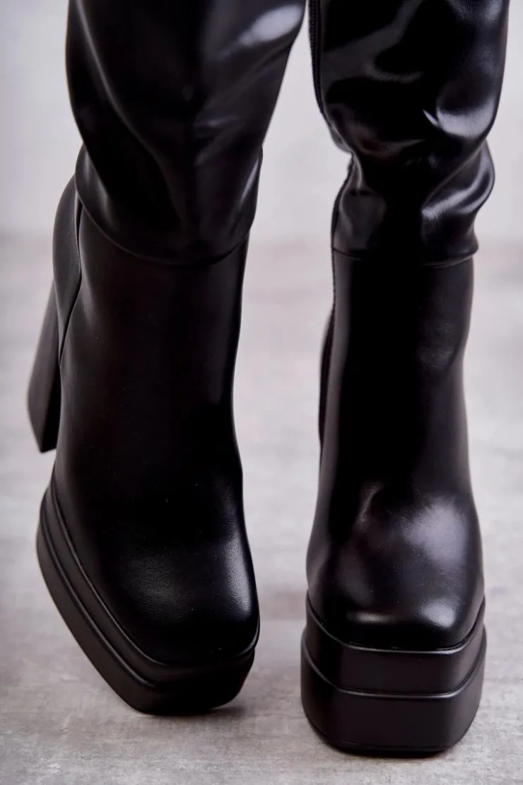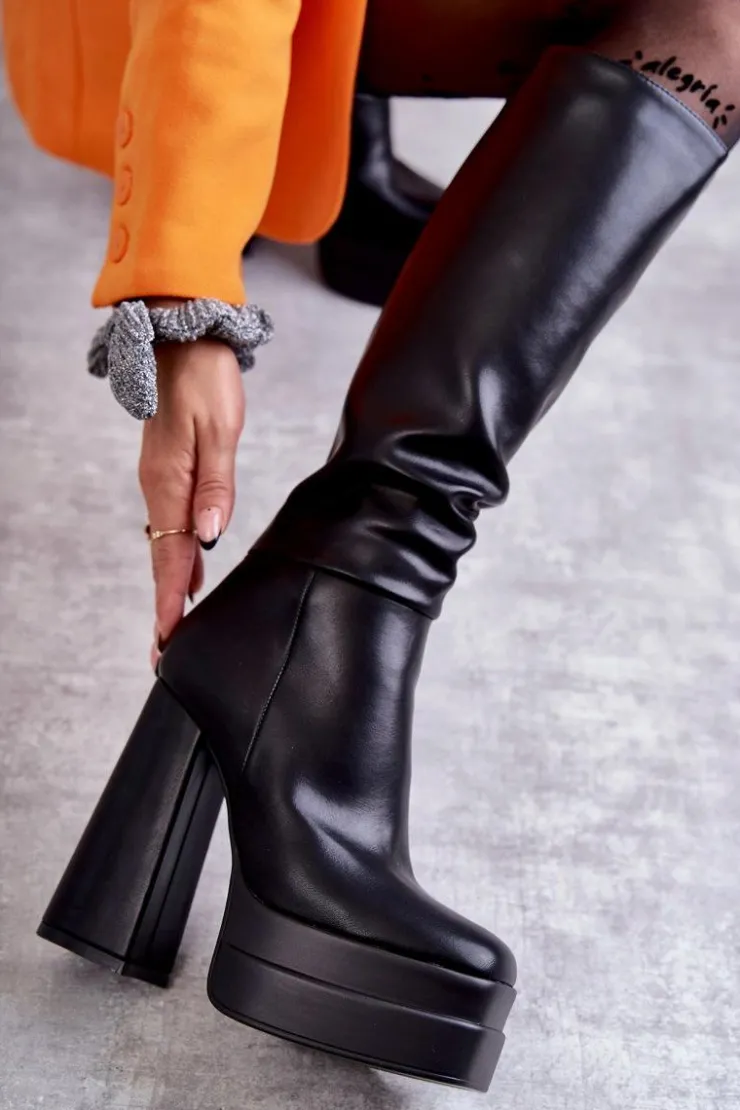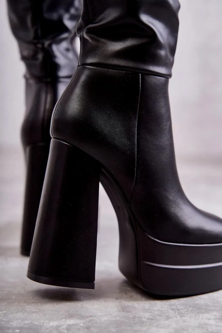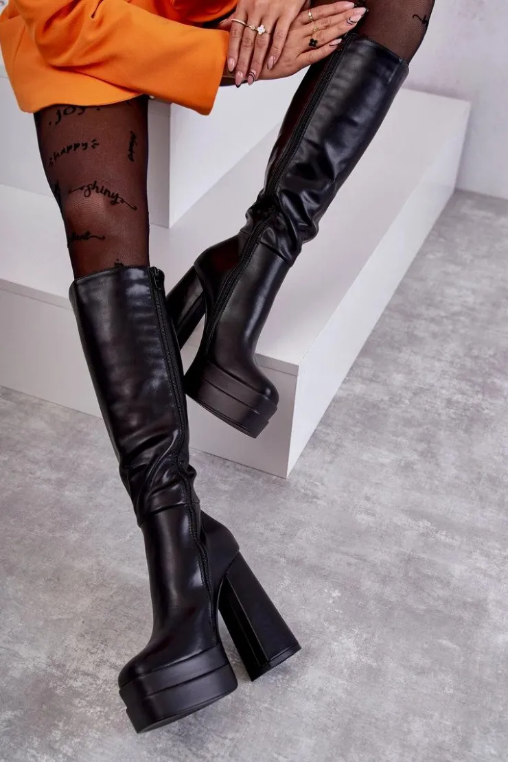 Modne kozaki damskie zostały osadzone na masywnym obcasie w postaci wysokiego słupka oraz platformy. Dodatkowo posiadają usztywniany zapiętek. Zamykane na całej długości cholewki na suwak. Kozaki zostały wykonane z eko skóry. Świetny fason, który wyróżni Cię z tłumu. Koniecznie powinnaś je mieć w swojej garderobie! Przy wyborze rozmiaru prosimy sugerować się tabelą rozmiarów.