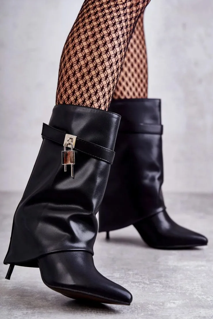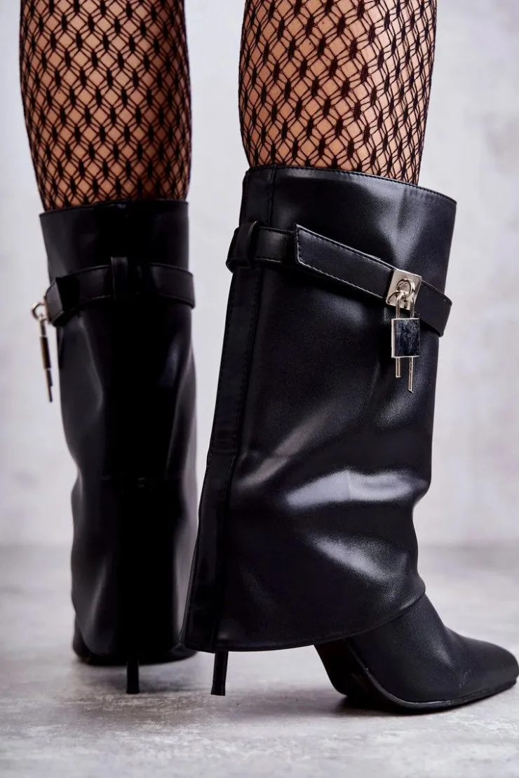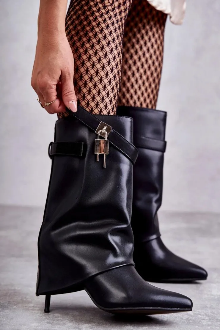 Wyjątkowe, wsuwane kozaki zostały wykonane z eko skóry. Model ten posiada cholewkę zachodzącą na obcas cholewkę, co wyróżnia to obuwie na tle innych kozaków. Pasek z ozdobą zapinany na rzep można całkowicie zdjąć. Model z noskiem w szpic oraz obcas w postaci szpilki optycznie wysmuklą nogi. Wkładka została wykonana z eko skóry. Dodatkowo kozaki posiadają usztywniany zapiętek. Przy wyborze rozmiaru prosimy sugerować się tabelą rozmiarów.