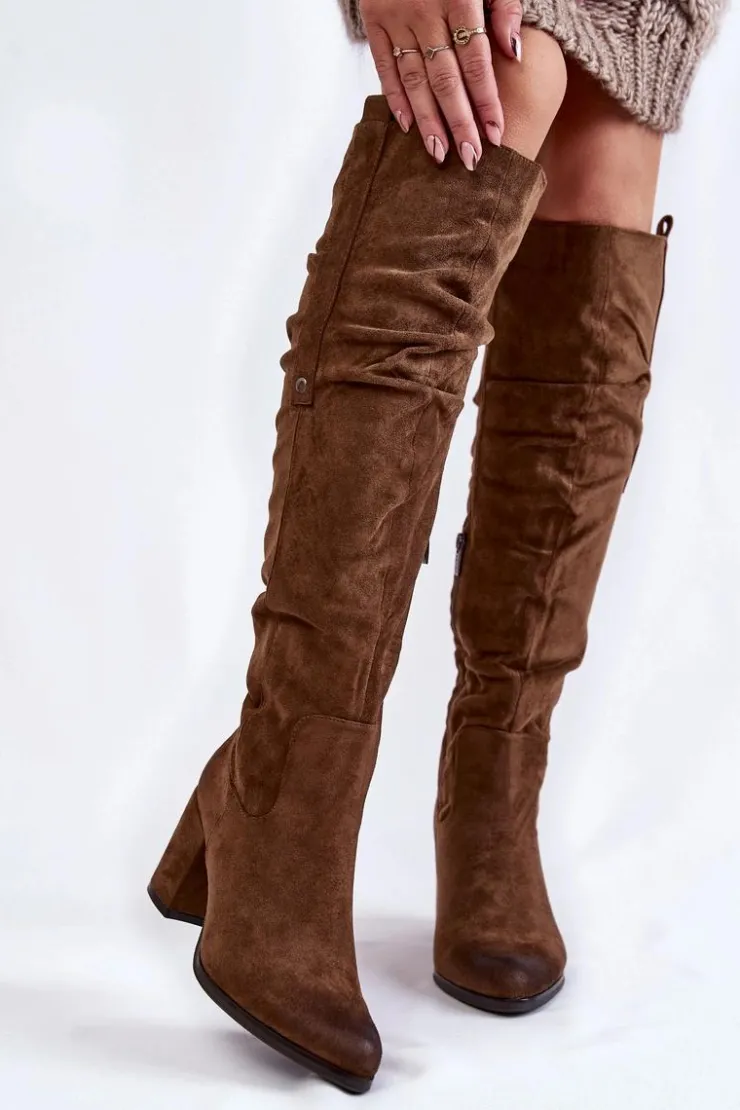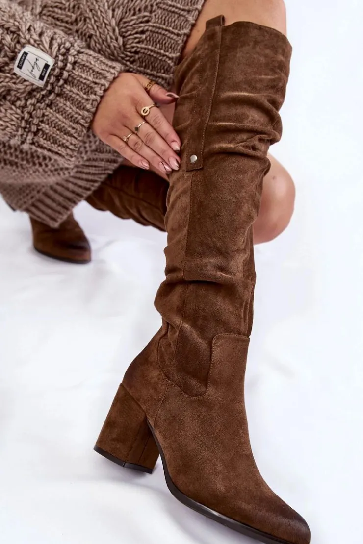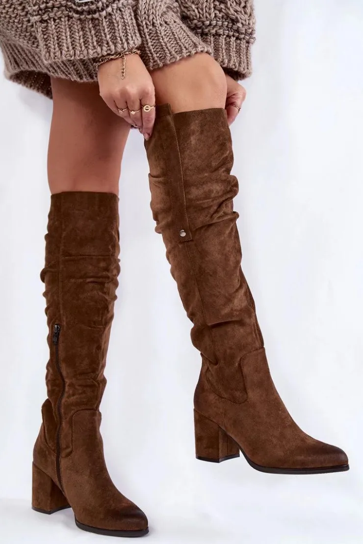 Rewelacyjne kozaki damskie zostały wykonane z wysokiej jakości eko zamszu z dbałością o szczegóły. Model ten został osadzony na niskim obcasie w postaci słupka. Kozaki z cholewką za kolano zostały przyozdobione delikatnym marszczeniem oraz pojedynczą napą z boku cholewki. Zapinane na suwak oraz wsuwane. Dodatkowo zapiętek jest usztywniany. Kozaki zostały ocieplone delikatnym futerkiem. Przy wyborze rozmiaru prosimy sugerować się tabelą rozmiarów.