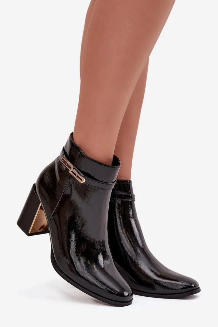Botki wykonane są z wysokiej jakości lakierowanej skóry ekologicznej, dzięki czemu są trwałe, eleganckie i łatwe w pielęgnacji.