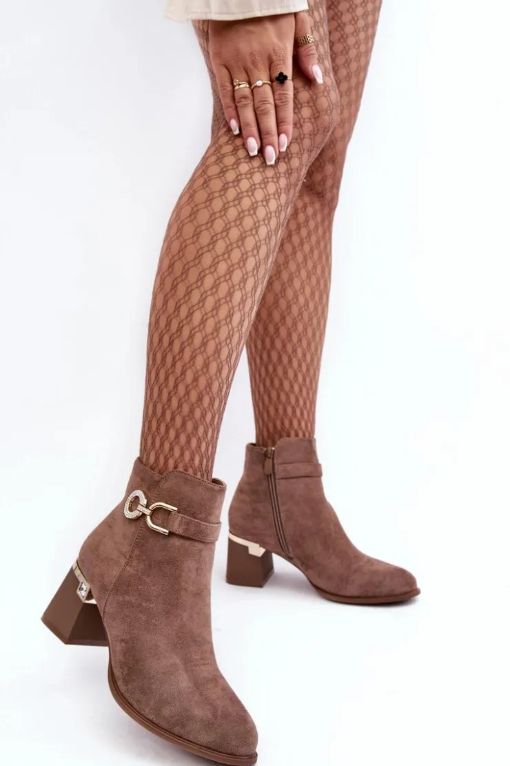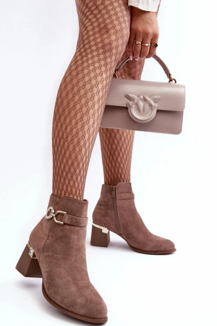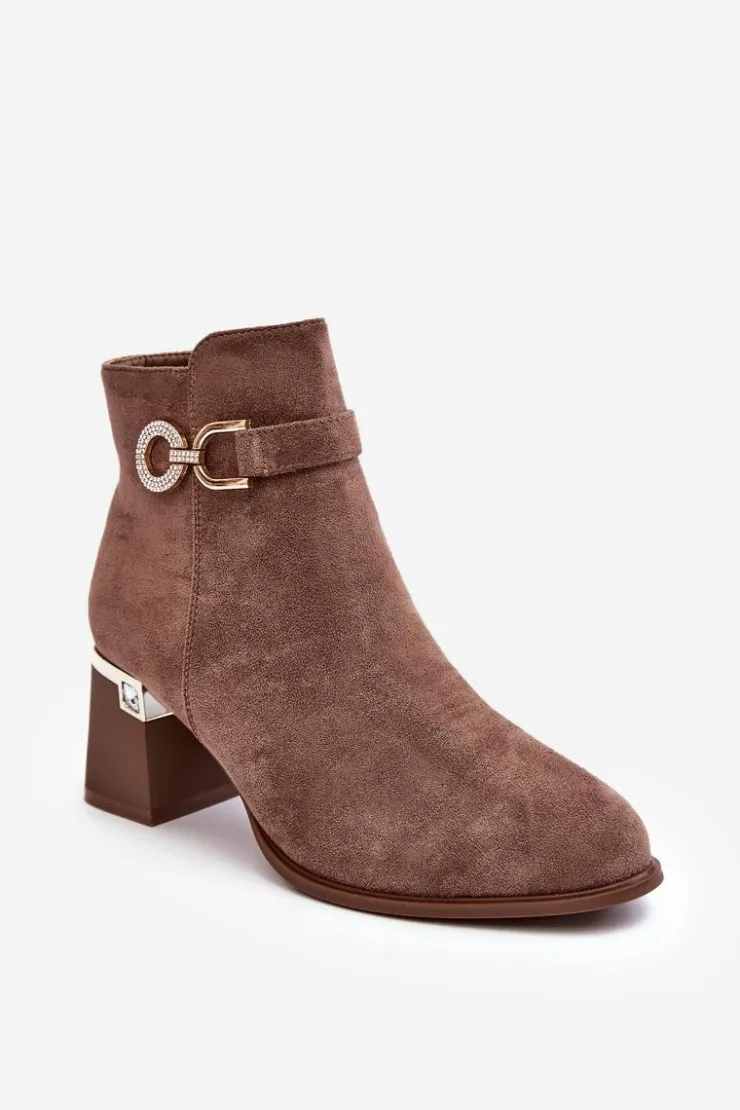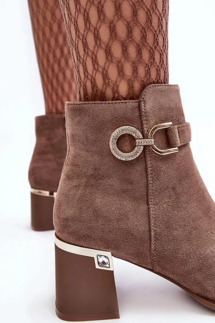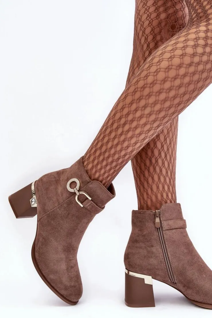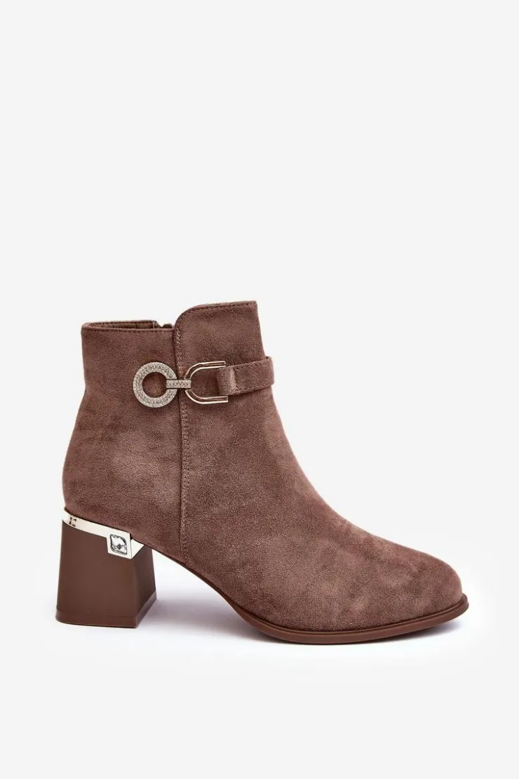 Rewelacyjne, damskie botki zostały osadzone na zdobionym obcasie w postaci słupka. Model ten został wykonany z eko zamszu. Na cholewce z boku umieszczono ozdobę z dżetami, natomiast z drugiej strony suwak ułatwiający zakładanie obuwia. Środek tego botka nie jest ocieplony. Usztywniony zapiętek zapewni stabilizację. Przy wyborze rozmiaru prosimy sugerować się tabelą rozmiarów.