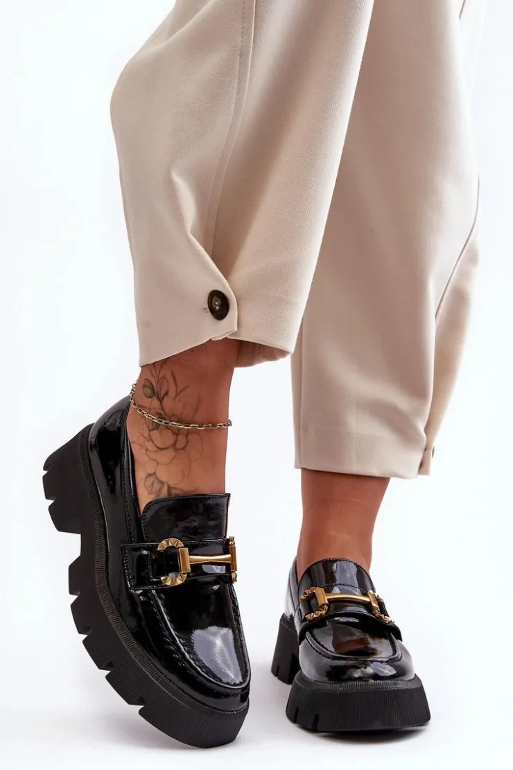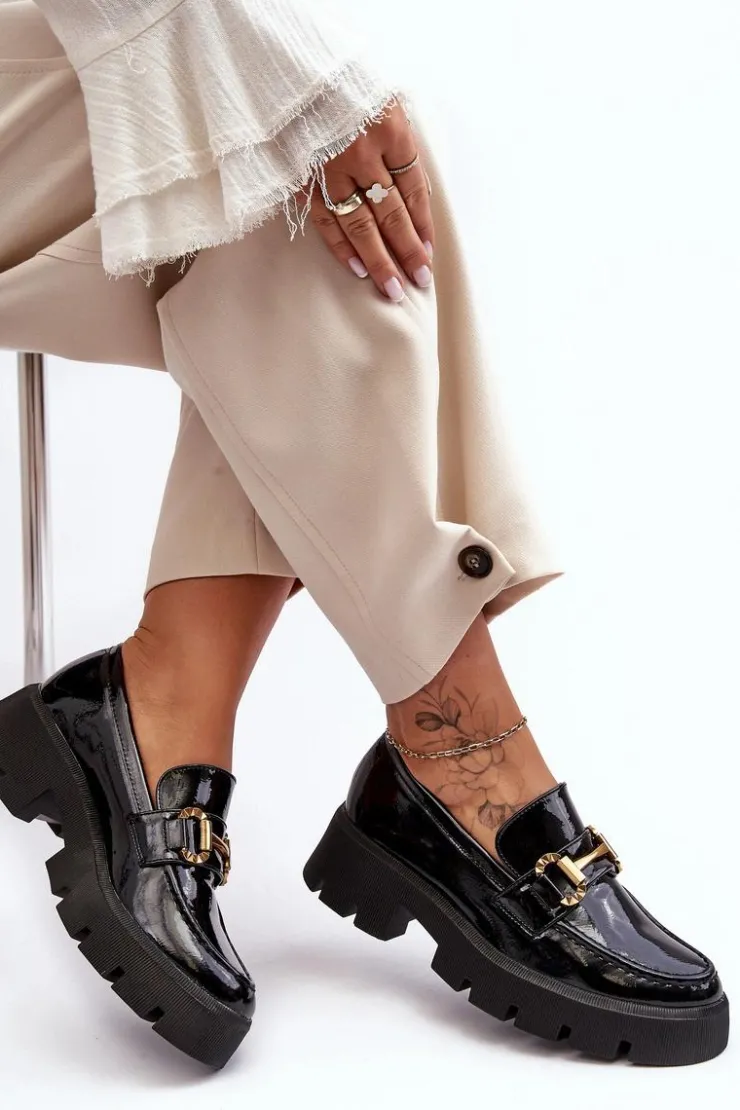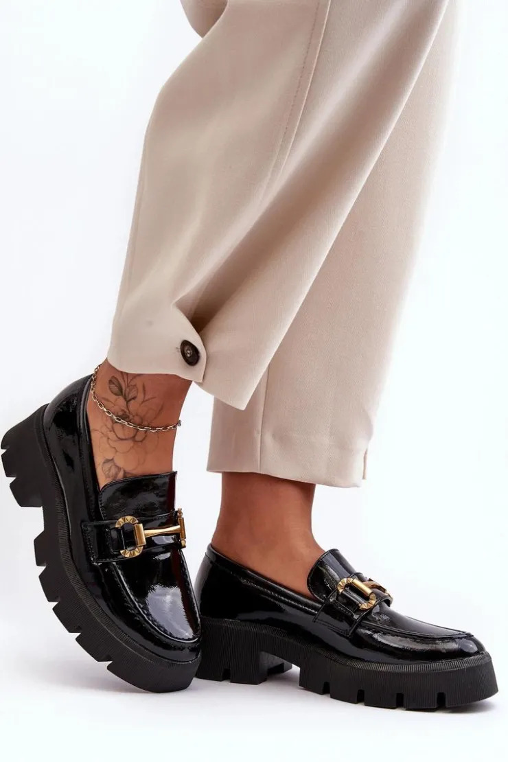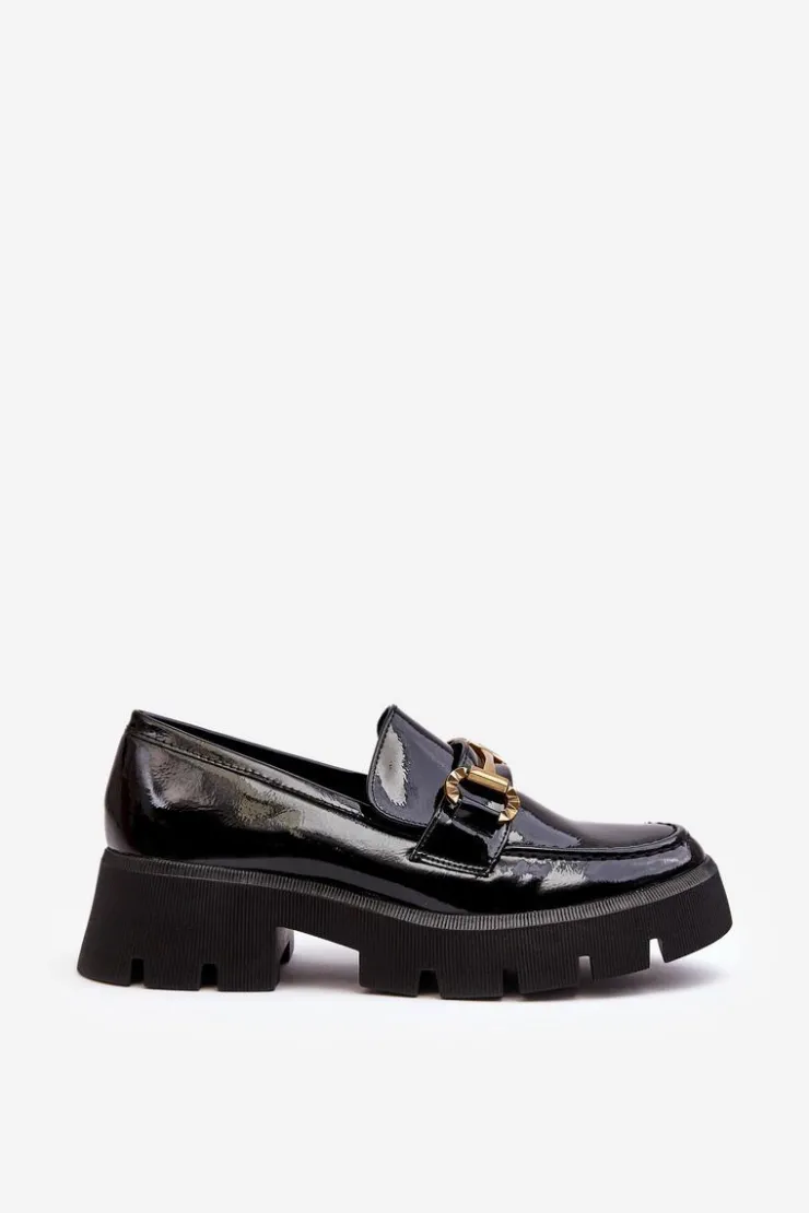 Boto Mokasyny Damskie Lakierowane*Damskie Lakierowane Półbuty Loafery Z Ozdobą Czarne Peuria