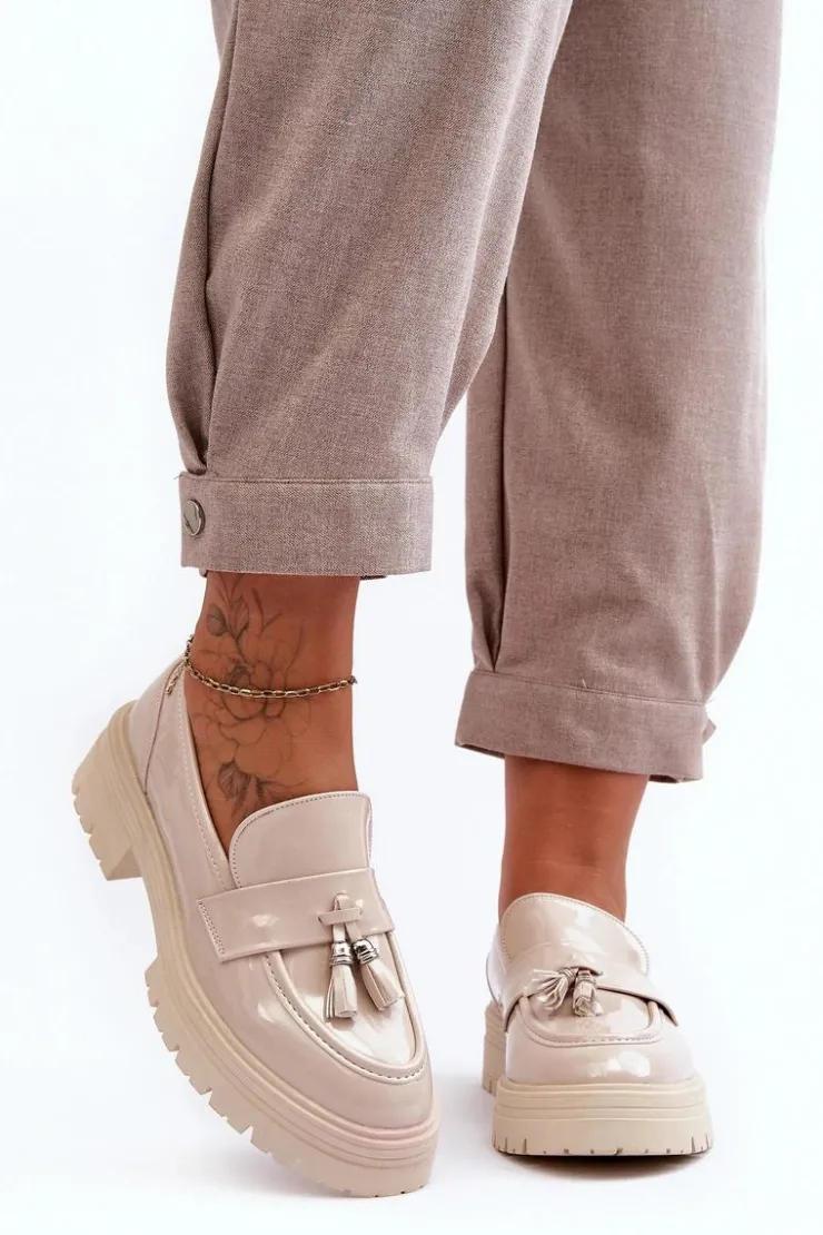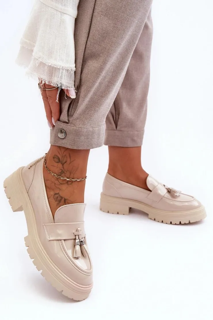Modne półbuty damskie wykonane z eko skóry. Osadzone na płaskim obcasie i grubej podeszwie. Noski zaokrąglone. Pasek z przodu ozdobiony frędzlami. Zapiętek jest usztywniony. Miękka, eko skórzana wkładka zapewni komfort podczas użytkowania. Model ten dopełni każdą stylizację – zarówno w wersji z sukienkami, jak i jeansami! Przy wyborze rozmiaru prosimy sugerować się tabelą rozmiarów.