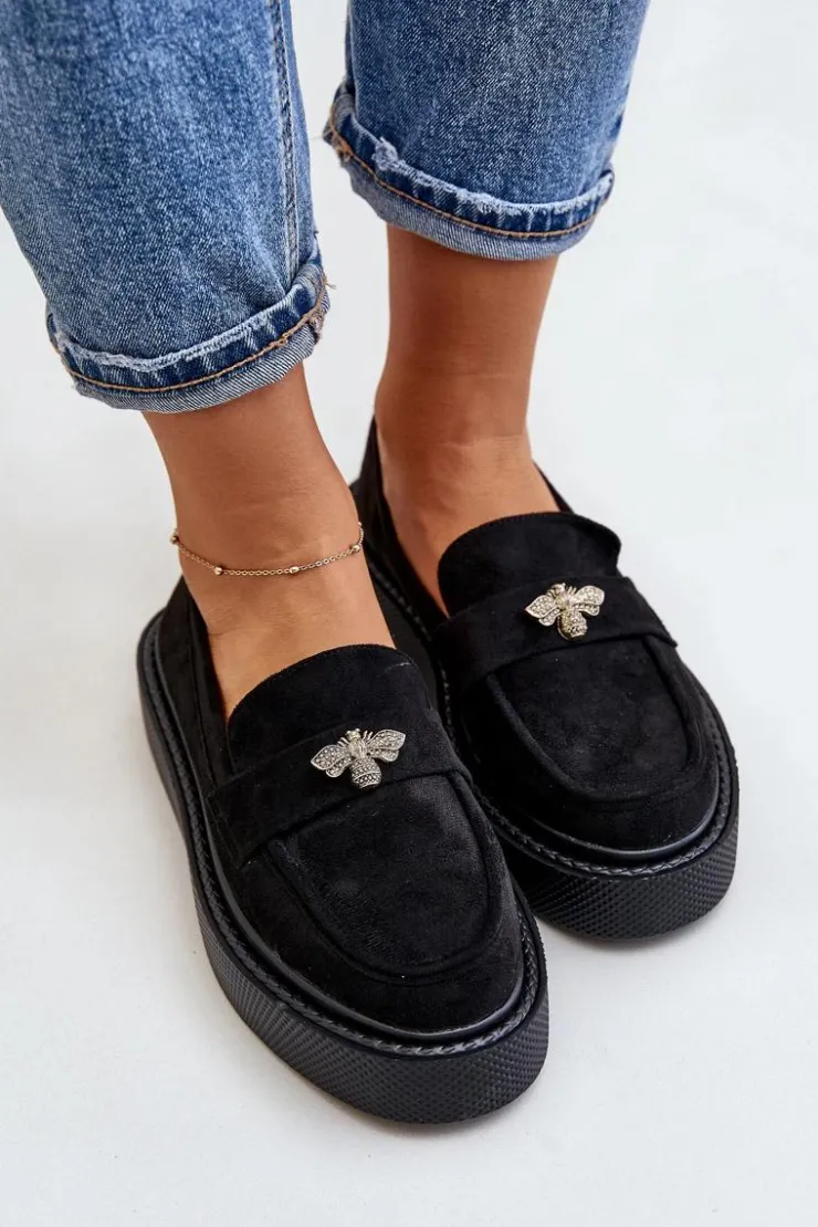 Stylowe mokasyny na platformie wykonane z eko zamszu. Z przodu ozdobione uroczą przypinką. Modne i wygodne, świetnie sprawdzą się w codziennych stylizacjach, zapewniając komfort noszenia przez cały dzień. Przy wyborze rozmiaru prosimy sugerować się tabelą rozmiarów.