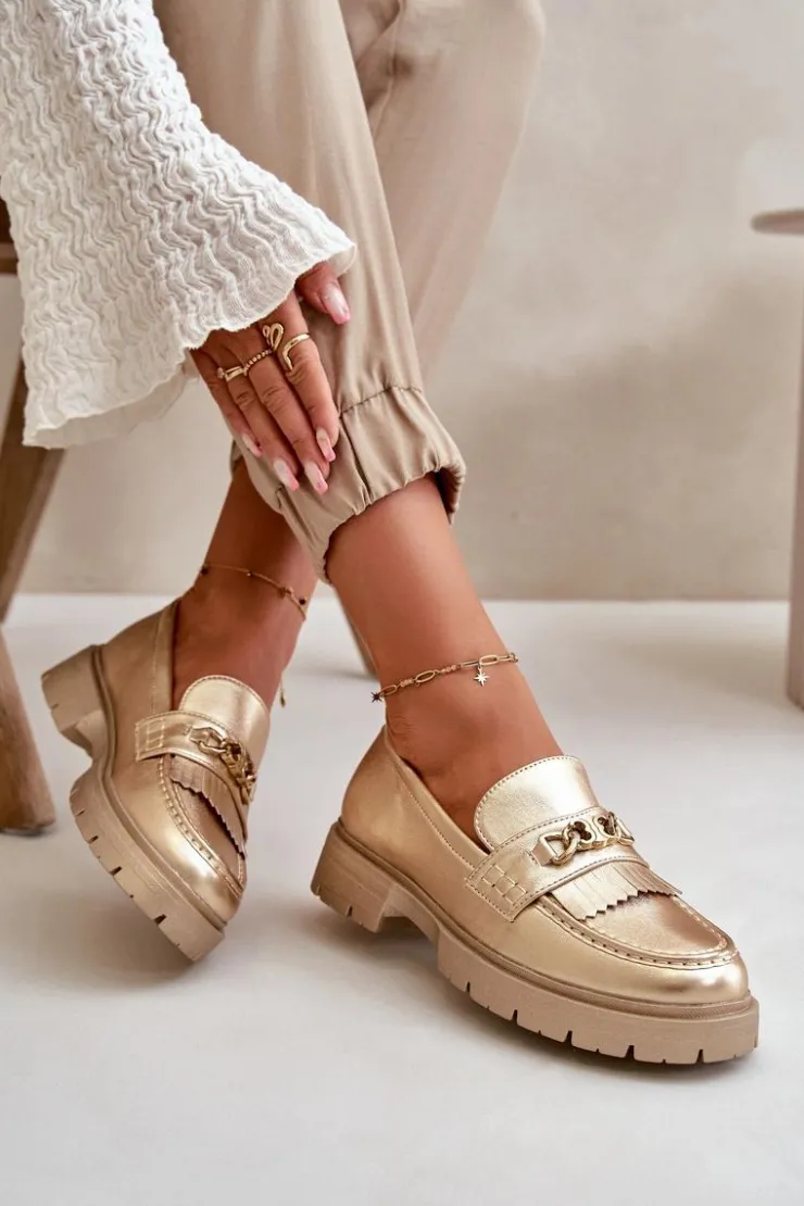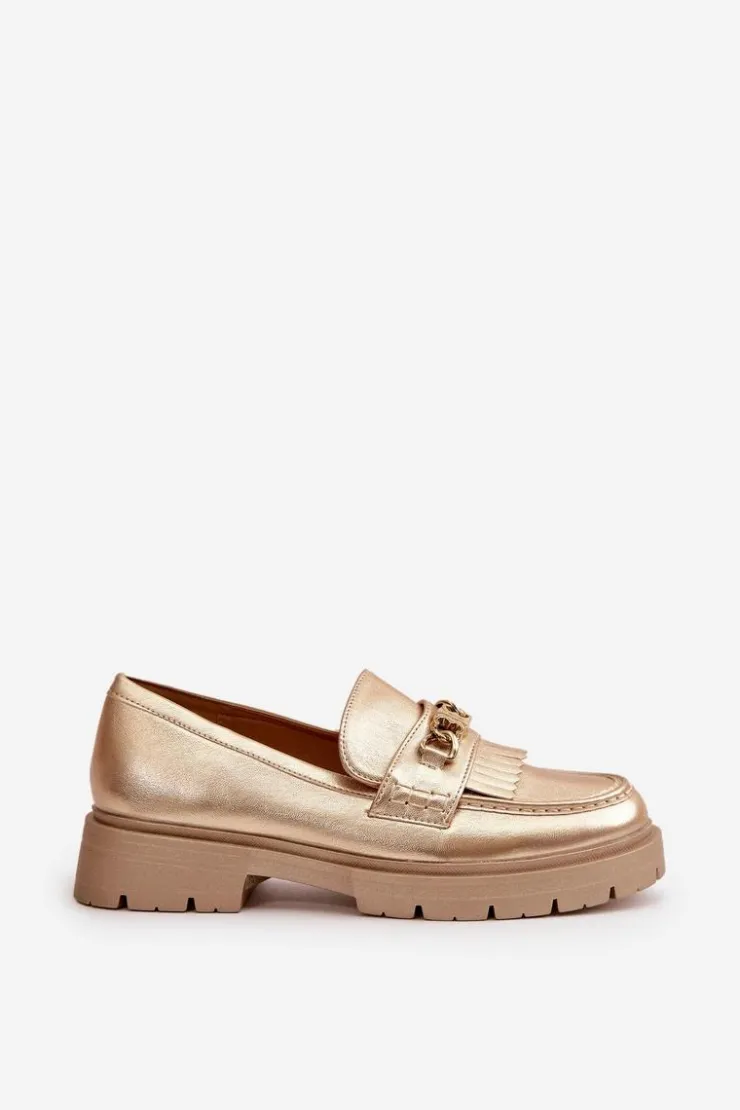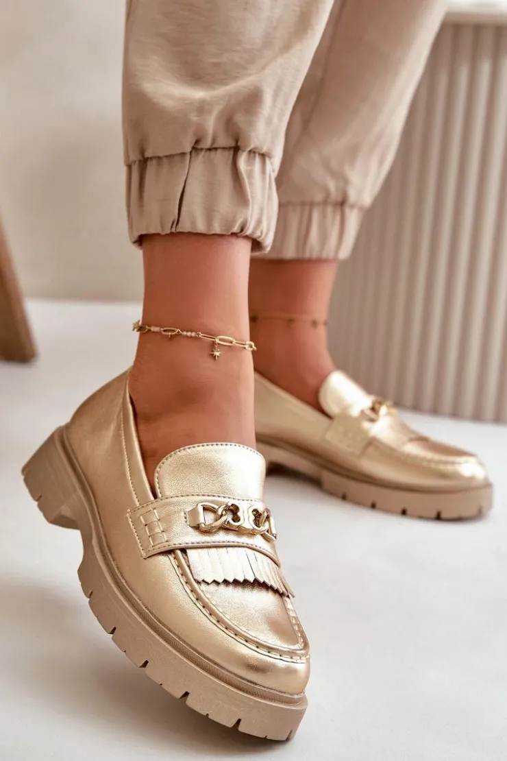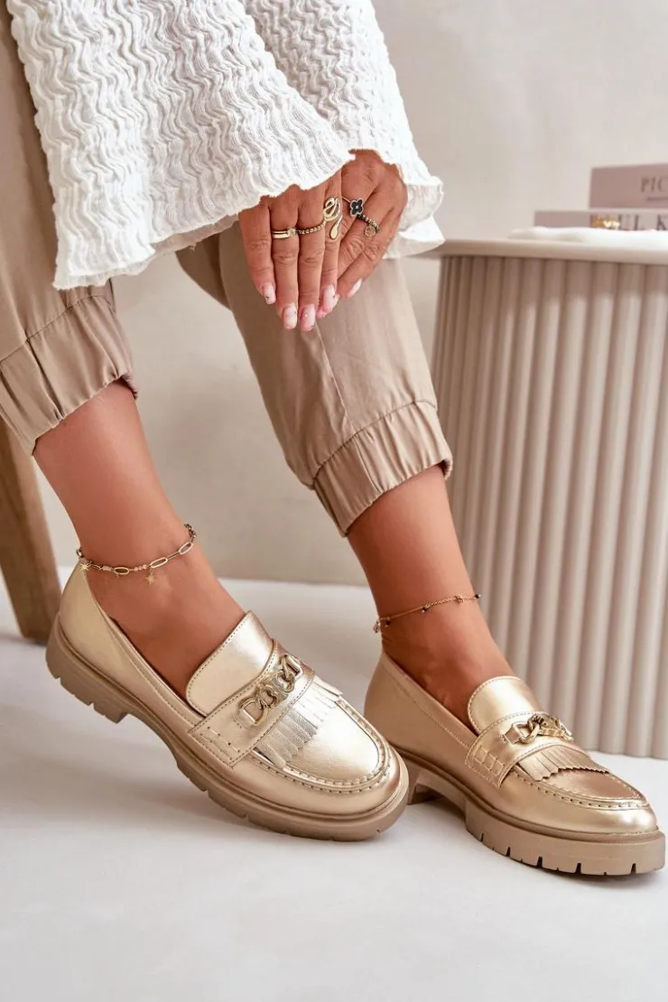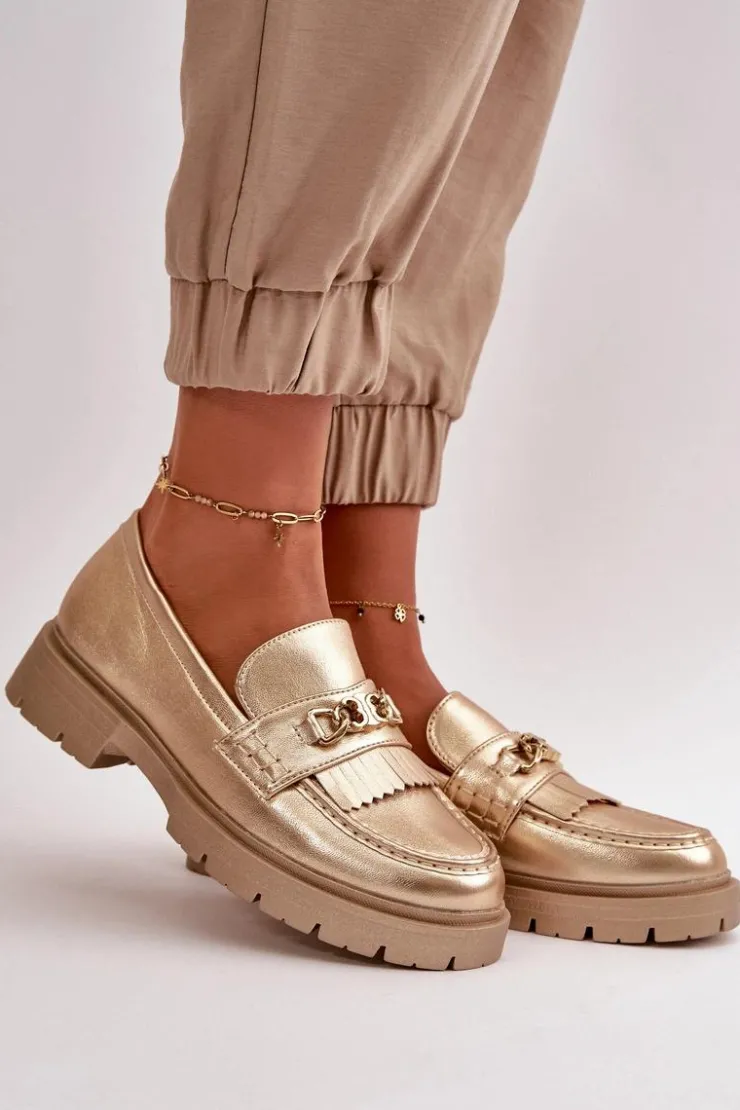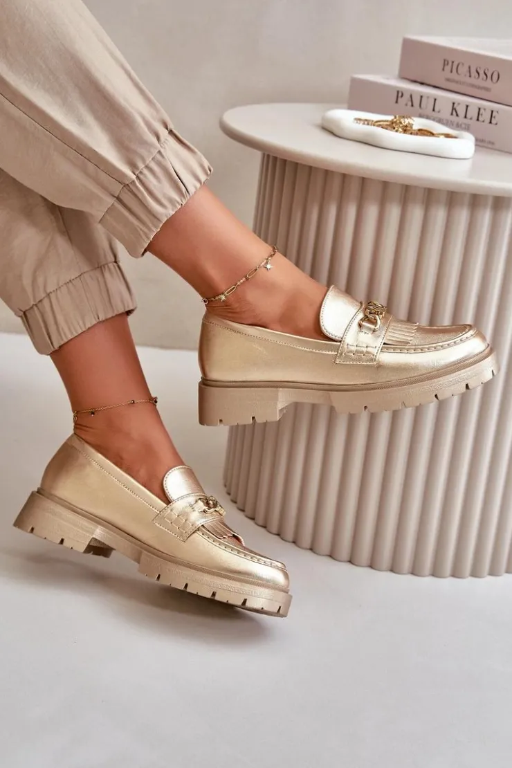 Mokasyny damskie w eleganckim stylu idealne na sezon wiosenno-jesienny. Wykonane ze skóry ekologicznej. Noski zaokrąglone. Przód zdobi złoty detal, który dodaje uroku. Osadzone na płaskim, stabilnym obcasie. Niezwykle modny fason idealnie dopełni wiele styliacji! Przy wyborze rozmiaru prosimy sugerować się tabelą rozmiarów.