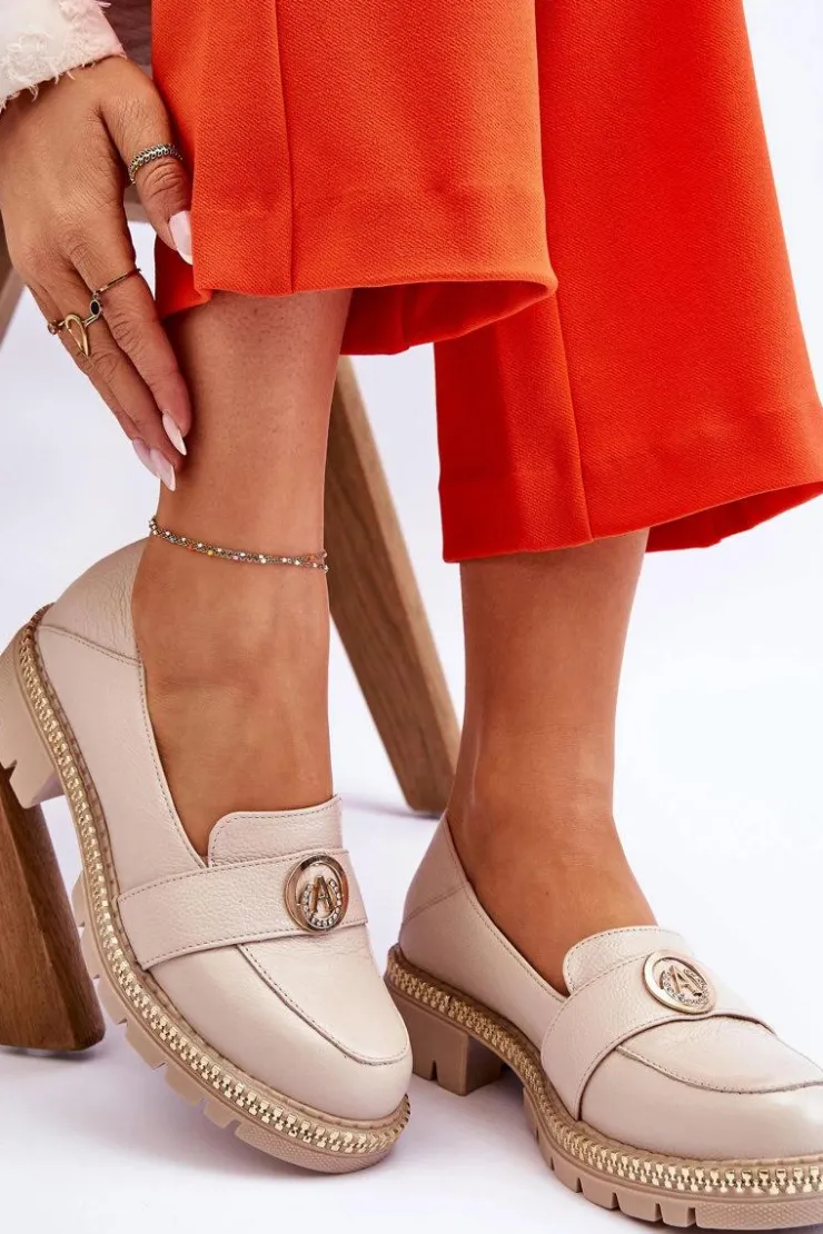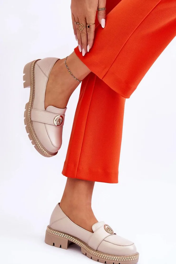 Wyjątkowe, damskie mokasyny osadzono na płaskim obcasie i platformie ozdobionej zamkiem. Model został wykonany z naturalnej skóry. Dodatkowo posiadają na paseczku ozdobę z dżetami oraz usztywniany zapiętek. Miękka, skórzana wkładka zapewni komfortowe użytkowanie. Mokasyny świetnie będą prezentować się w wielu stylizacjach! Przy wyborze rozmiaru prosimy sugerować się tabelą rozmiarów.
