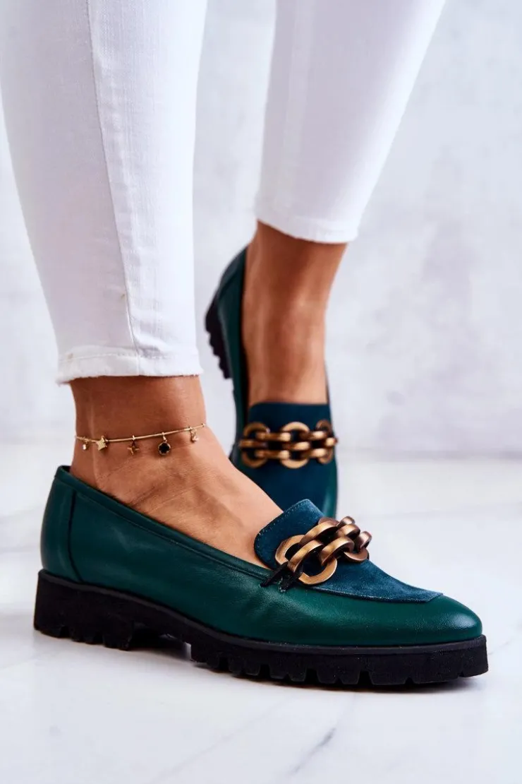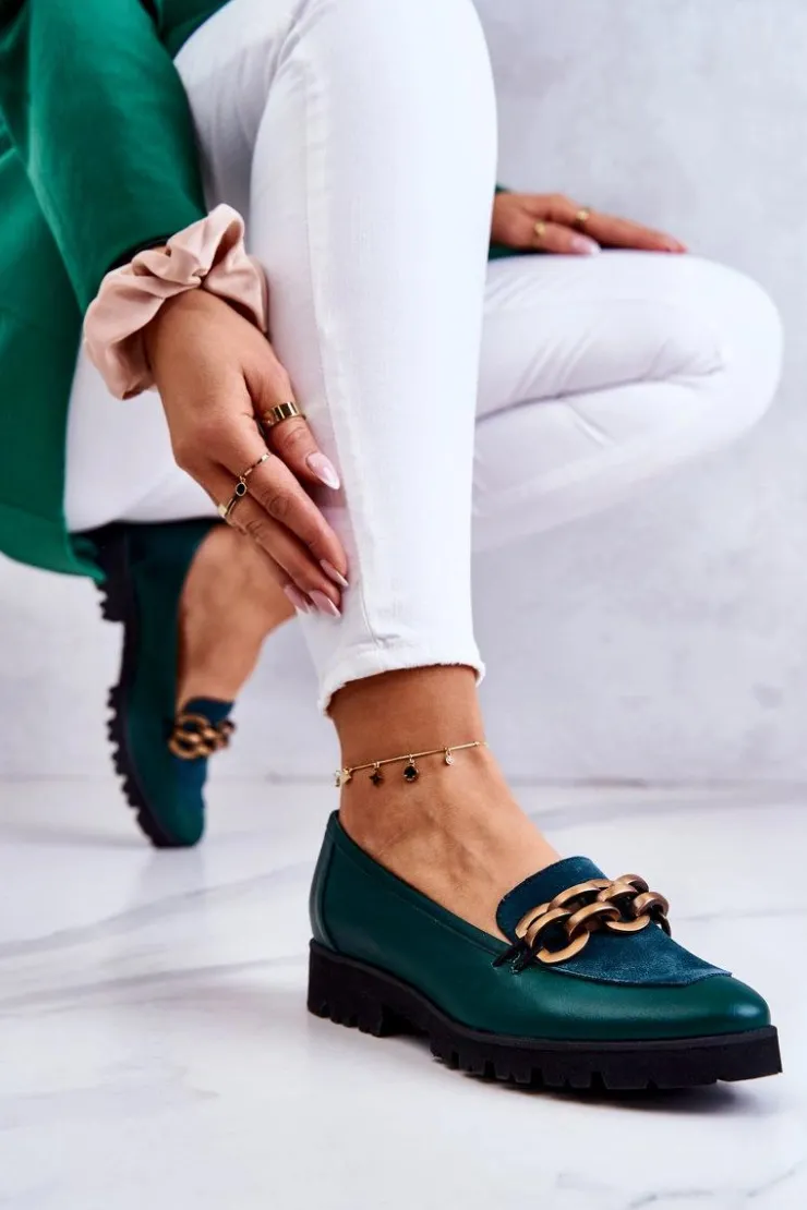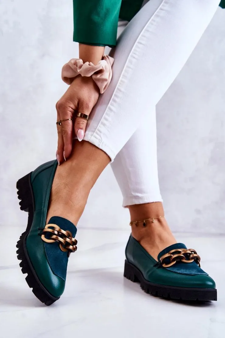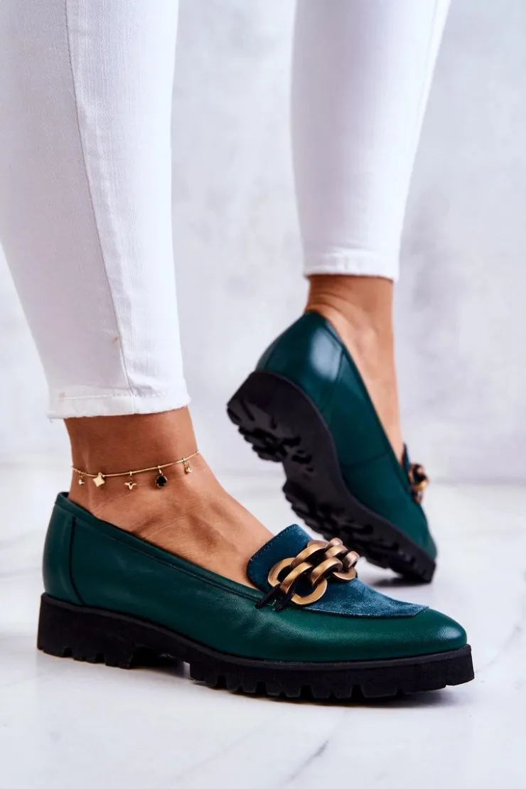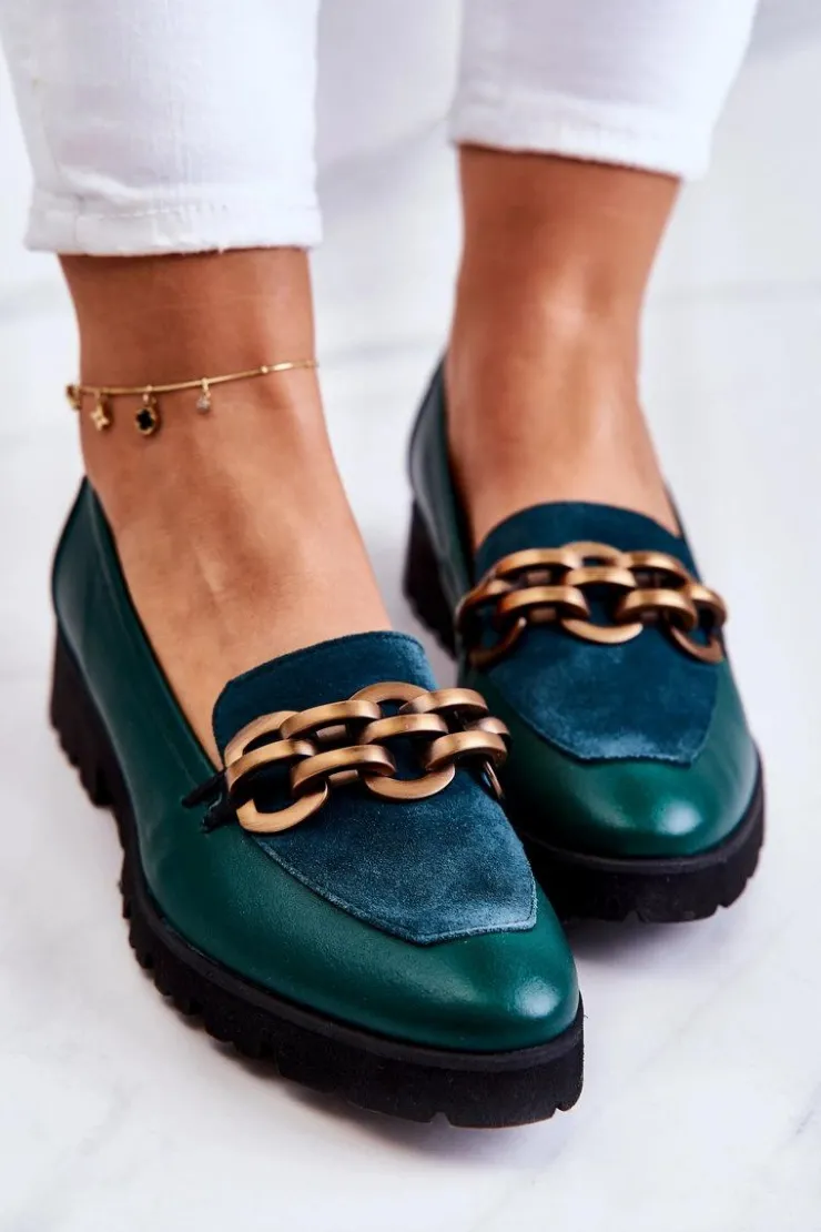 Cudne mokasyny wykonane z naturalnej skóry ze wstawką z naturalnego zamszu. Posiadają usztywniany zapiętek. Z przodu znajduje się elegancka ozdoba w postaci łańcucha. Nosek zakryty, w kształcie migdała. Miękka i komfortowa w użytkowaniu wkładka została wykonana z naturalnej skóry. Stabilny, płaski obcas wraz z delikatną platformą zostały wykonane z tworzywa sztucznego. Świetny model na wiele okazji! Koniecznie powinnaś mieć go w swojej kolekcji obuwia! Przy wyborze rozmiaru prosimy sugerować się tabelą rozmiarów.