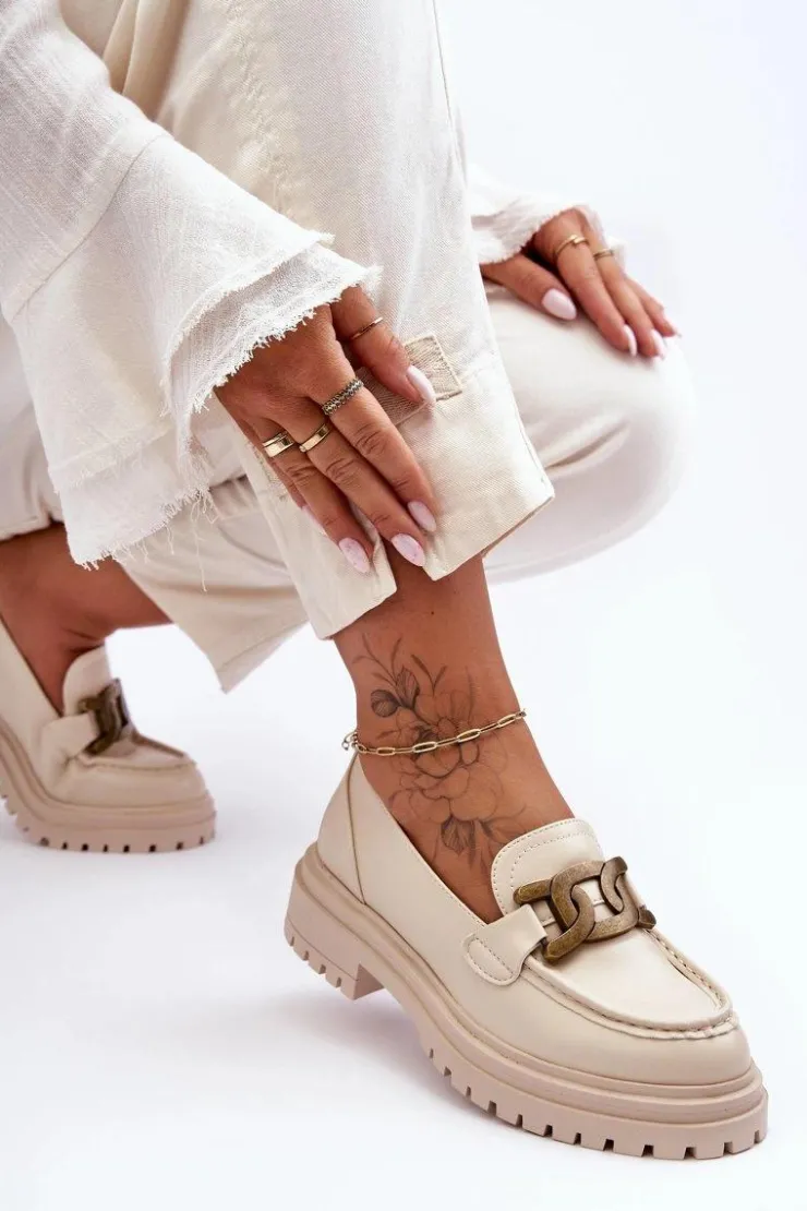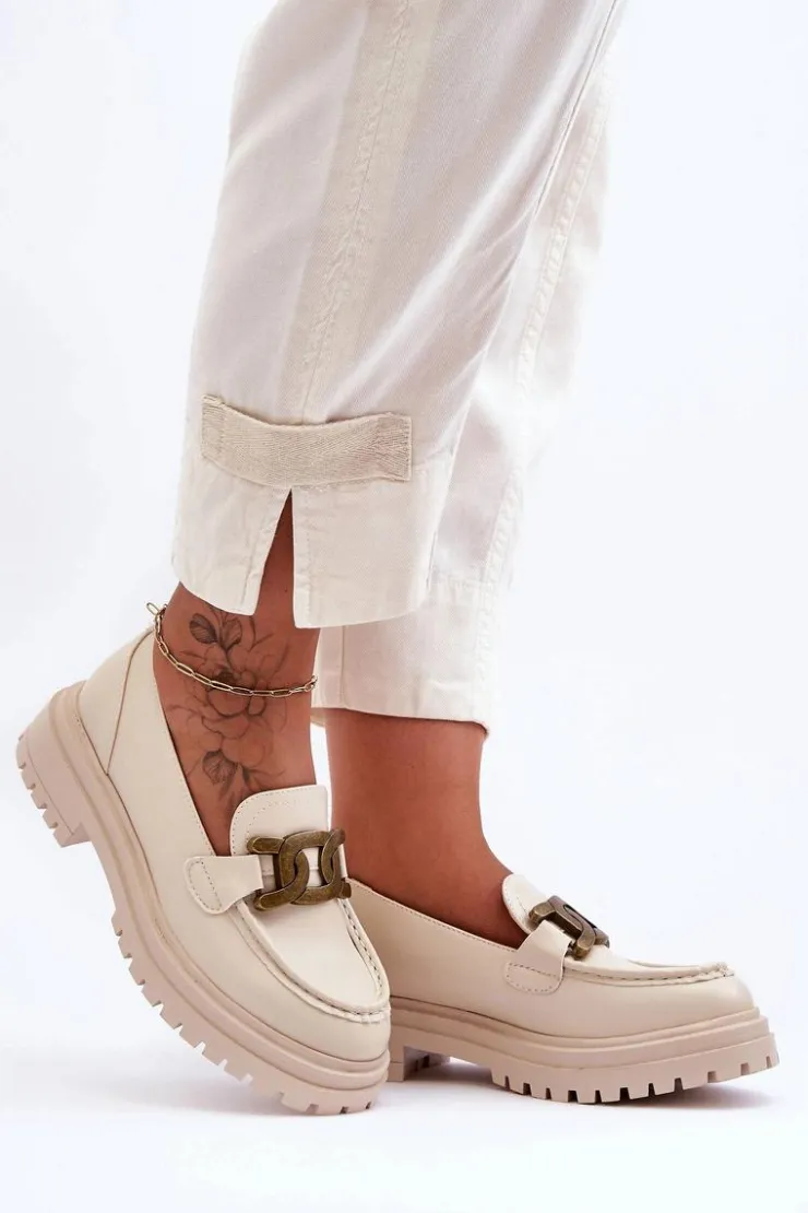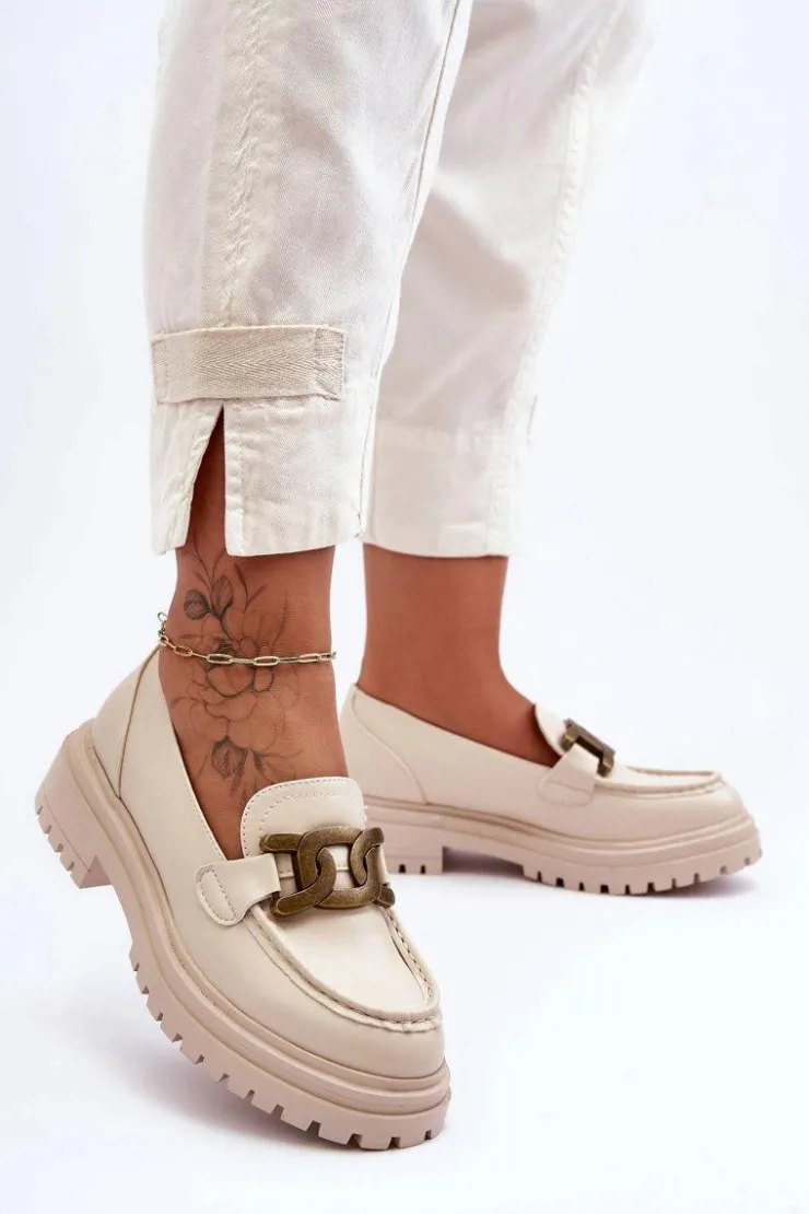 Stylowe, damskie mokasyny świetnie sprawdzą się do wielu stylizacji! Wykonane zostały z eko skóry. Model ten osadzony jest na masywnej platformie i płaskim obcasie. Z przodu znajduje się ozdoba. Koniecznie powinnaś je mieć! Przy wyborze rozmiaru prosimy sugerować się tabelą rozmiarów.