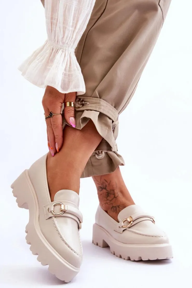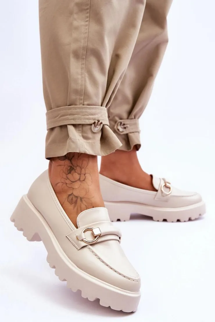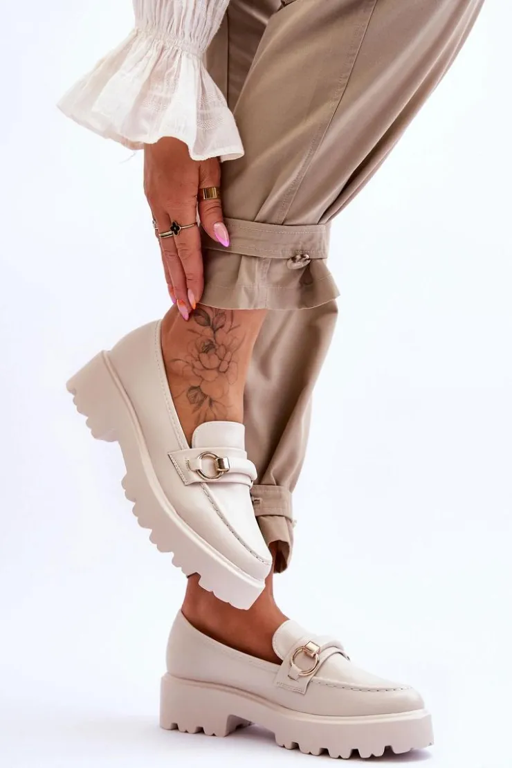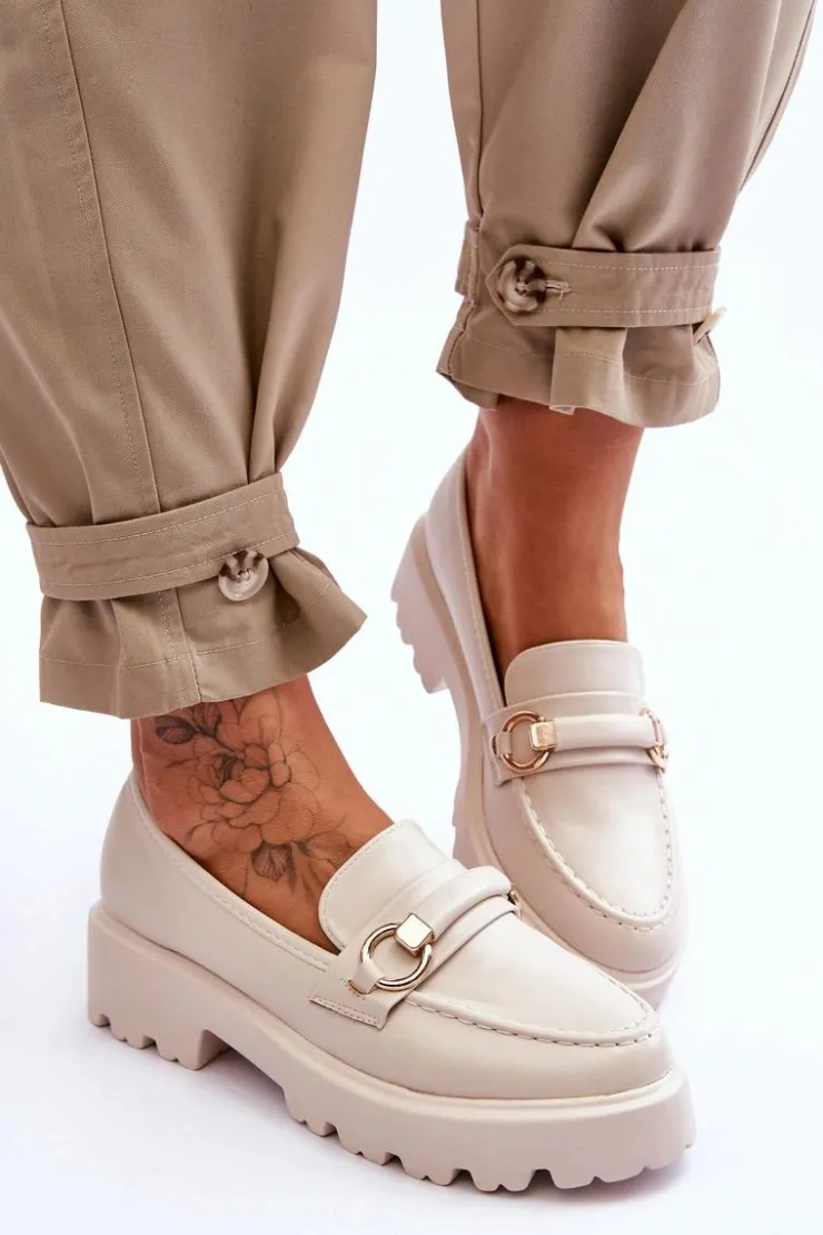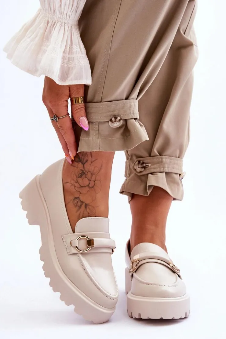 Modne, damskie mokasyny zostały osadzone na płaskim obcasie i platformie. Posiadają z przodu ozdobny paseczek. Wykonane z eko skóry. Ten model jest niezwykle wygodny podczas użytkowania. Zapiętek w tych butach jest delikatnie usztywniany. Idealny model na sezon wiosenno-jesienny! Przy wyborze rozmiaru prosimy sugerować się tabelą rozmiarów.