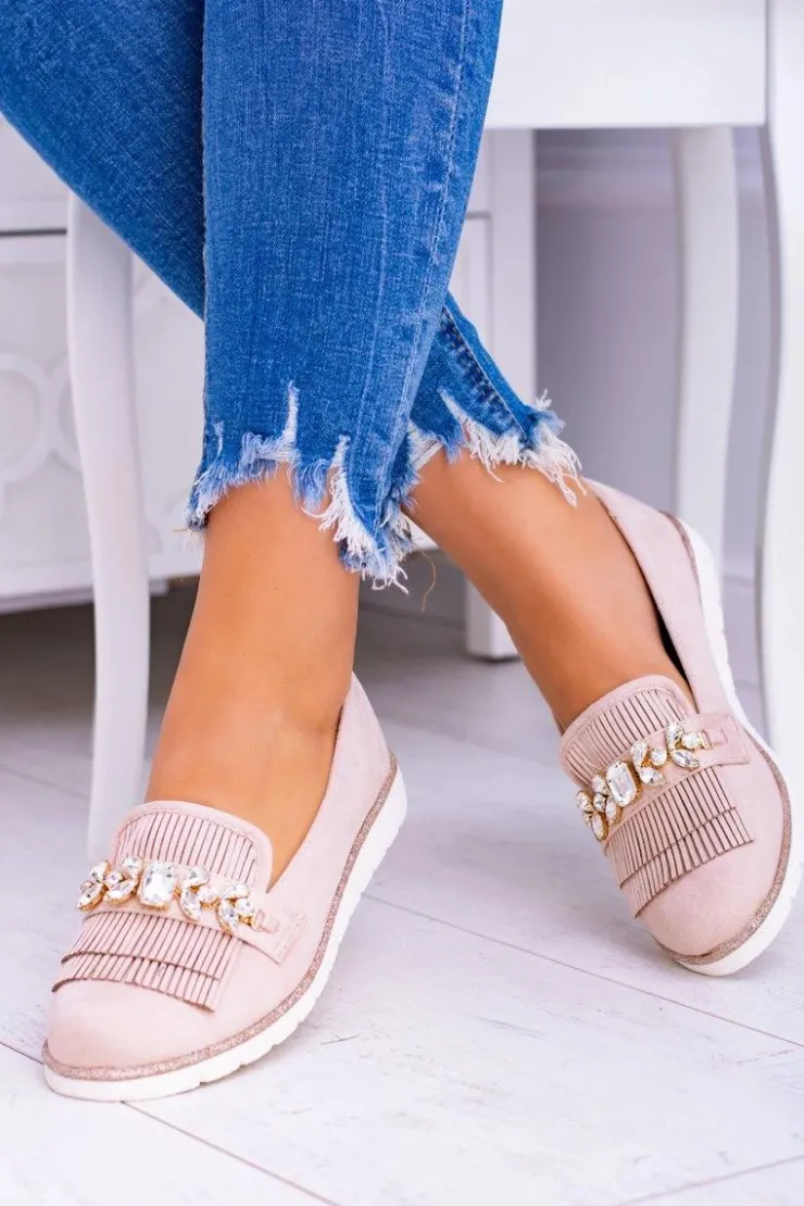 Boto Mokasyny Damskie Zamszowe*Beżowe Zamszowe Mokasyny z Kryształami Vivaro