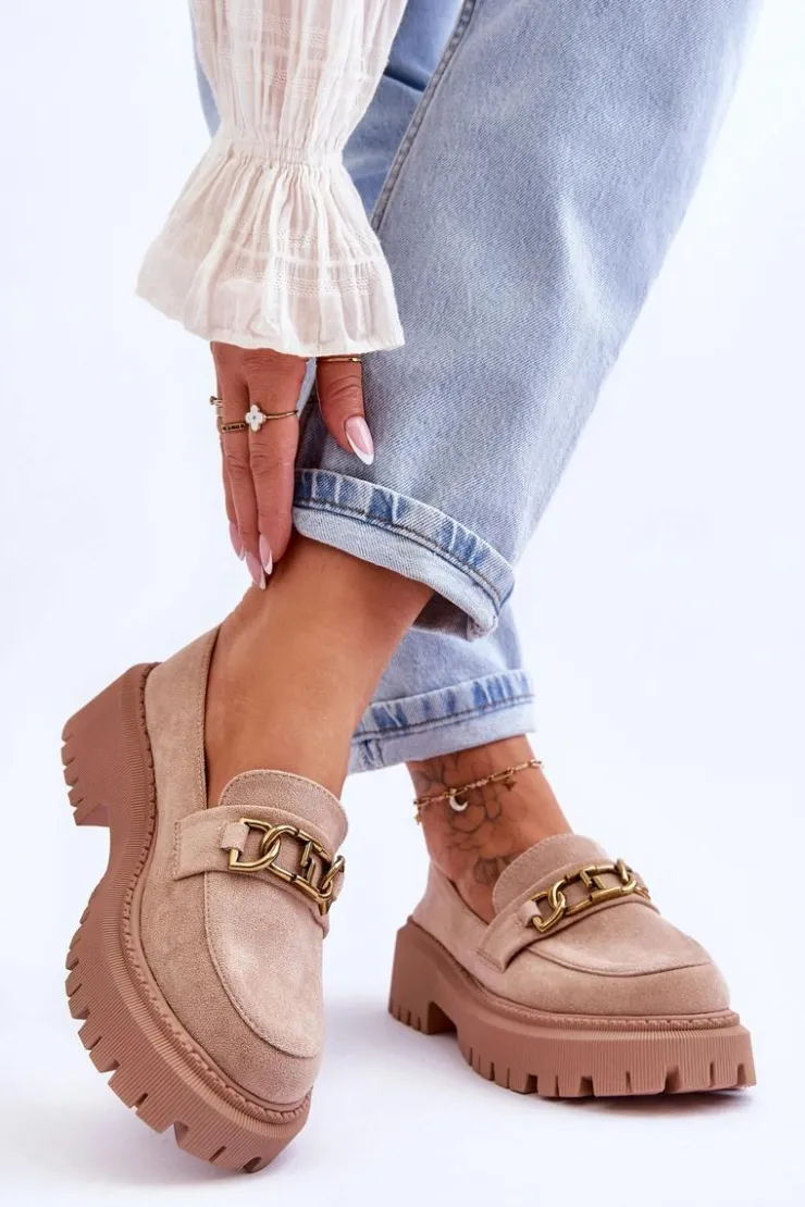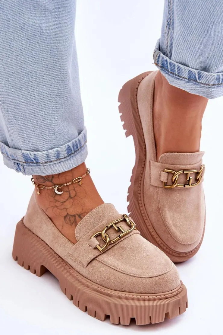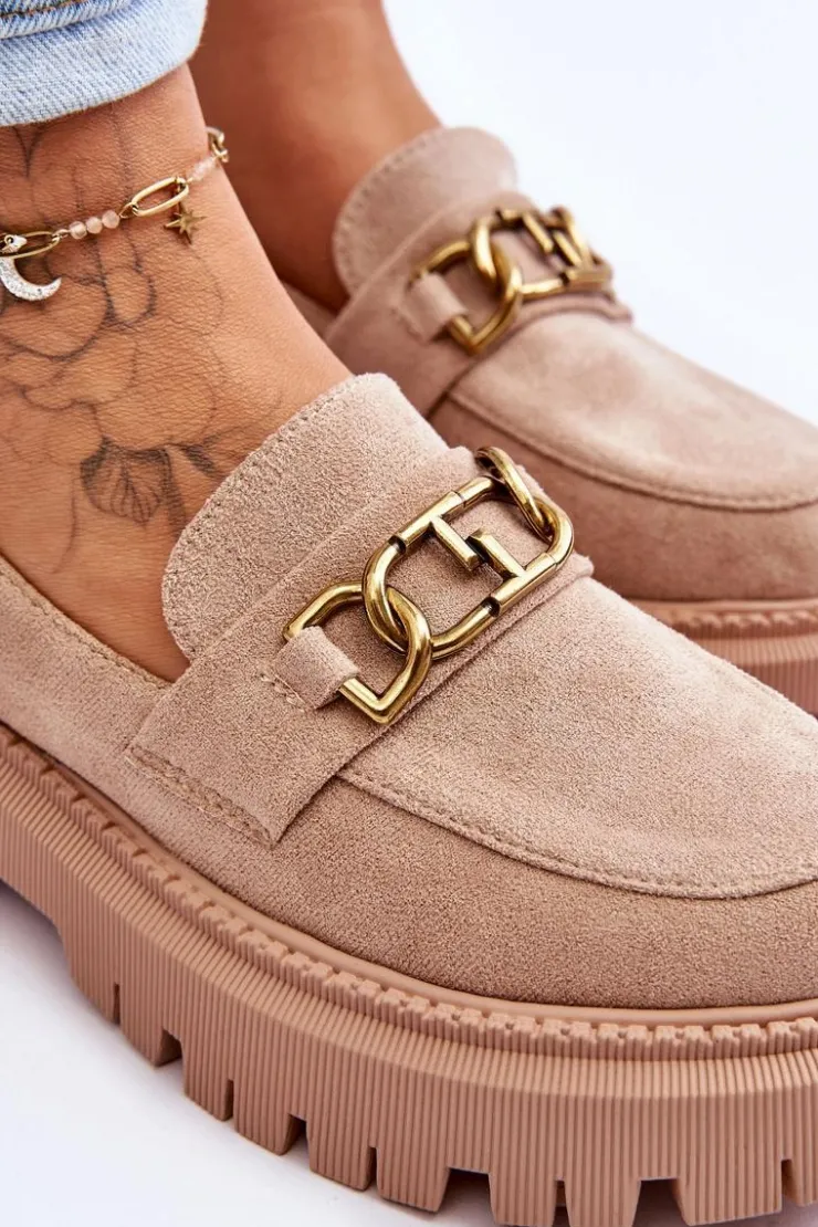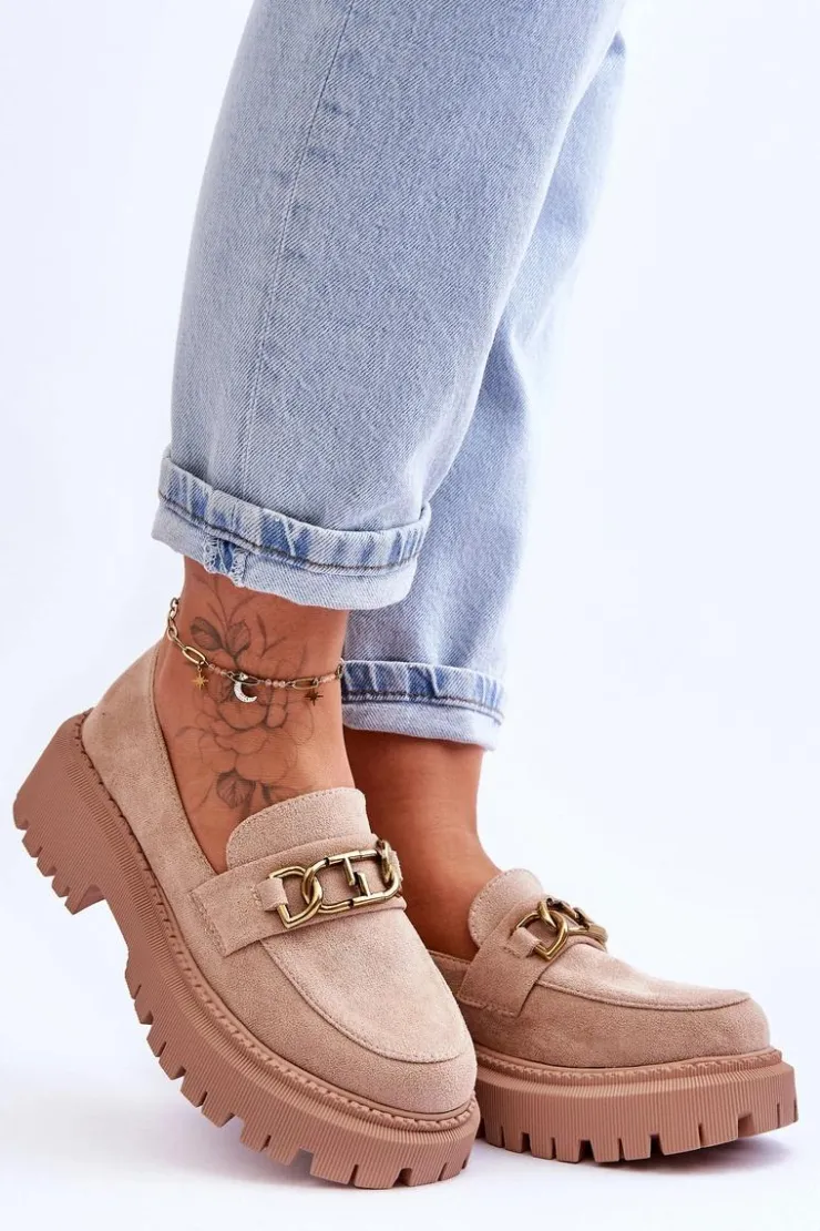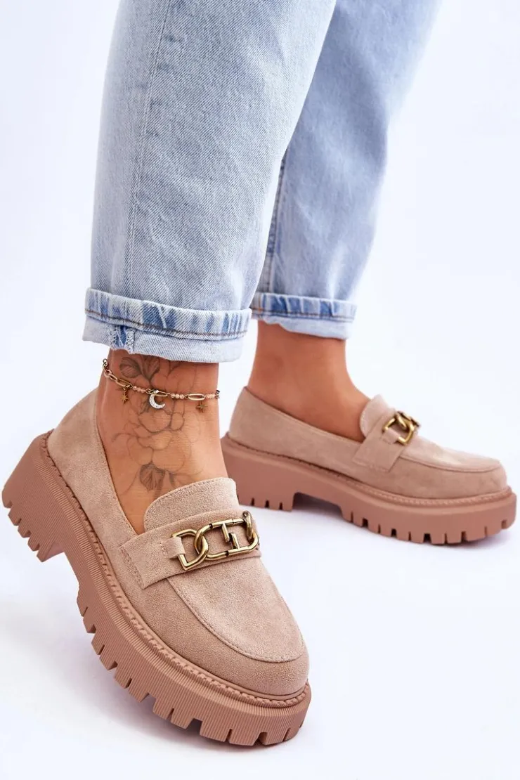 Damskie, klasyczne mokasyny zostały wykonane z eko zamszu. Na przodzie posiadają ozdobę. Model ten został osadzony na masywnym, płaskim obcasie i platformie. Mokasyny posiadają wkładkę z miękkiej eko skóry. Świetny model na sezon wiosenno-jesienny! Koniecznie powinnaś je mieć!Przy wyborze rozmiaru prosimy sugerować się tabelą rozmiarów.