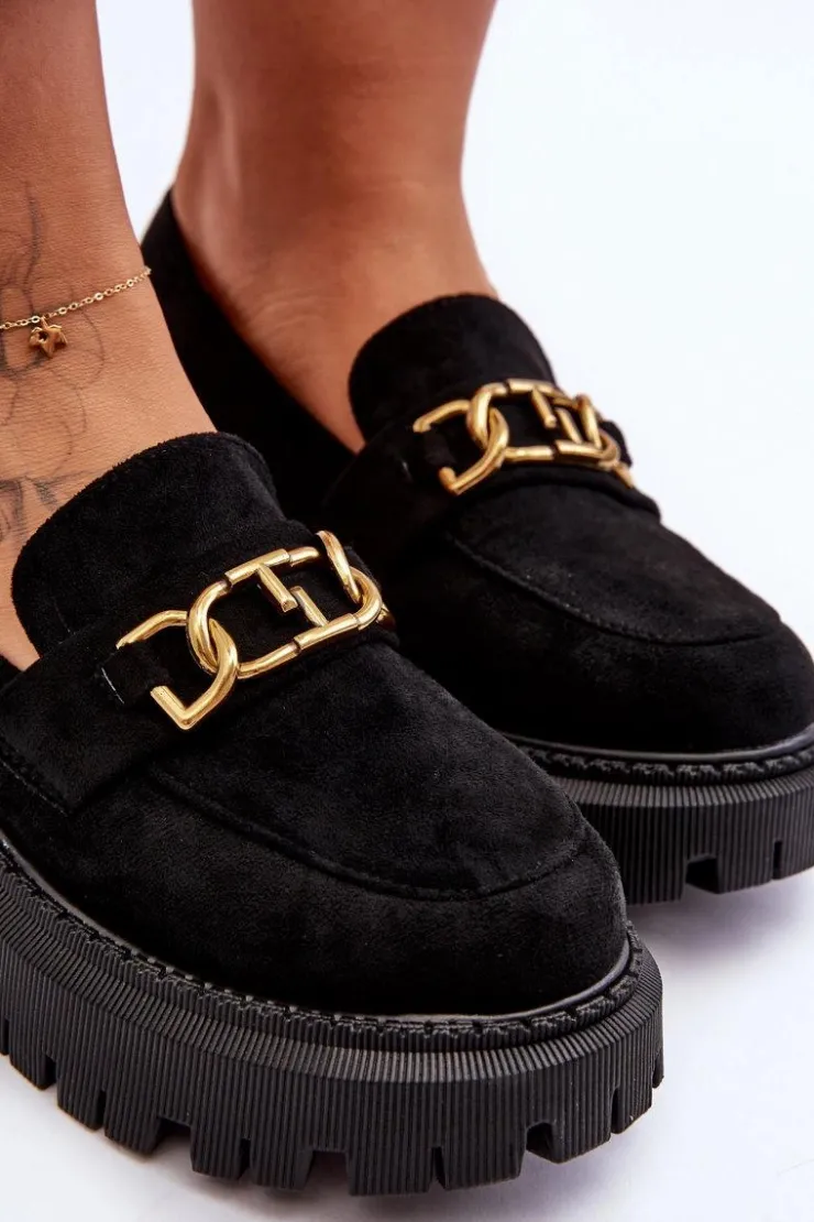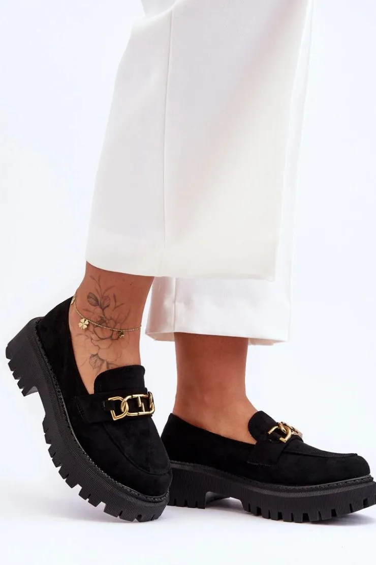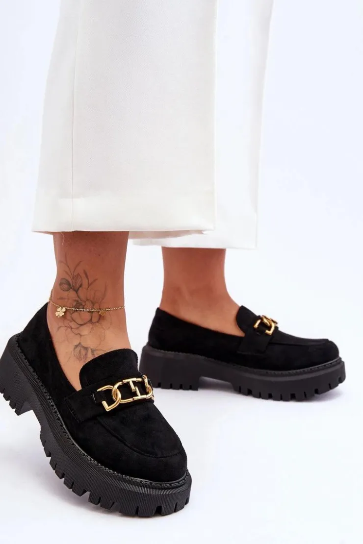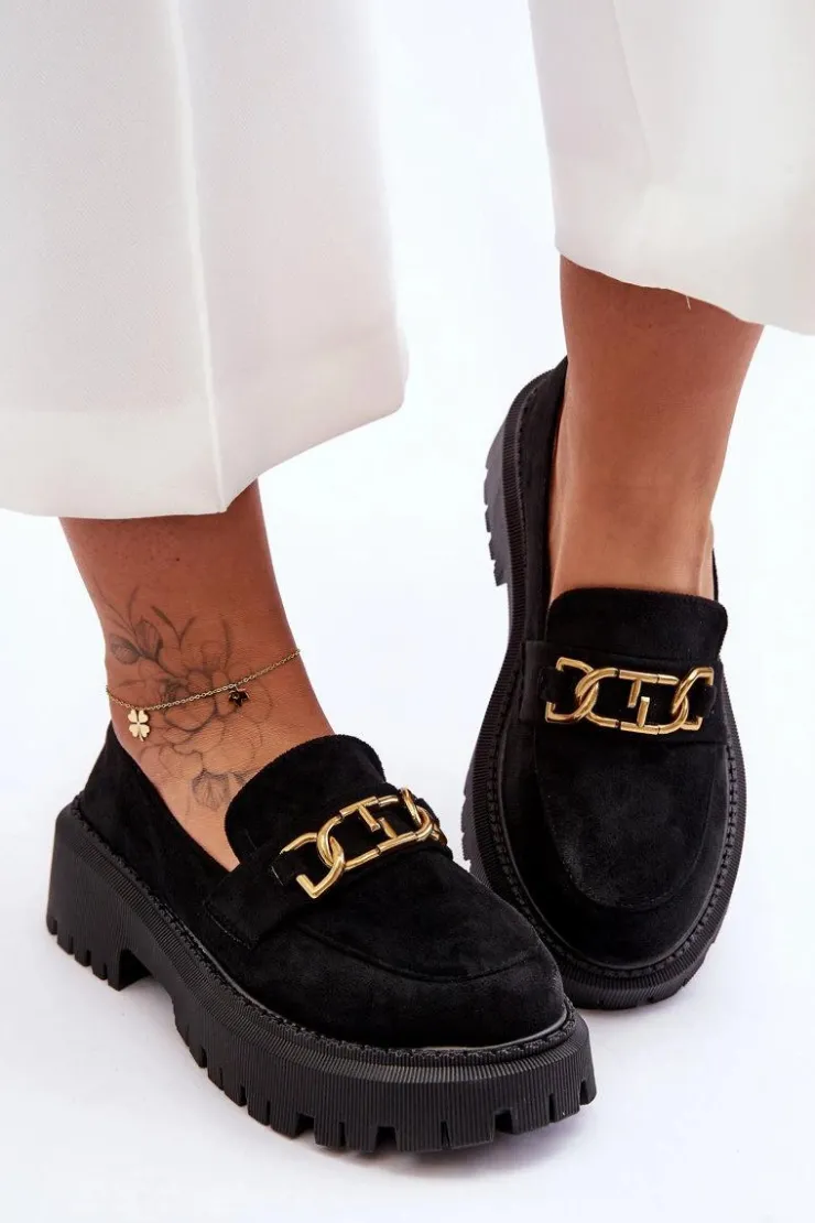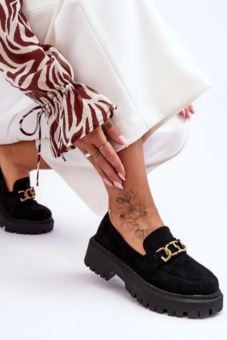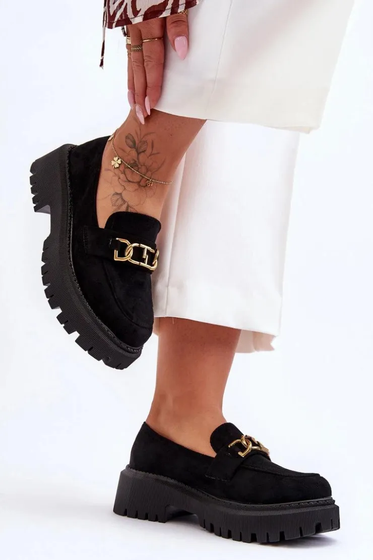 Damskie, klasyczne mokasyny zostały wykonane z eko zamszu. Na przodzie posiadają ozdobę. Model ten został osadzony na masywnym, płaskim obcasie i platformie. Mokasyny posiadają wkładkę z miękkiej eko skóry. Świetny model na sezon wiosenno-jesienny! Koniecznie powinnaś je mieć!Przy wyborze rozmiaru prosimy sugerować się tabelą rozmiarów.