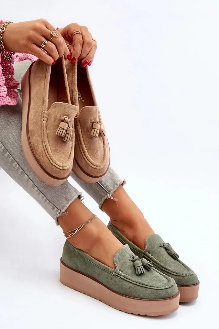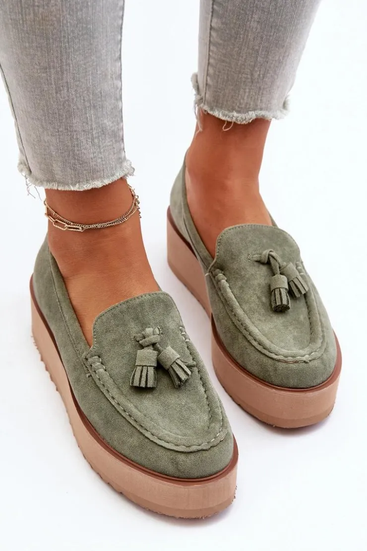 Klasyczne mokasyny damskie osadzone na platformie. Ozdobne frędzle na przodzie nadają im unikalnego stylu. Noski zaokrąglone, lekko usztywniony zapiętek. Idealne zarówno do casualowych, jak i bardziej wyrafinowanych stylizacji, te mokasyny będą doskonałym dodatkiem do Twojej garderoby! Przy wyborze rozmiaru prosimy sugerować się tabelą rozmiarów.