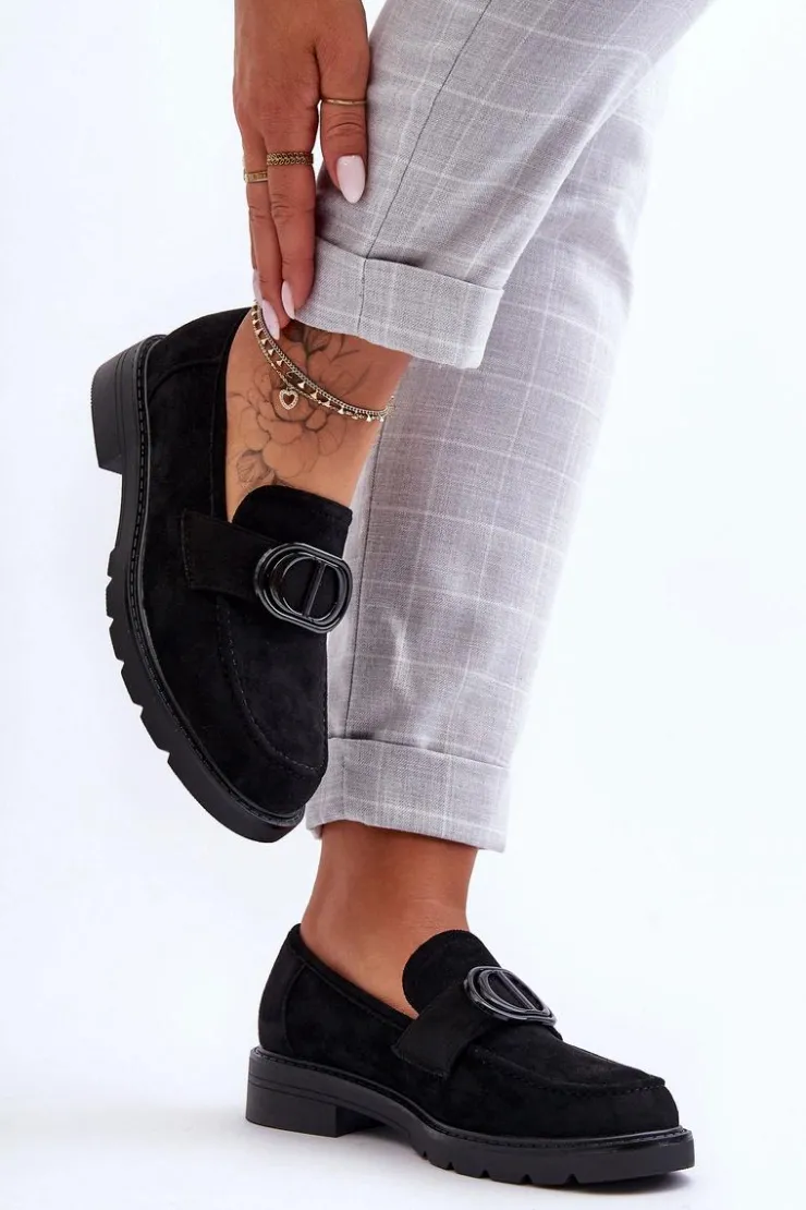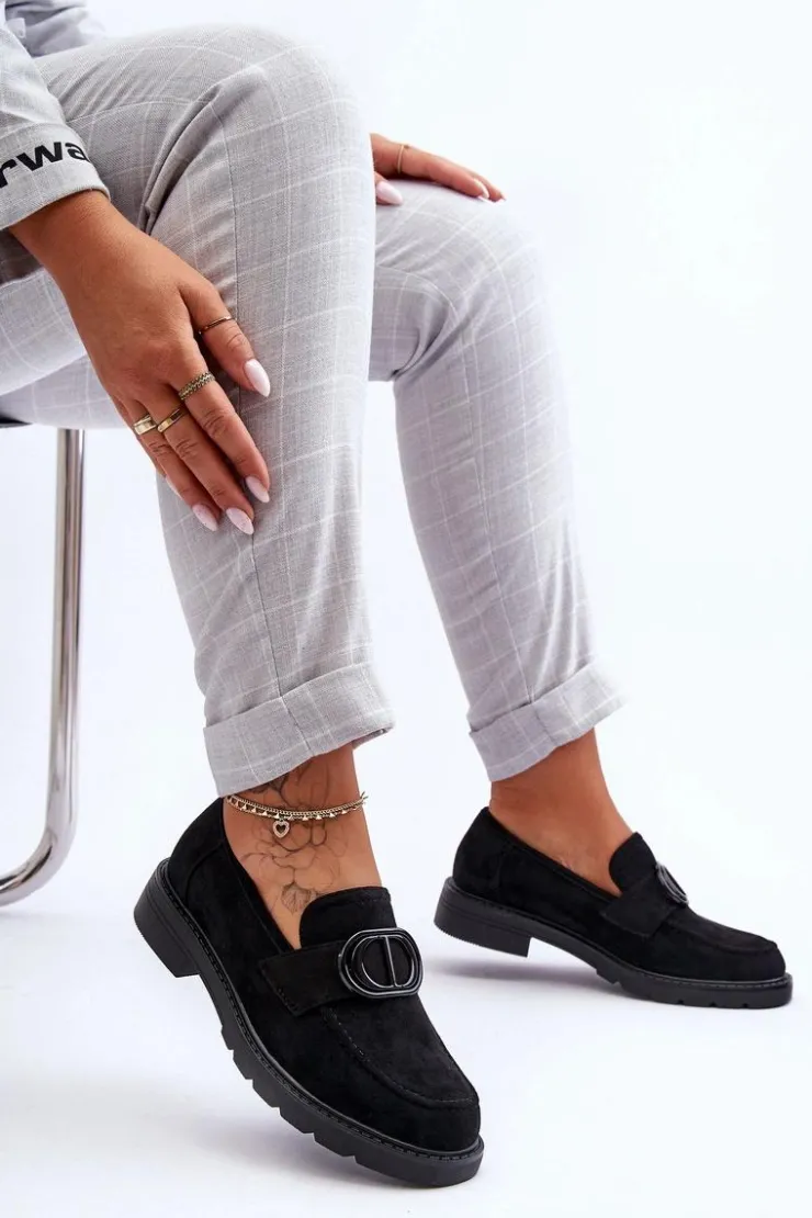 Modne damskie mokasyny zostały wykonane z eko zamszu. Buty te osadzono na masywnej platformie i płaskim obcasie. Z przodu na pasku znajduje się mała ozdoba. Eko skórzana wkładka pozwoli na wygodne użytkowanie obuwia. Idealne do wiosenno-jesiennych stylizacji! Przy wyborze rozmiaru prosimy sugerować się poniższą tabelą rozmiarów.