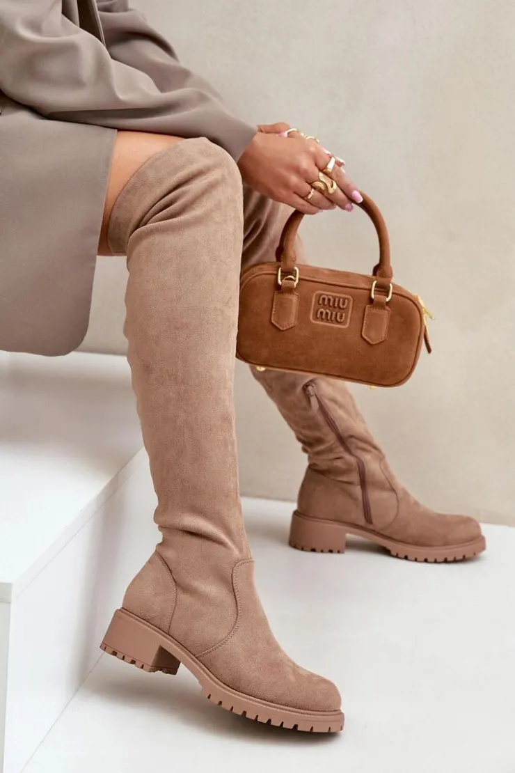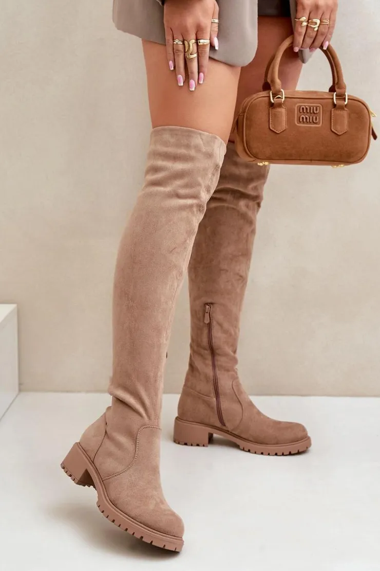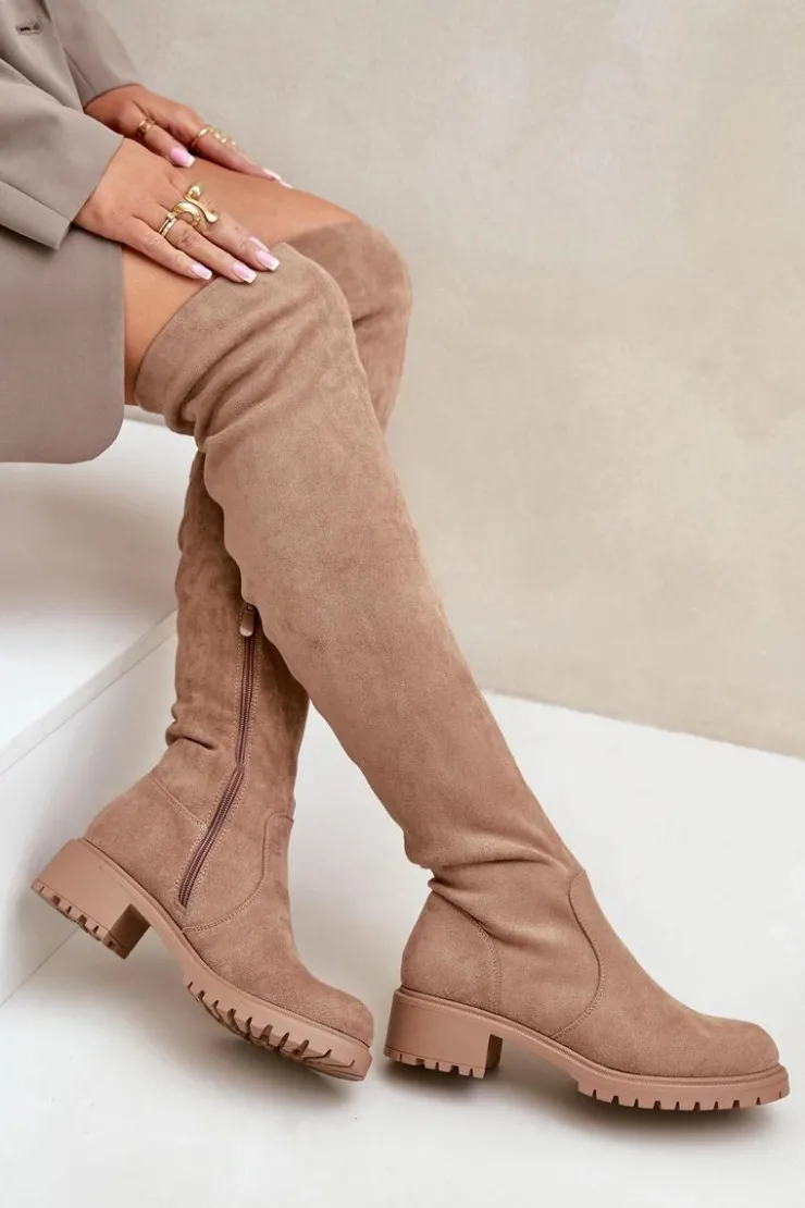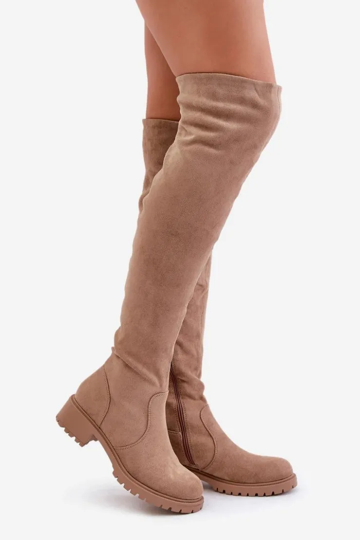 Damskie kozaki z cholewką sięgającą za kolano. Wykonane z ekologicznego zamszu. Osadzone na niskim obcasie. Model wsuwany z dodatkowym zapięciem na suwak. Noski są zaokrąglone. Wnętrze częściowo ocieplane kocem obuwniczym. Idealnie pasują do krótkich spódniczek lub sukienek. Kozaki te koniecznie powinny znaleźć się w Twojej zimowej kolekcji obuwia! Przy wyborze rozmiaru prosimy sugerować się tabelą rozmiarów.